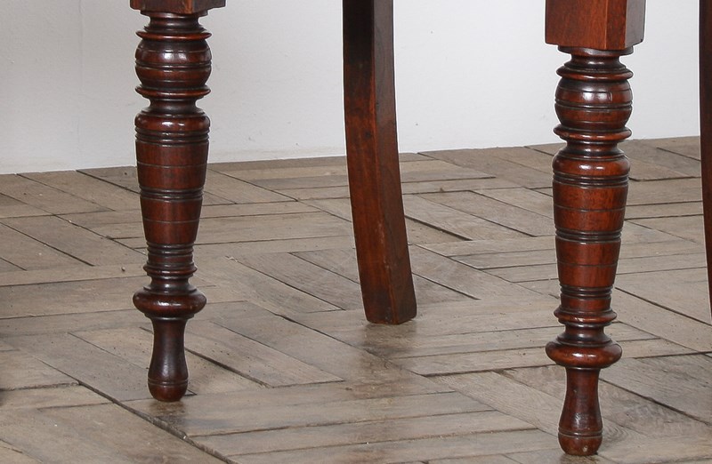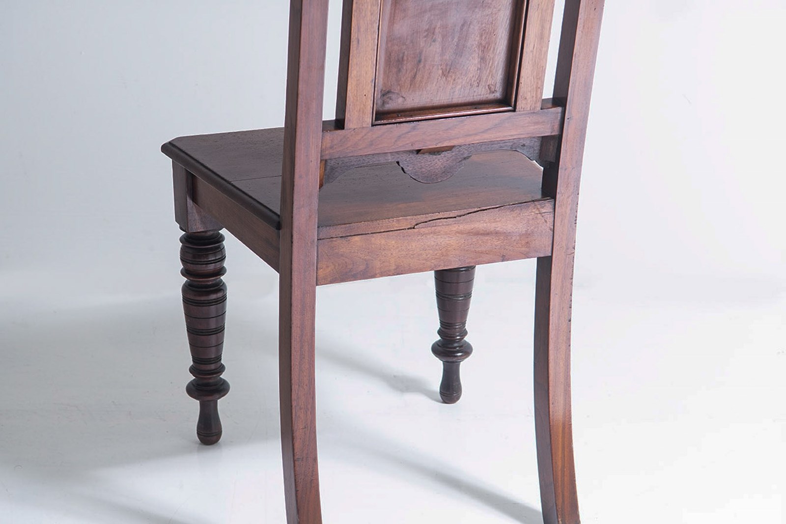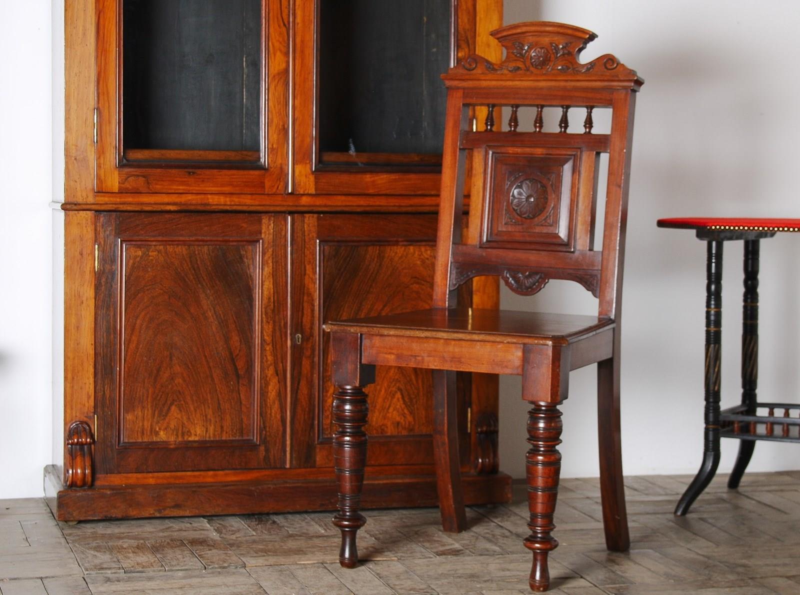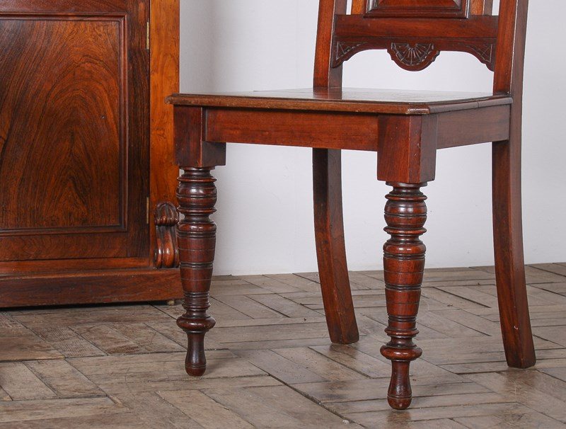 A beautifully crafted Aesthetic Hall Chair, carved foliage and scroll detailing with arched top. Lovely turned front legs with the most superb narrow bobbin front feet. Solid mahogany, in a rich deep colour with lovely wear. A small historic repair can be seen on the back of the seat as photographed. The chair is sturdy and in very good condition. Irish, Circa 1890 Seat Height 43.5cm / 17″