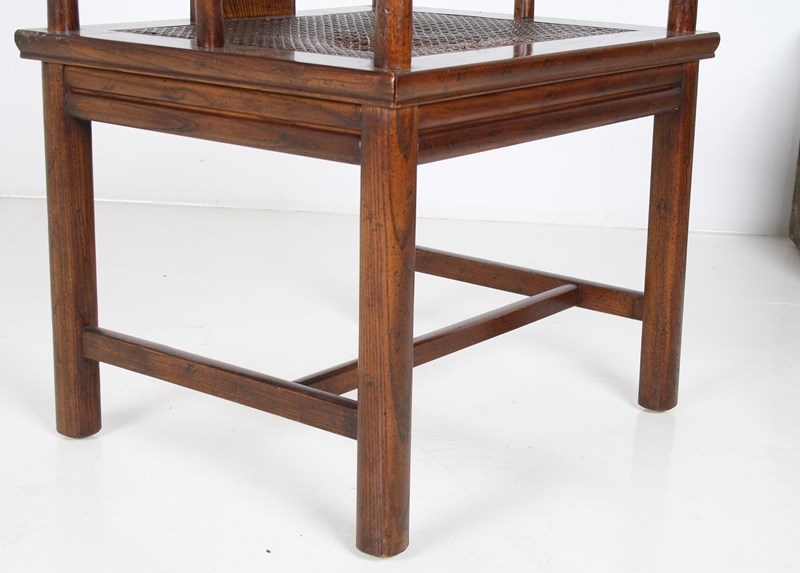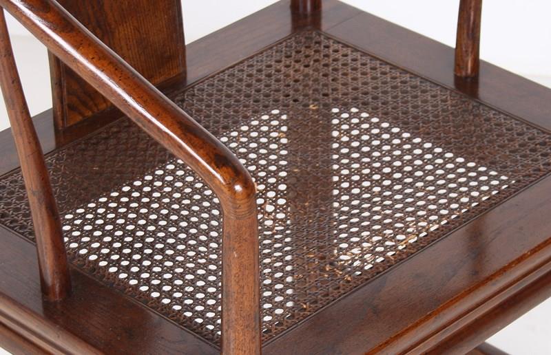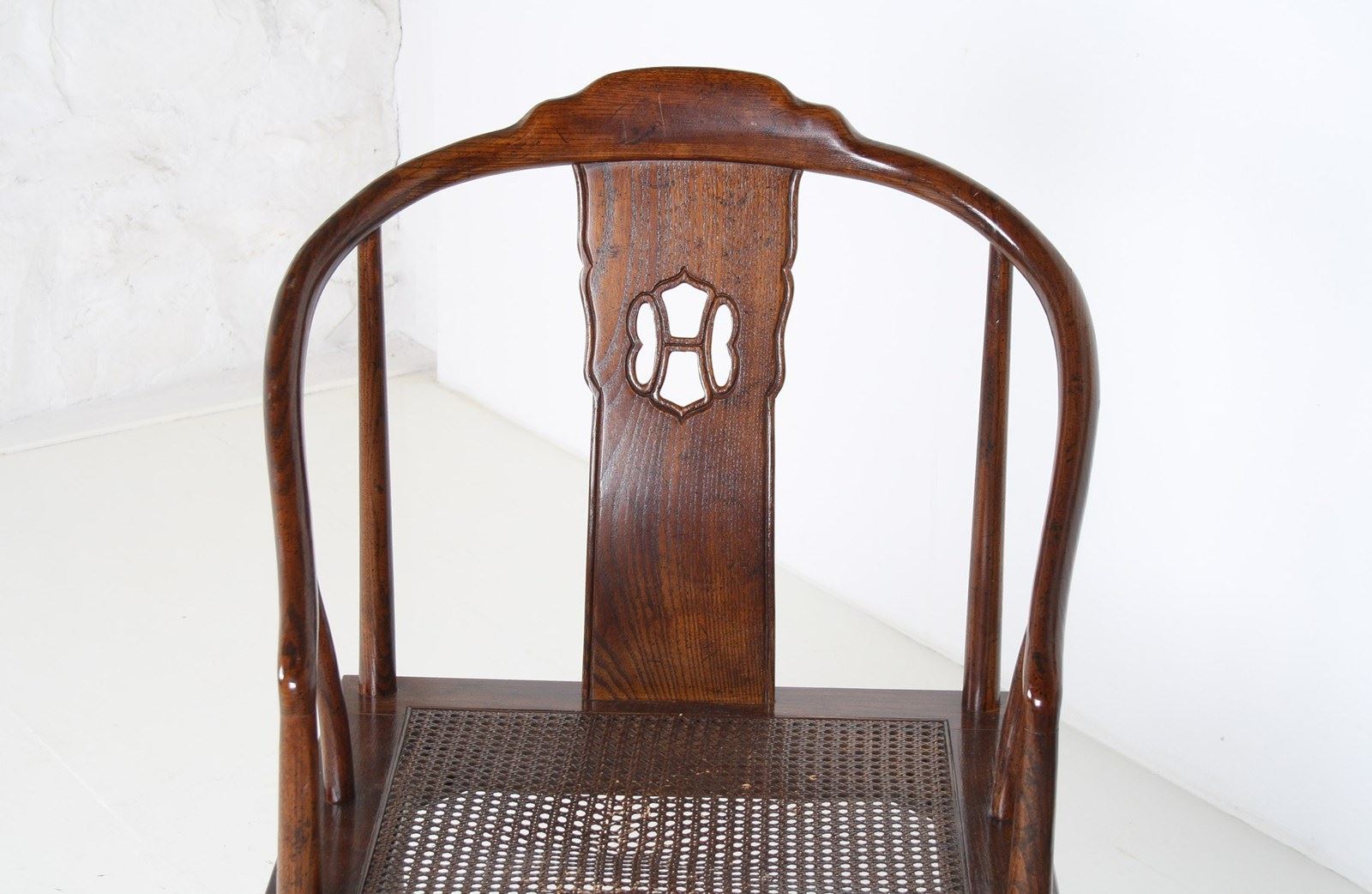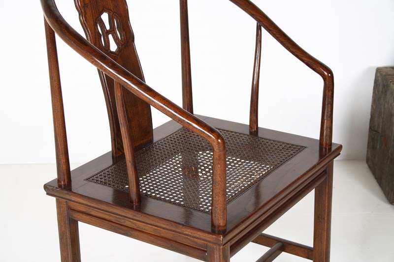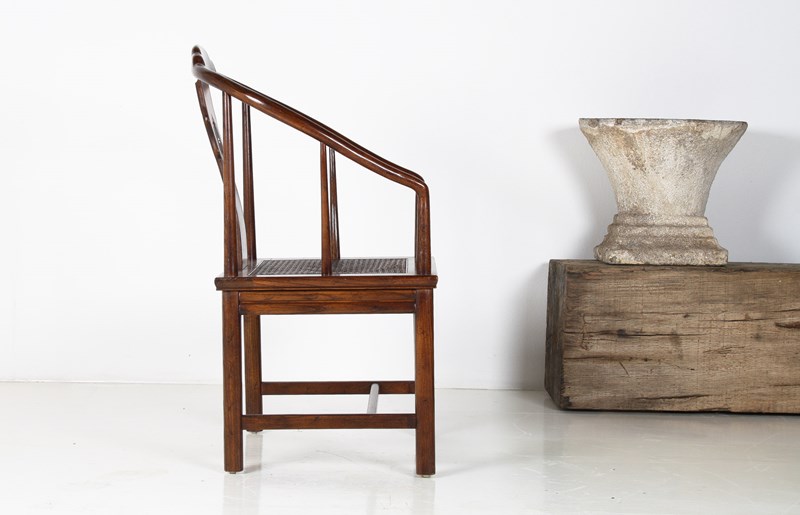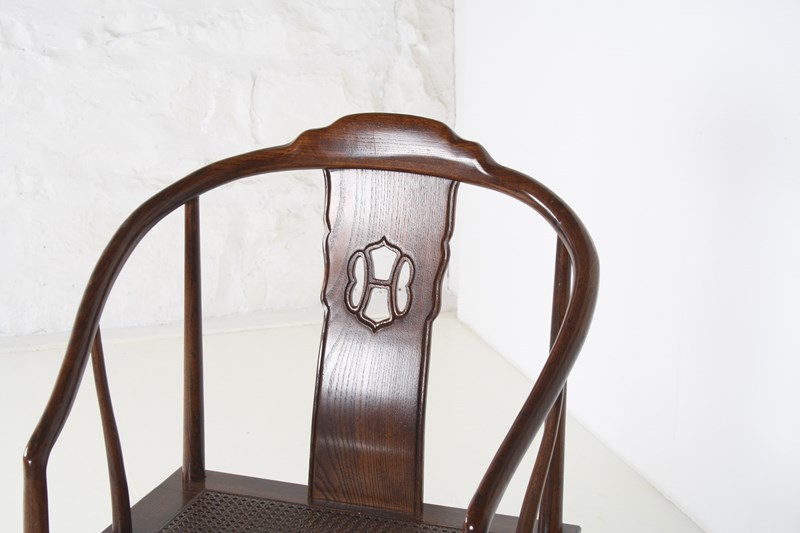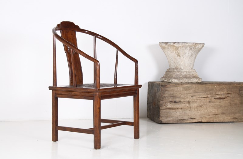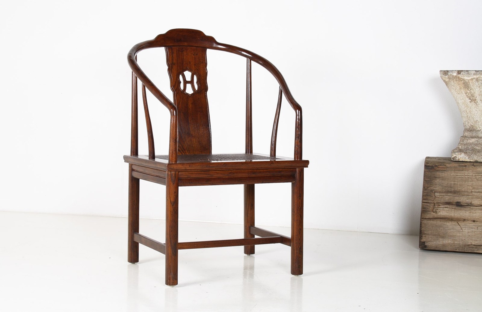 An early 20th Century Chinese Horseshoe Chair of late Qing / early Republic Era. Superb form with horseshoe back and sweeping arms, single vertical slat carved backrest with roundel, a cane rectangular seat above a shaped apron and four round shaped legs joined by stretchers. A beautiful dark and rich coloured Hongmu with a wonderful lustre.