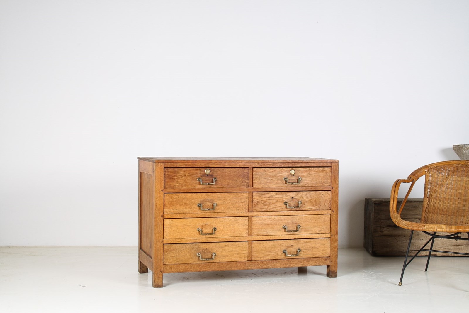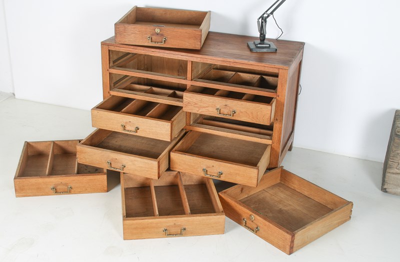 Equipped with eight drawers, each featuring various compartments for organised storage. Adorned with original decorative hardware.