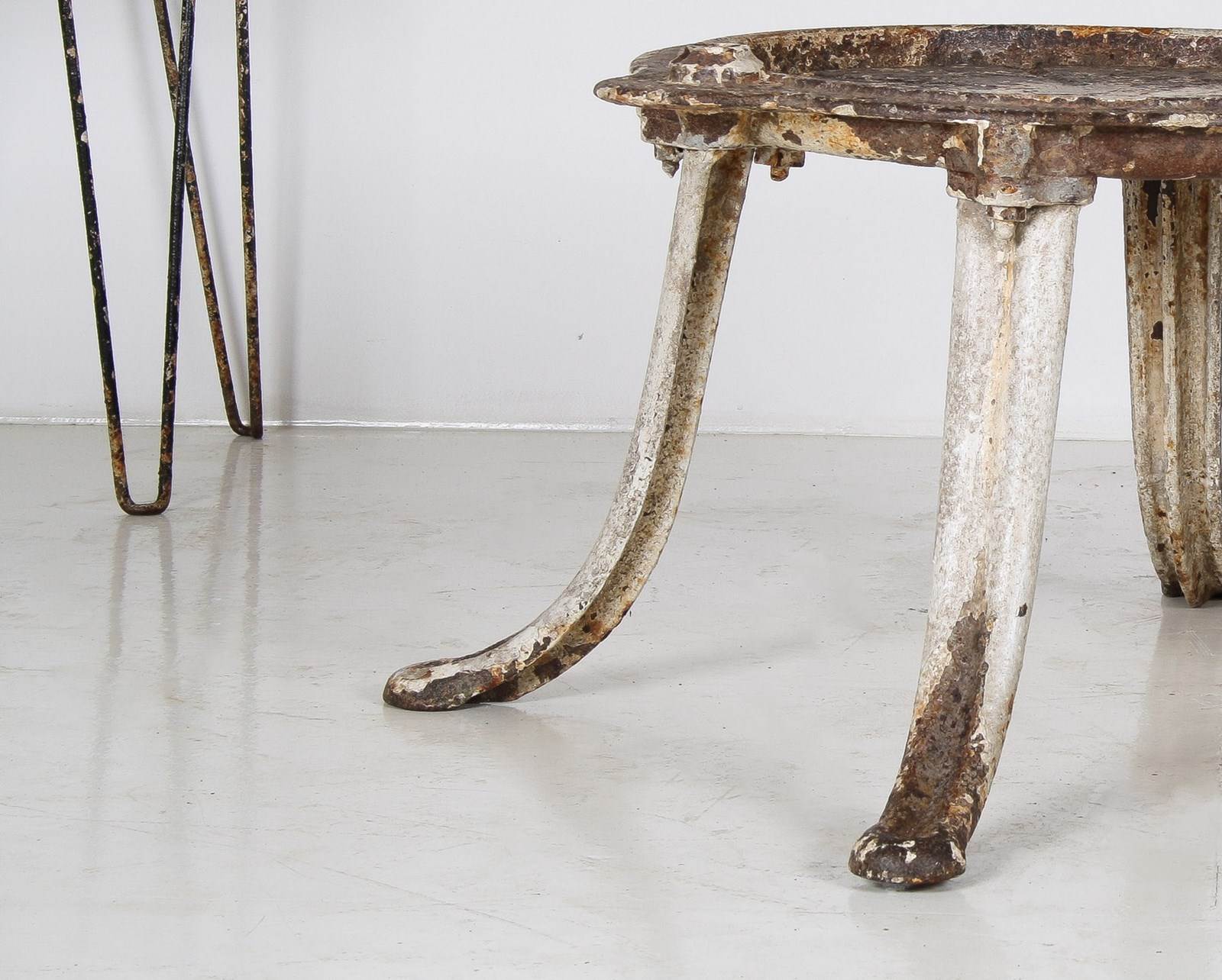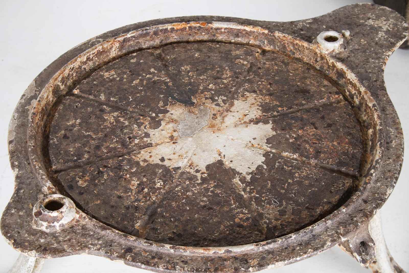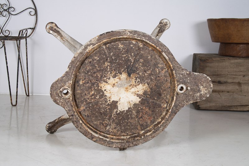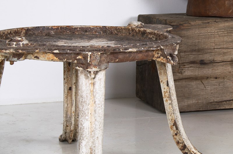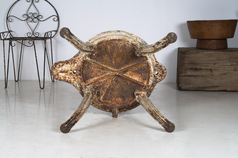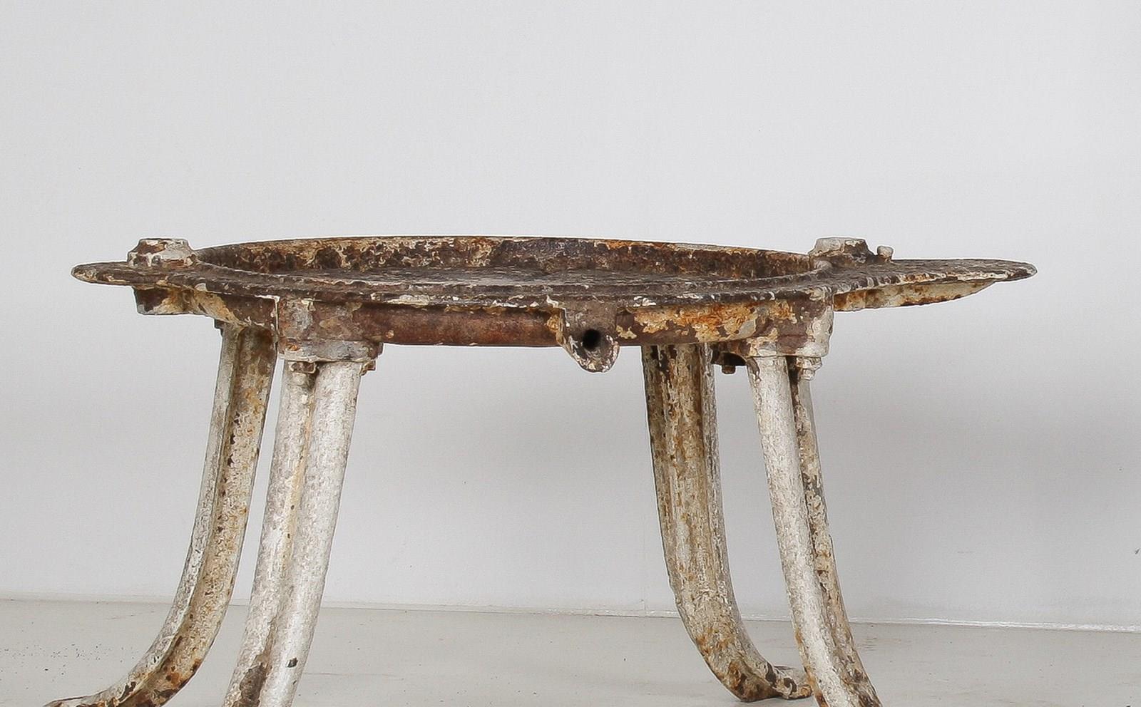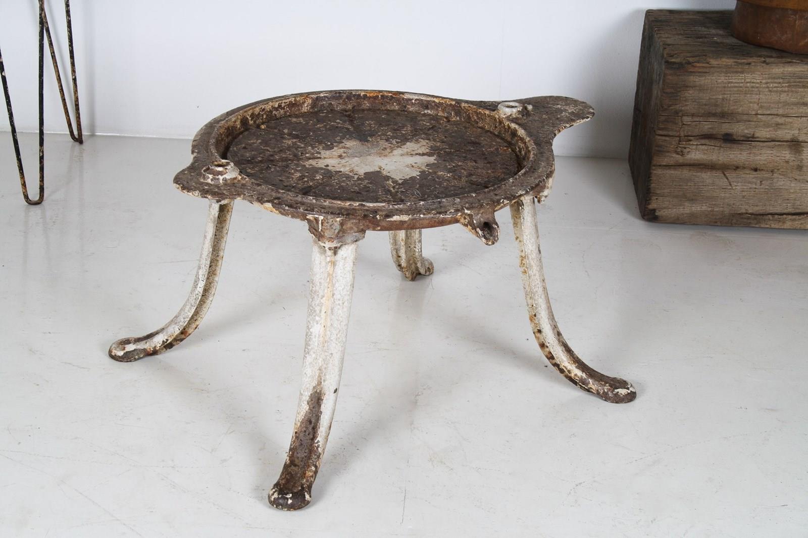 An unusual cast iron cheese press table, extremely well built with heavy splayed legs and a grooved top with drain hole. A wonderful interior decor or garden piece.