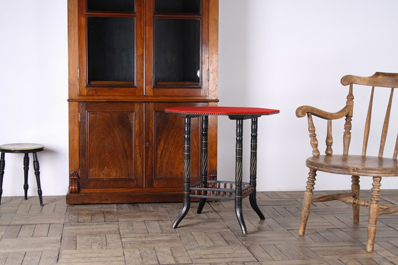 The table showcases a striking octagonal top, newly and professionally upholstered in rich red baize, creating a vibrant focal point. The beautifully turned legs lead down to a gallery shelf, providing both functionality and style. One of the standout features of this table is its wonderful sculptured splayed footing, which adds an artistic flair and enhances its visual appeal.