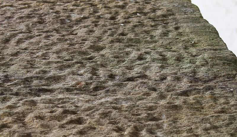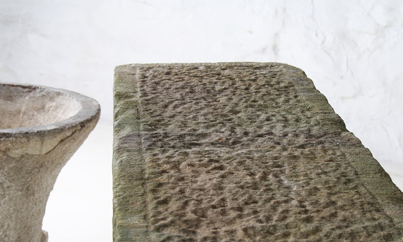 The large sandstone flag sits on two short pillars which feature the original Stonemason’s chisel marks that shaped these over a 160 years ago. The sandstone is naturally weathered to a lovey patina and would fit into an established garden or provide age to a newly formed garden.
