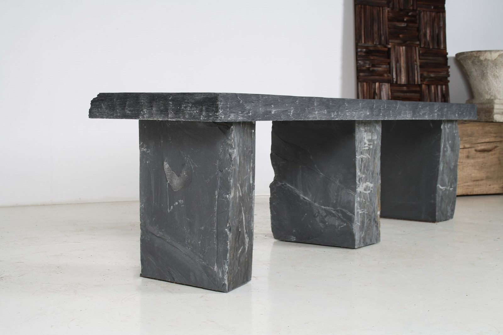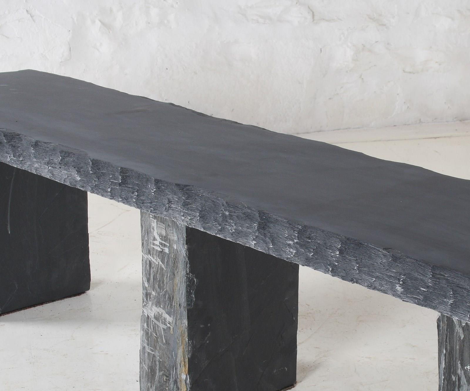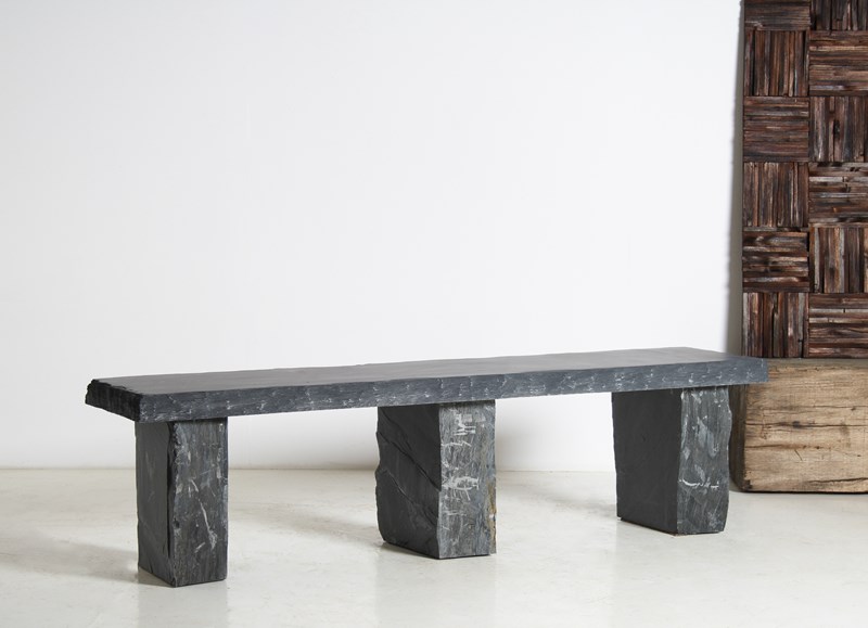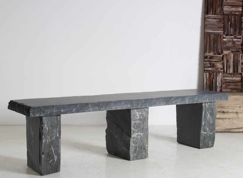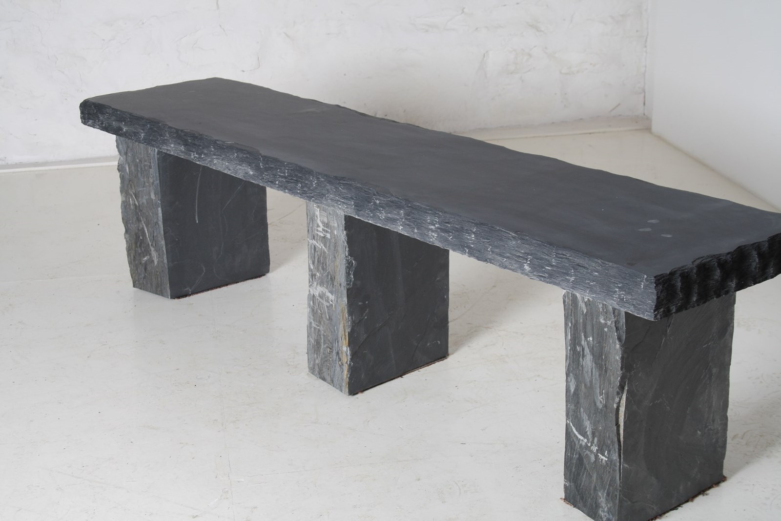Made up of four components—three bolster (plinth) legs and a single slate slab—this bench is not only functional but also an artistic statement. The three bolster legs provide a rugged yet stable foundation, echoing the dramatic landscapes from which the slate was formed millions of years ago.