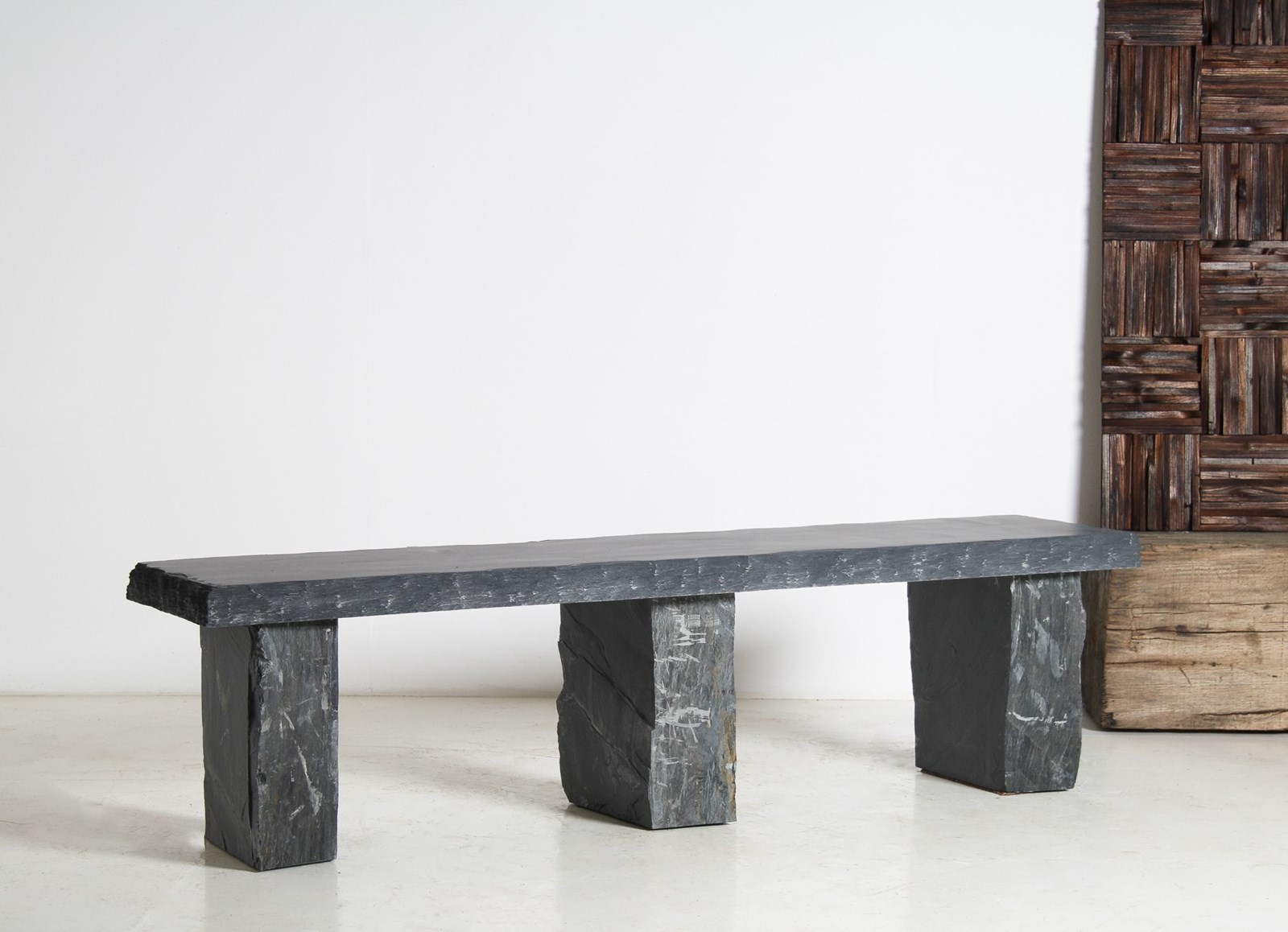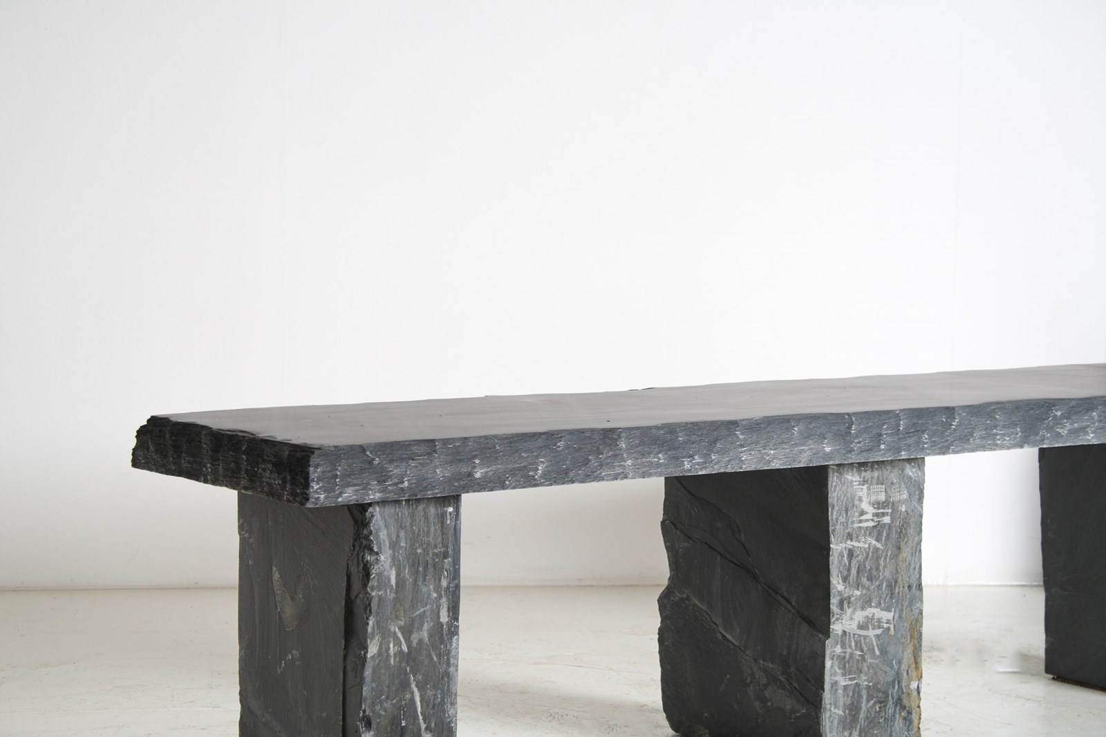 The unique texture of the slate creates a rugged, tactile quality that beautifully complements minimalist design, evoking a sense of wabi-sabi—the Japanese aesthetic that celebrates the beauty in imperfection. Natural variations and subtle gradations of colour within the slate enhance the charm and individuality of each piece, ensuring that no two benches are alike.