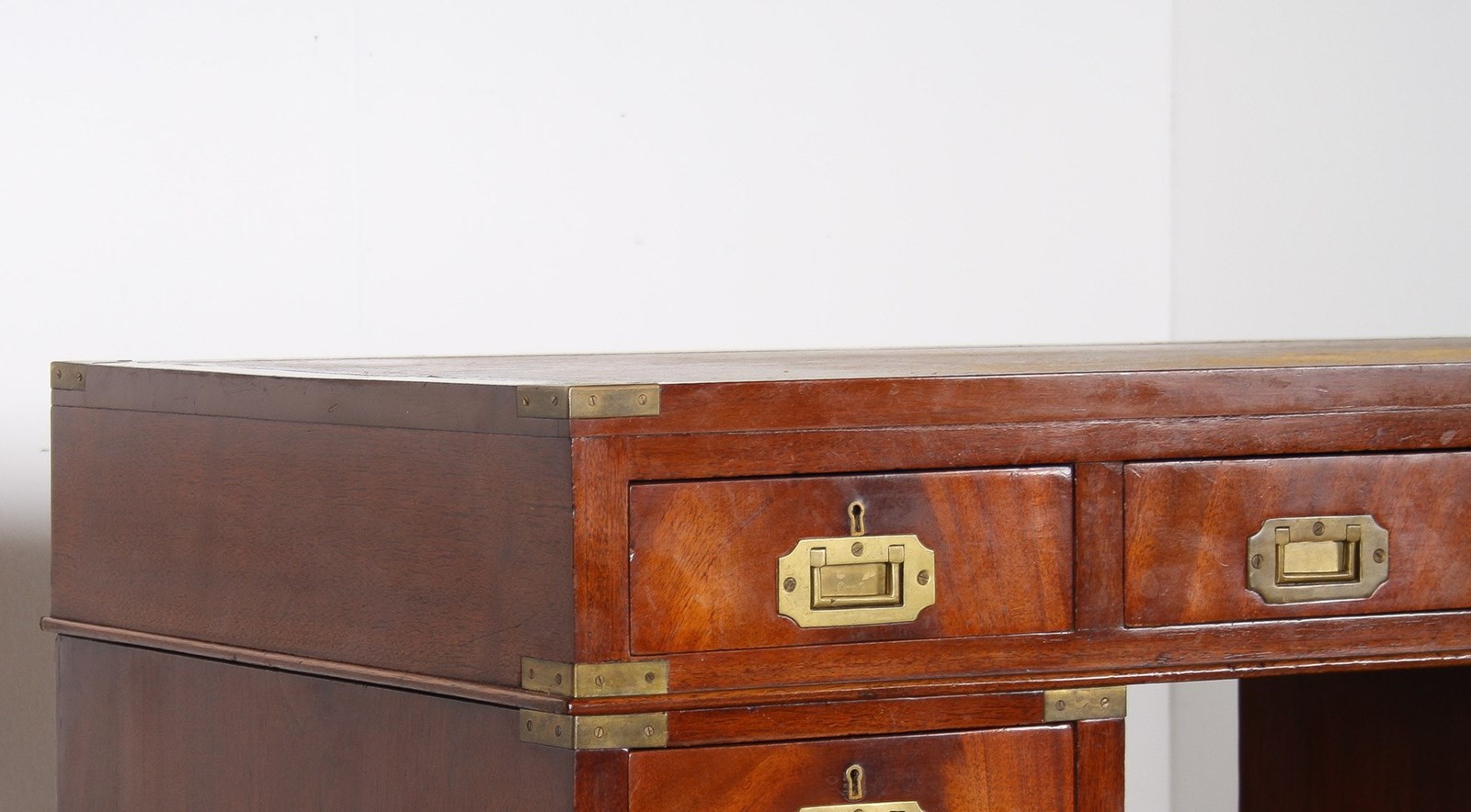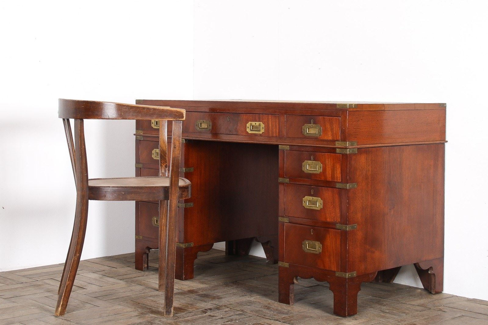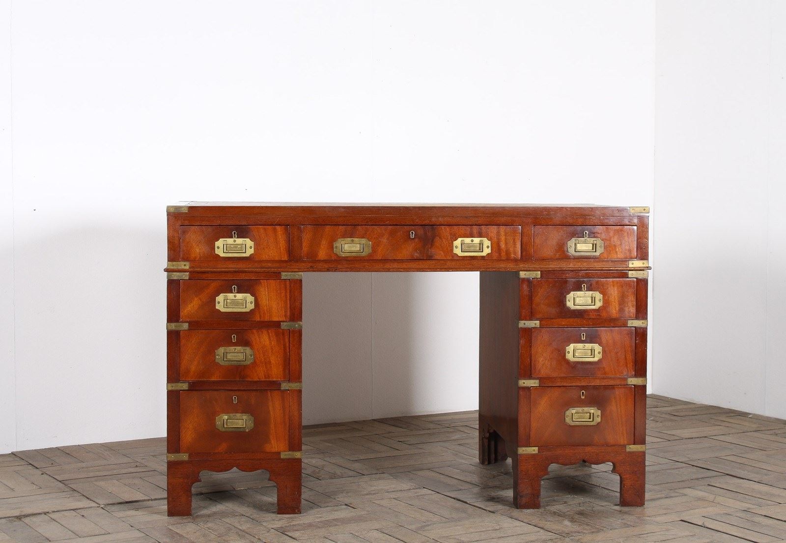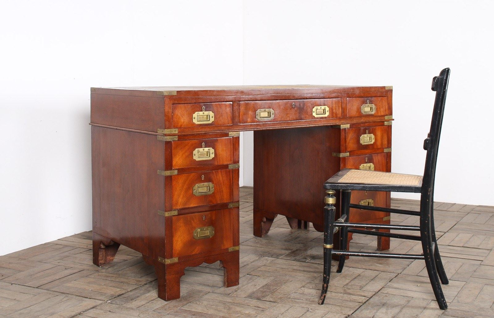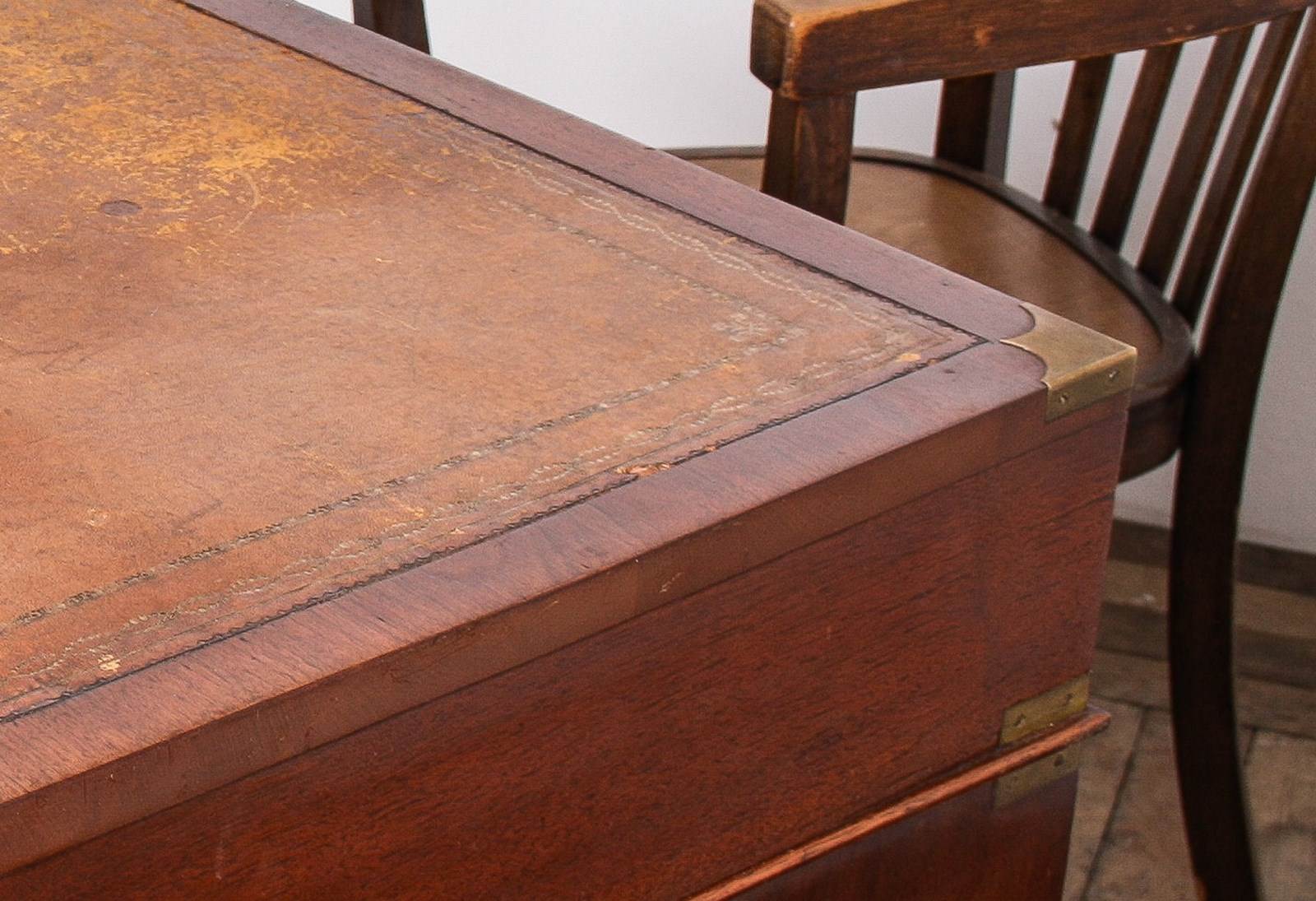 A superb original 19th-century antique British campaign desk, a perfect blend of elegance and functionality favoured by military officers during their expeditions. Crafted from rich hardwood, this desk features a polished surface that showcases the natural beauty of the wood grain, enhanced by its original leather top.