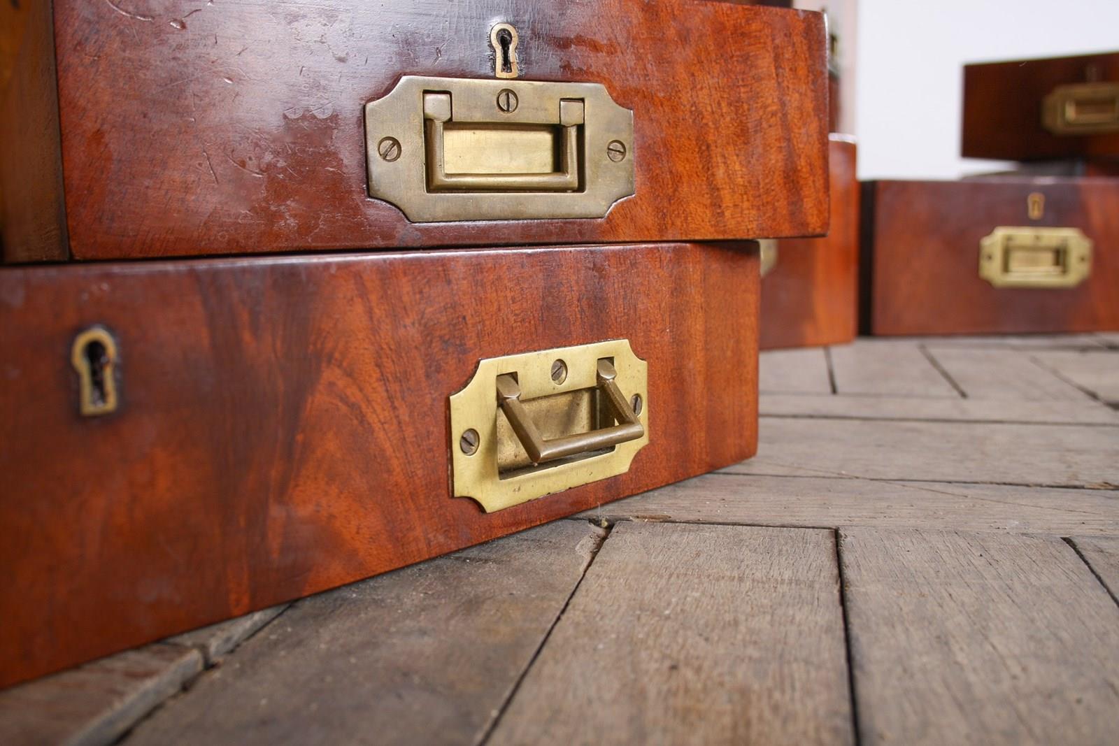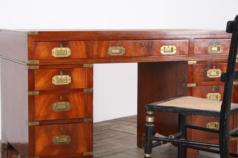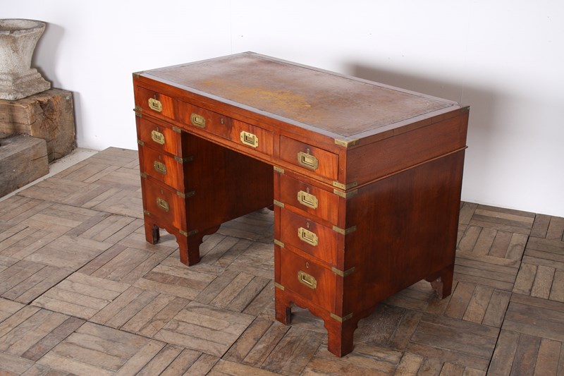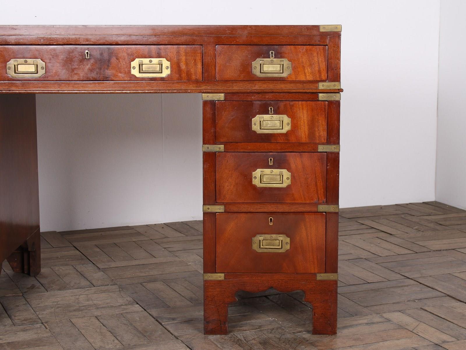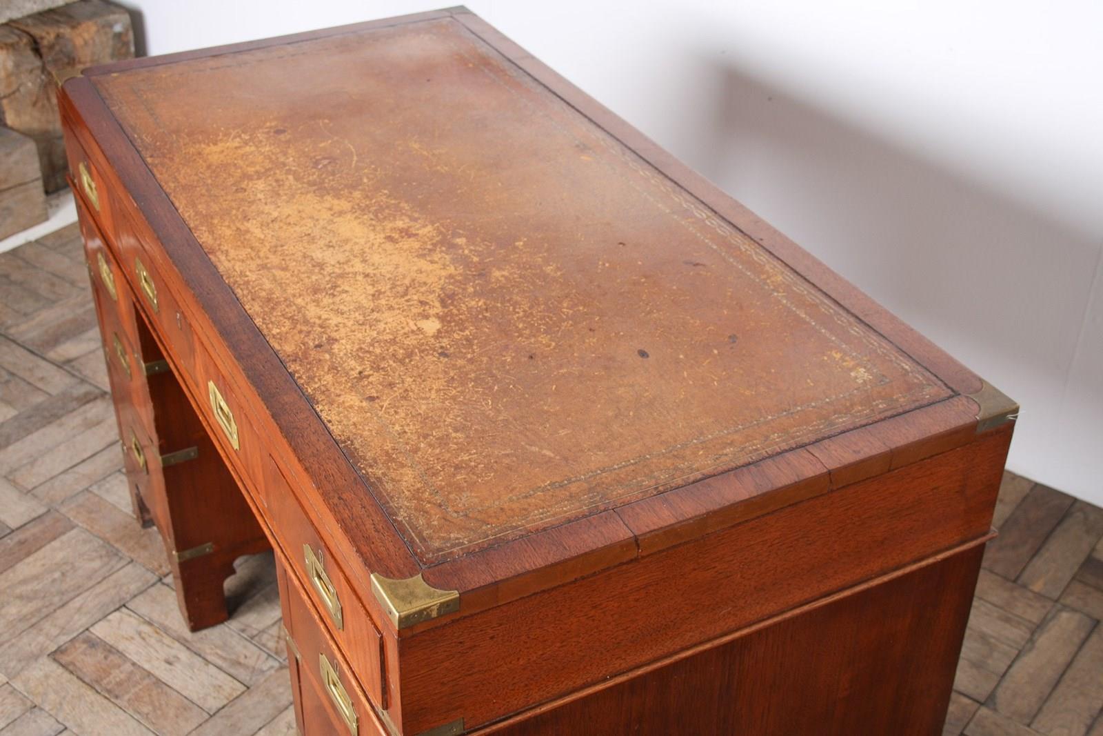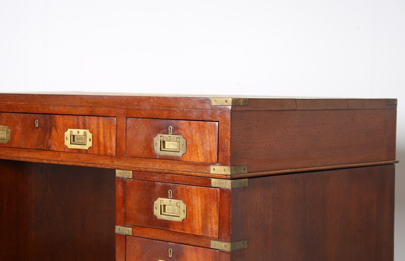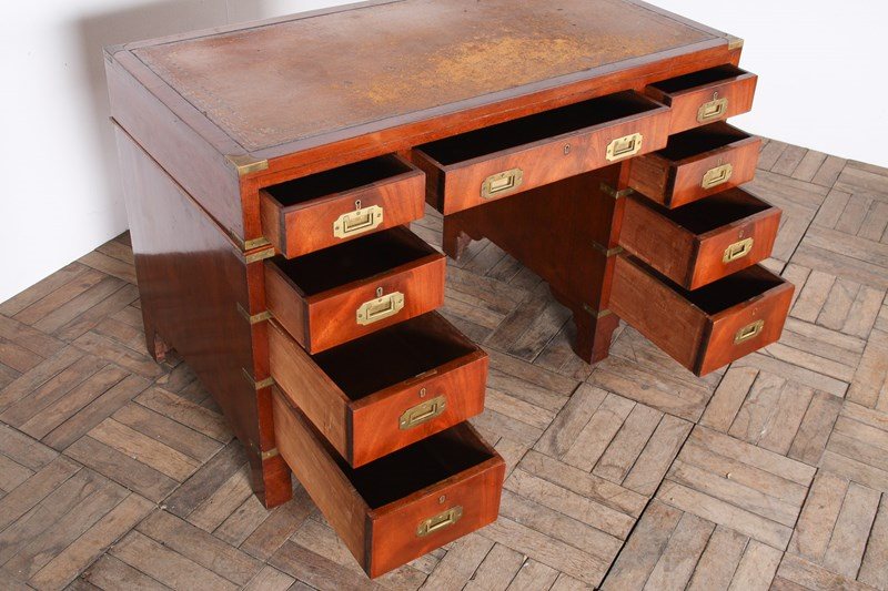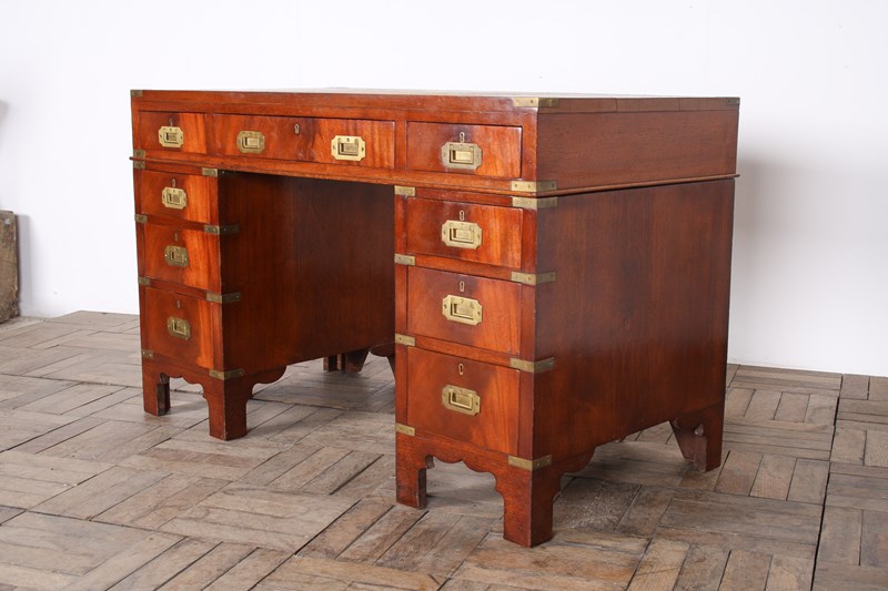 A superb original 19th-century antique British campaign desk, a perfect blend of elegance and functionality favoured by military officers during their expeditions. Crafted from rich hardwood, this desk features a polished surface that showcases the natural beauty of the wood grain, enhanced by its original leather top.