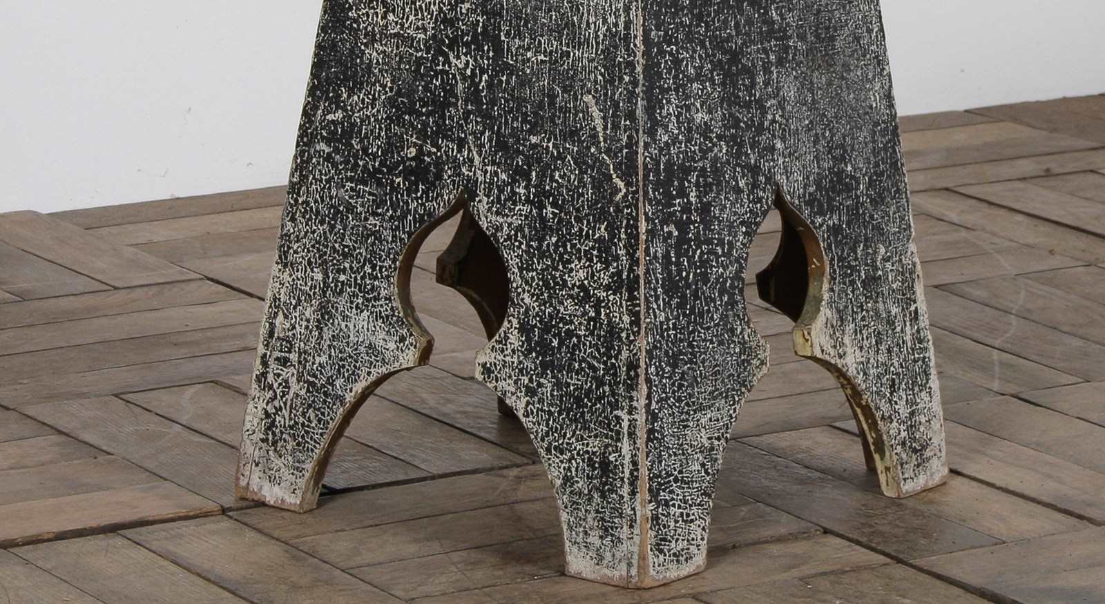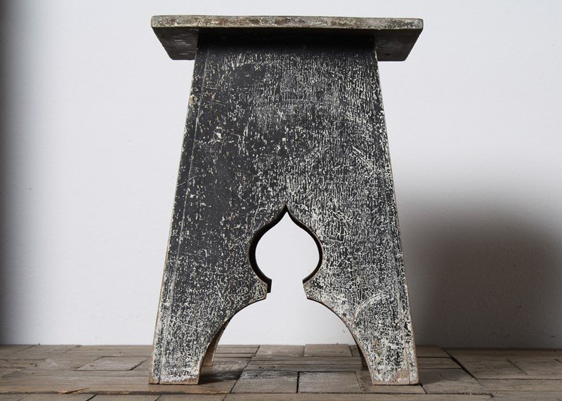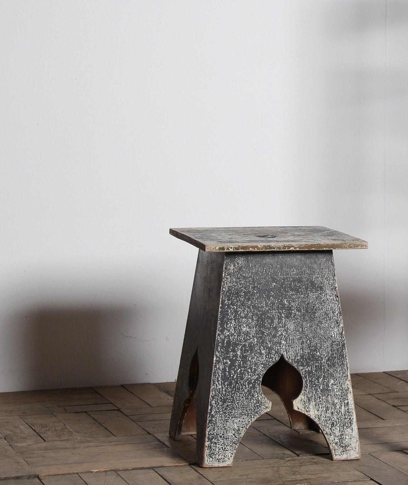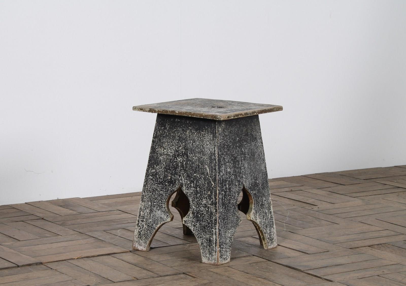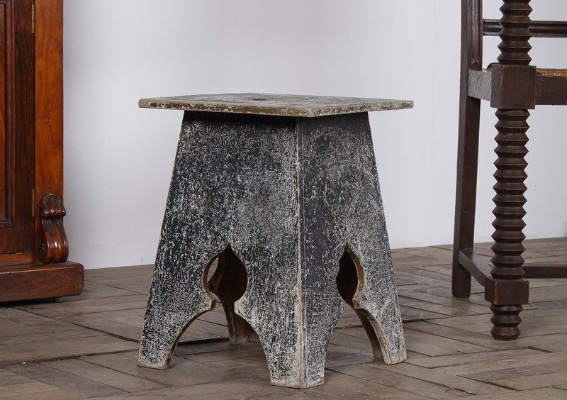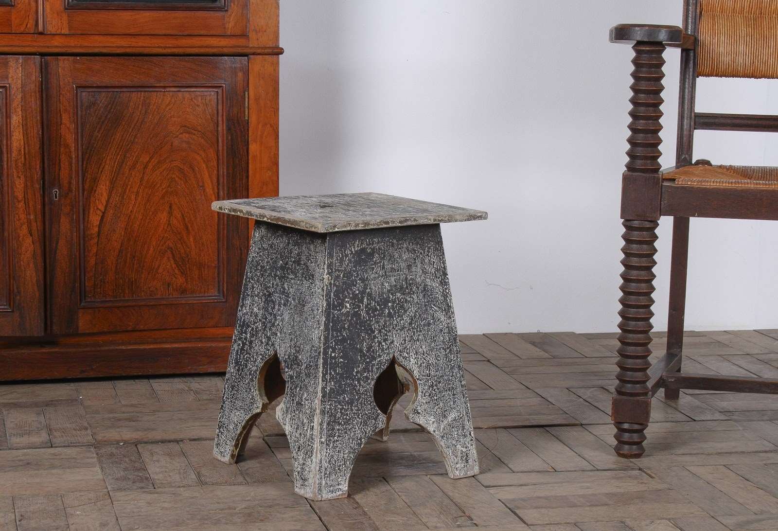 Small but perfectly formed, this simple yet striking little table features a square top with four tapered sides and a sculpted ecclesiastical-style motif. The understated design captures the essence of the Arts and Crafts movement, with the added patina that makes this one standout.