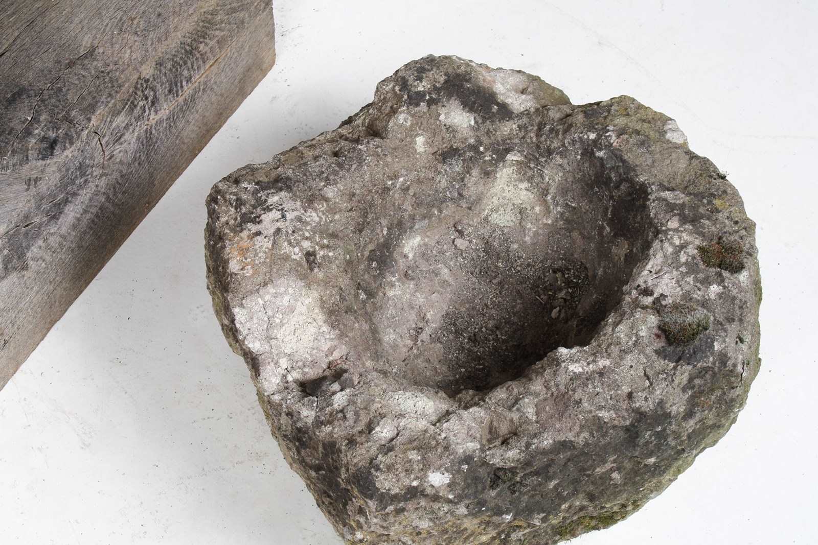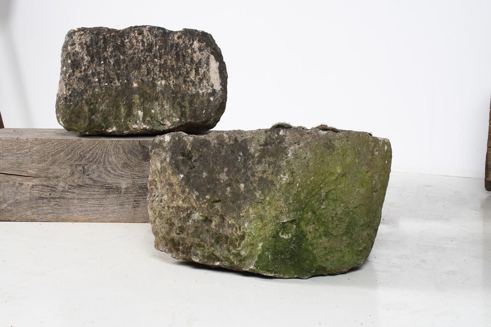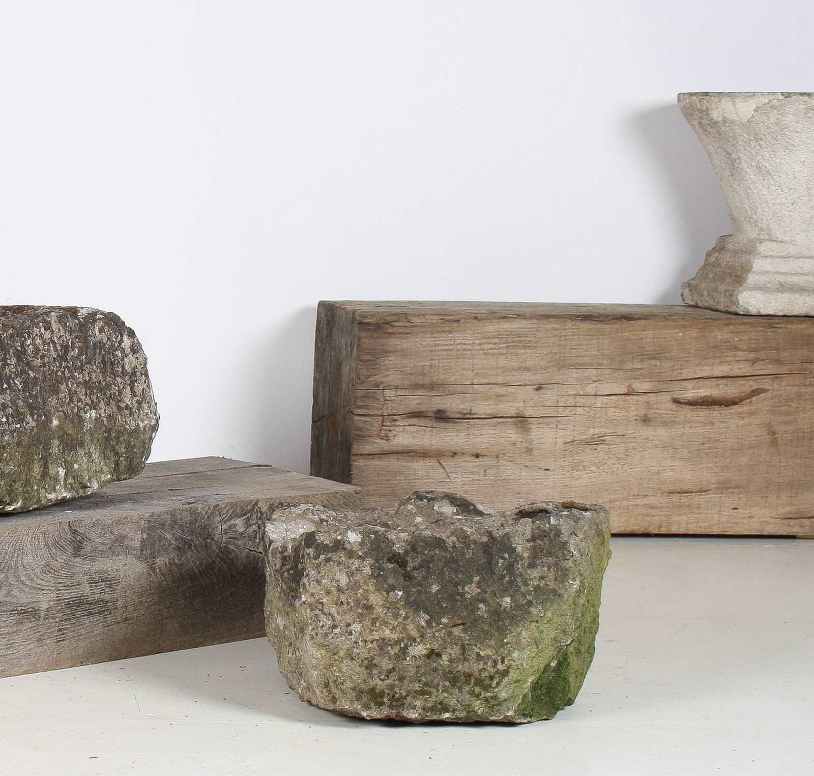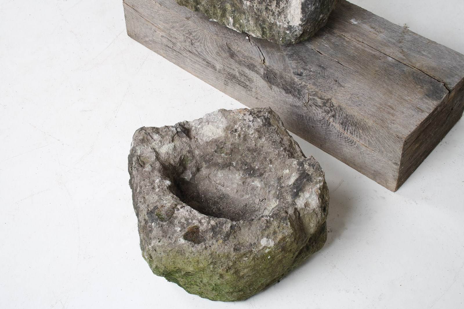 A small organic shaped carved stone planter with rustic textures and natural patina that developed over long period. Photographed as a pair but sold individually, the one on the Right listed here.
