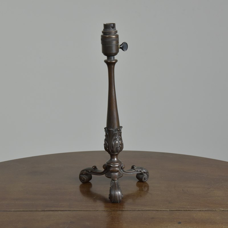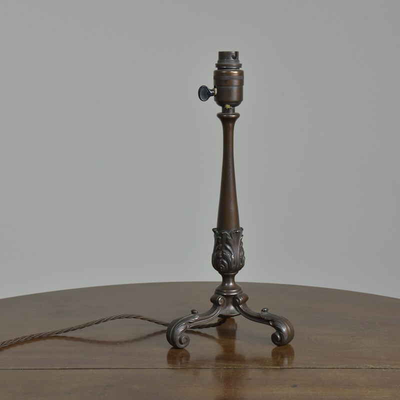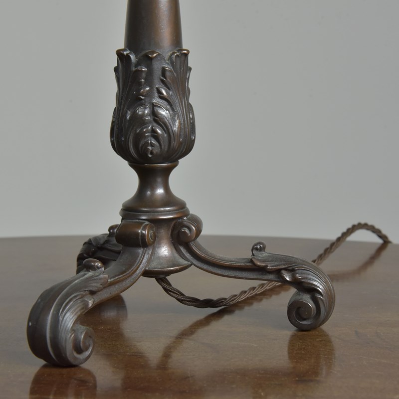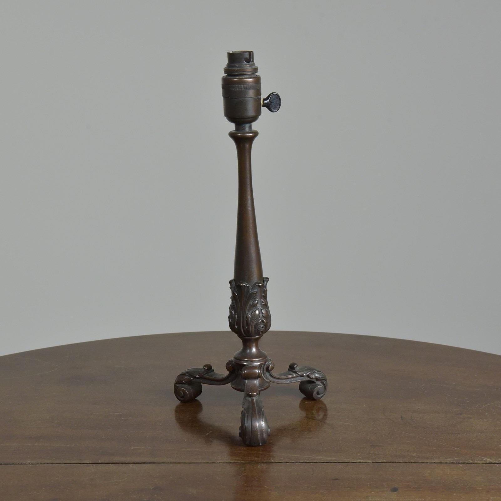 An attractive antique bronzed table lamp with scrolled tri-legged feet and crisp acanthus leaf detail. English, early 20th century.