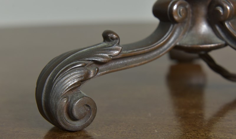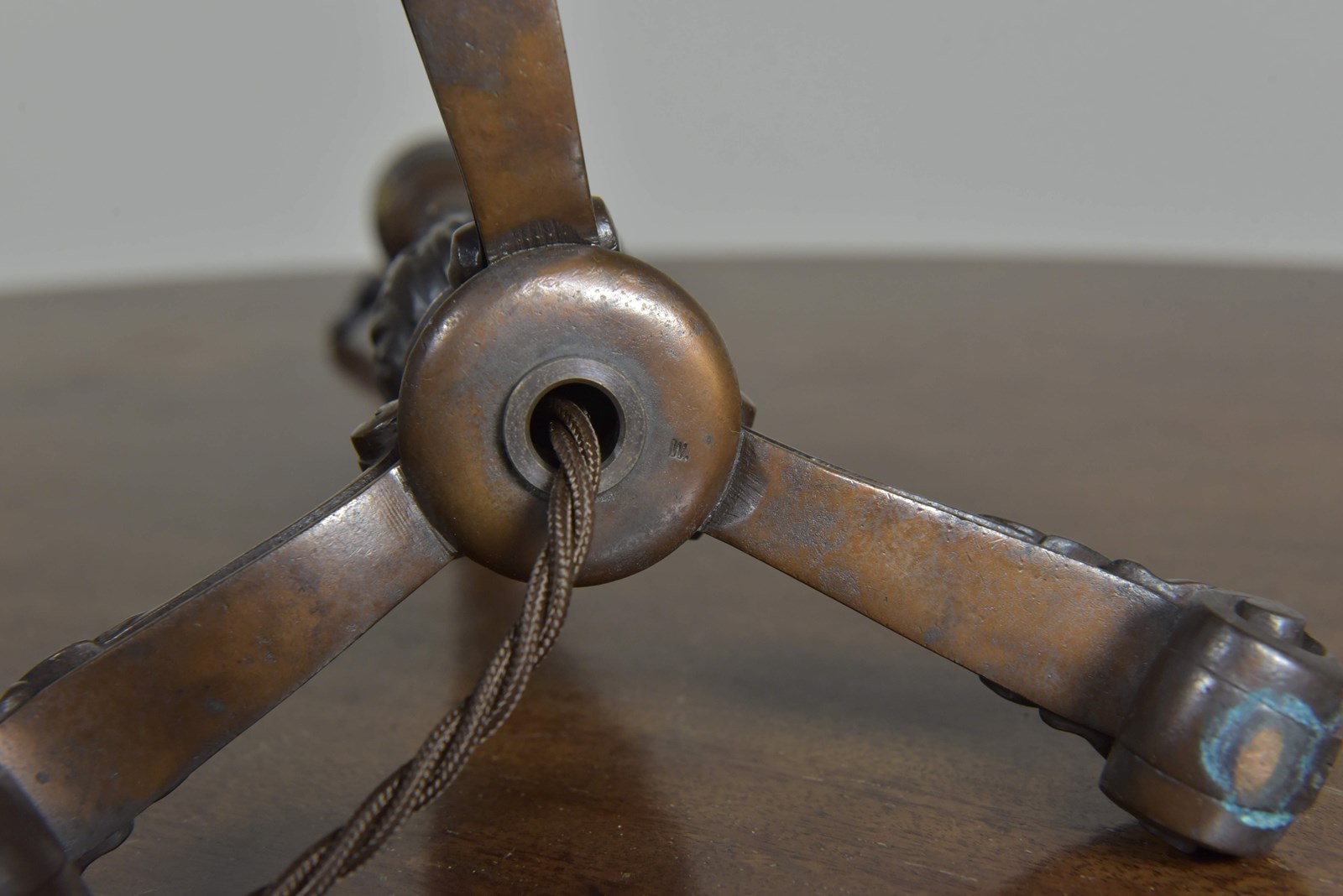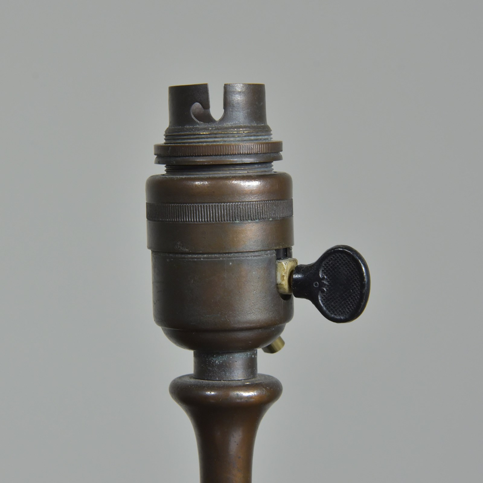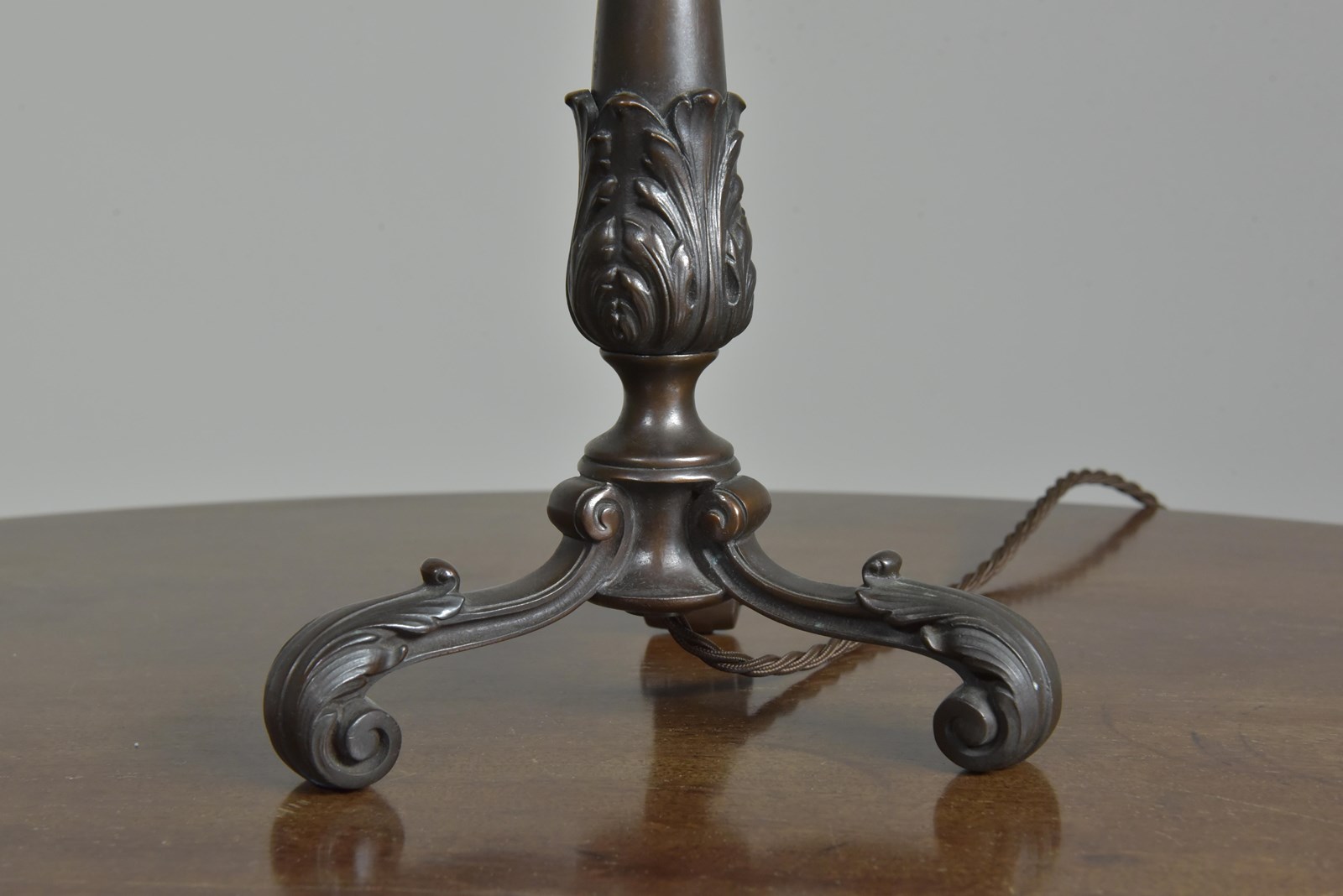An attractive antique bronzed table lamp with scrolled tri-legged feet and crisp acanthus leaf detail. English, early 20th century.