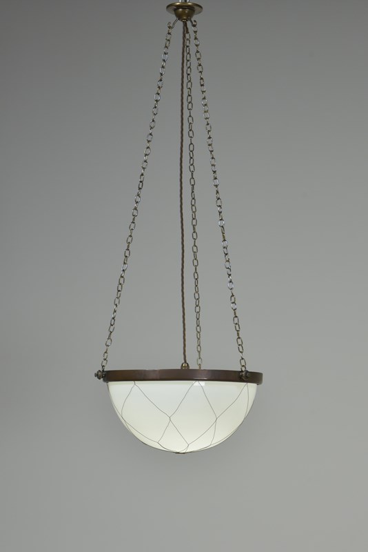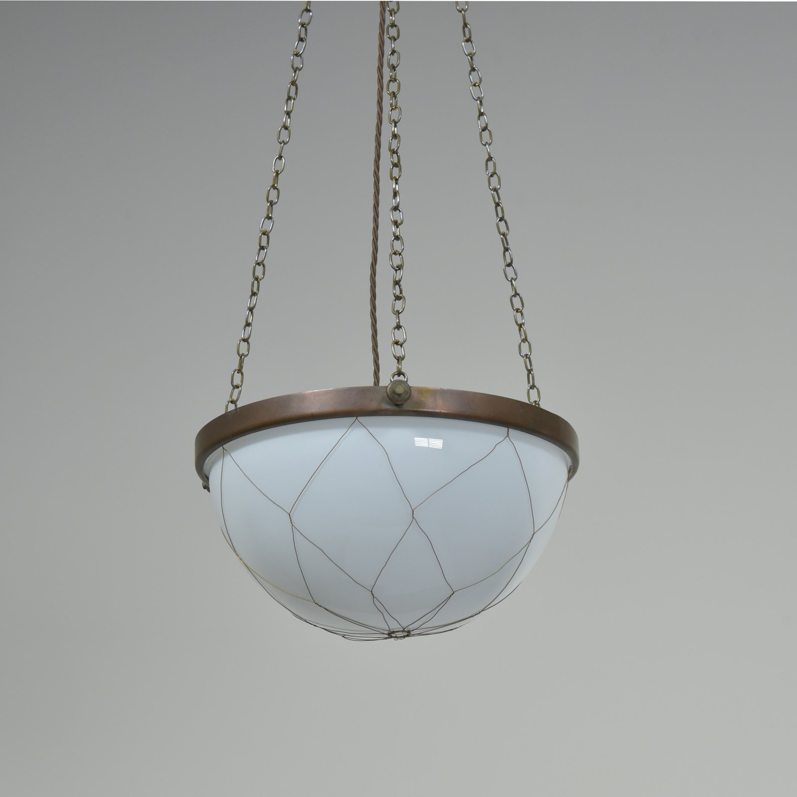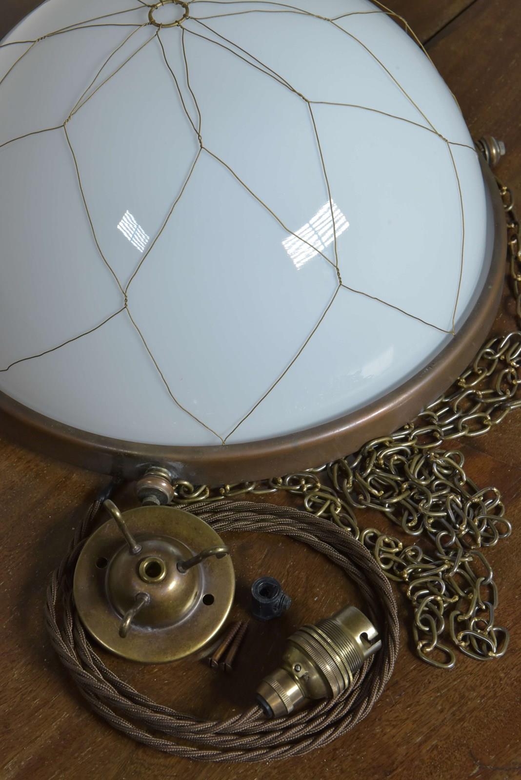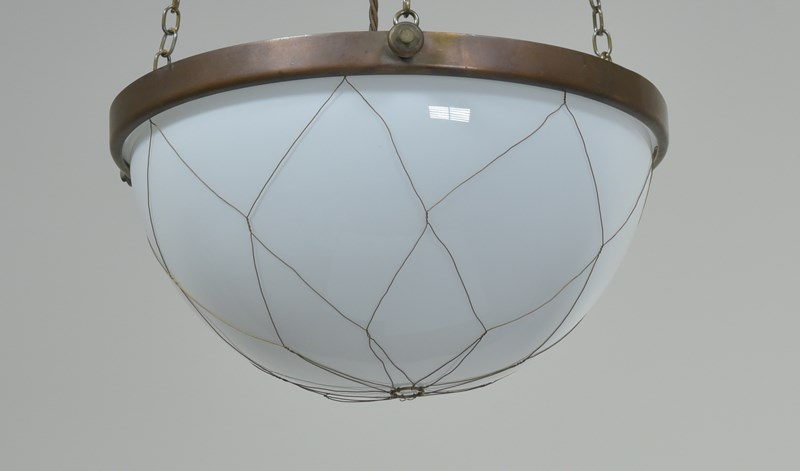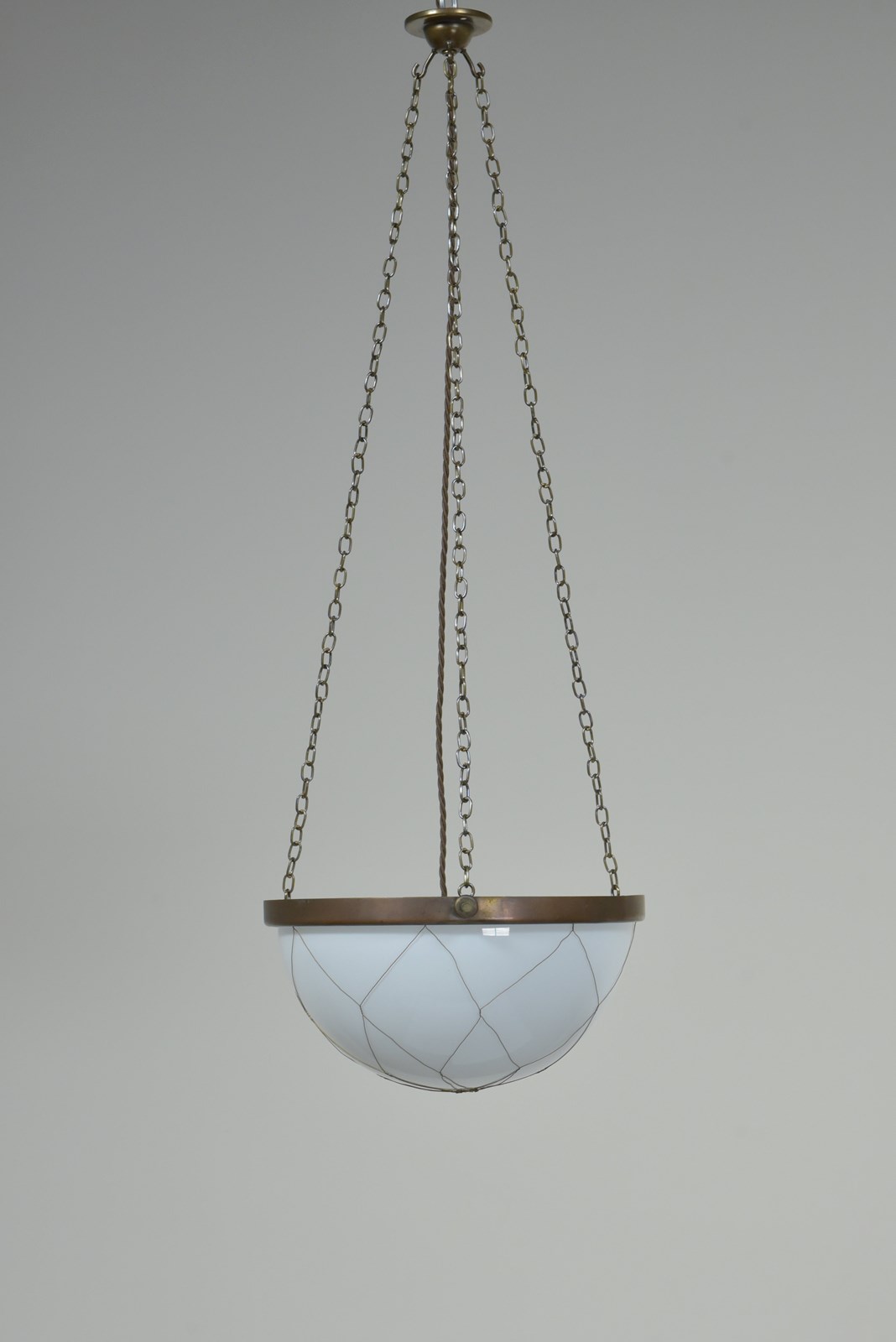 An antique hemispherical opal glass bowl shade with brass ring mount and brass "netting". English early 20th century.