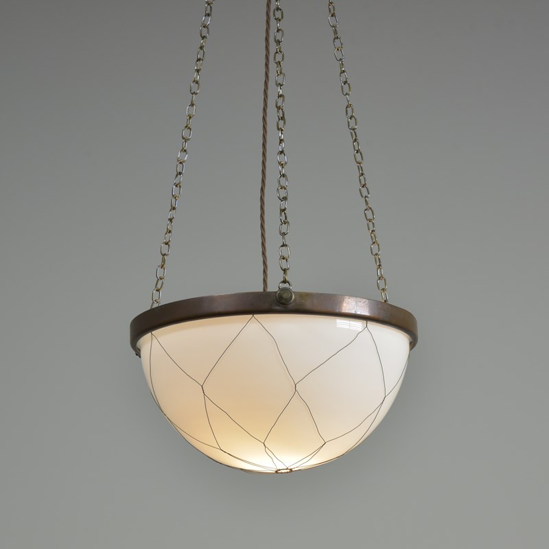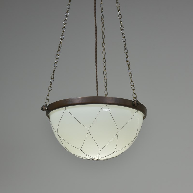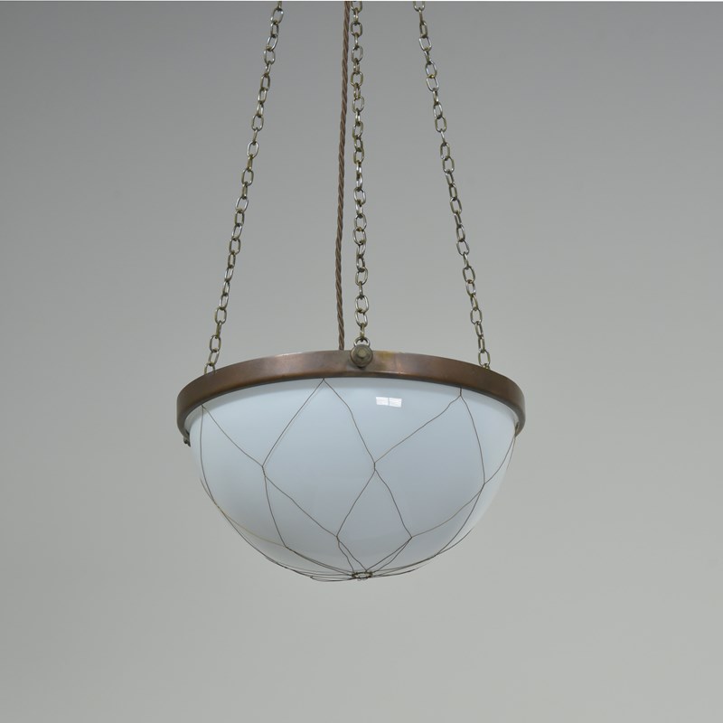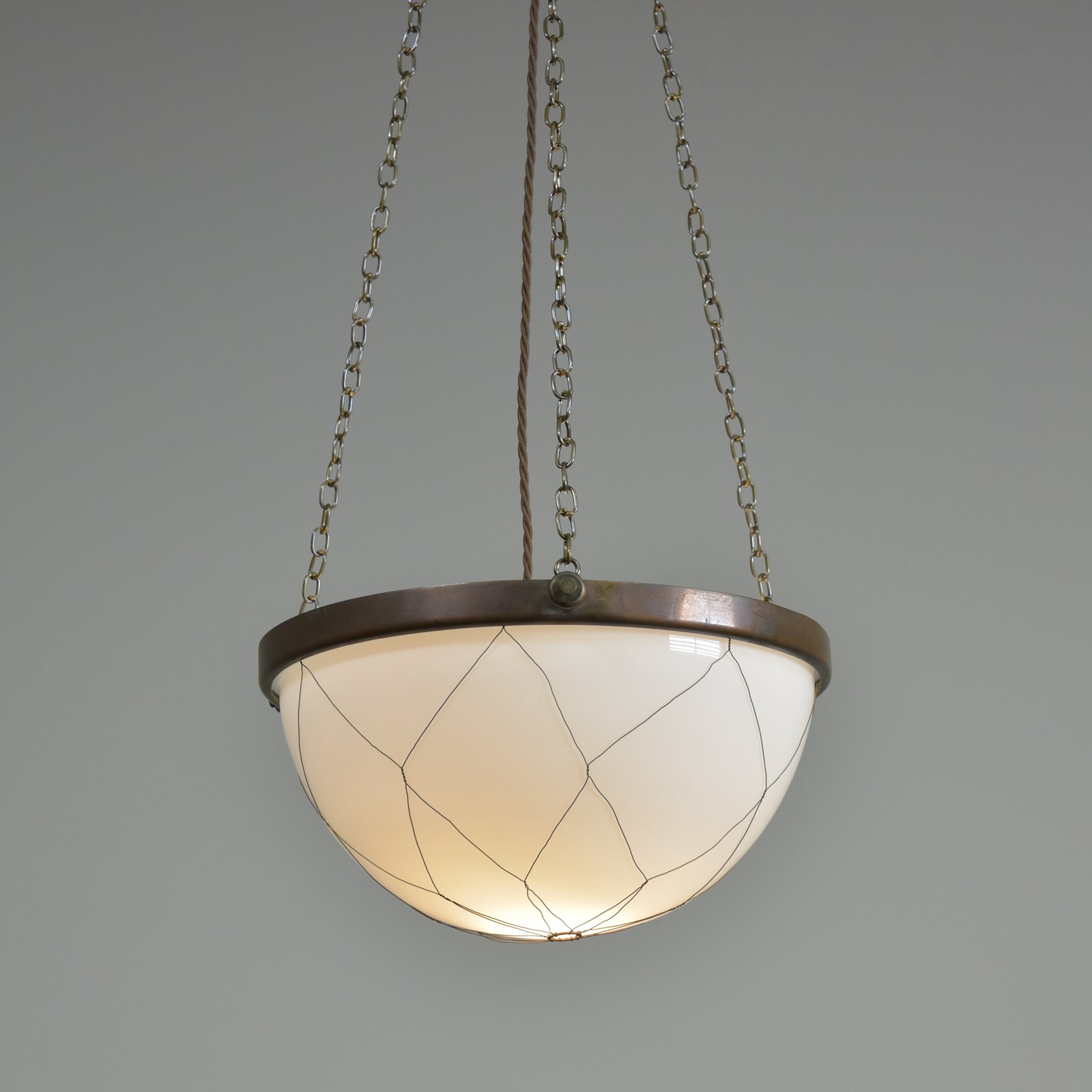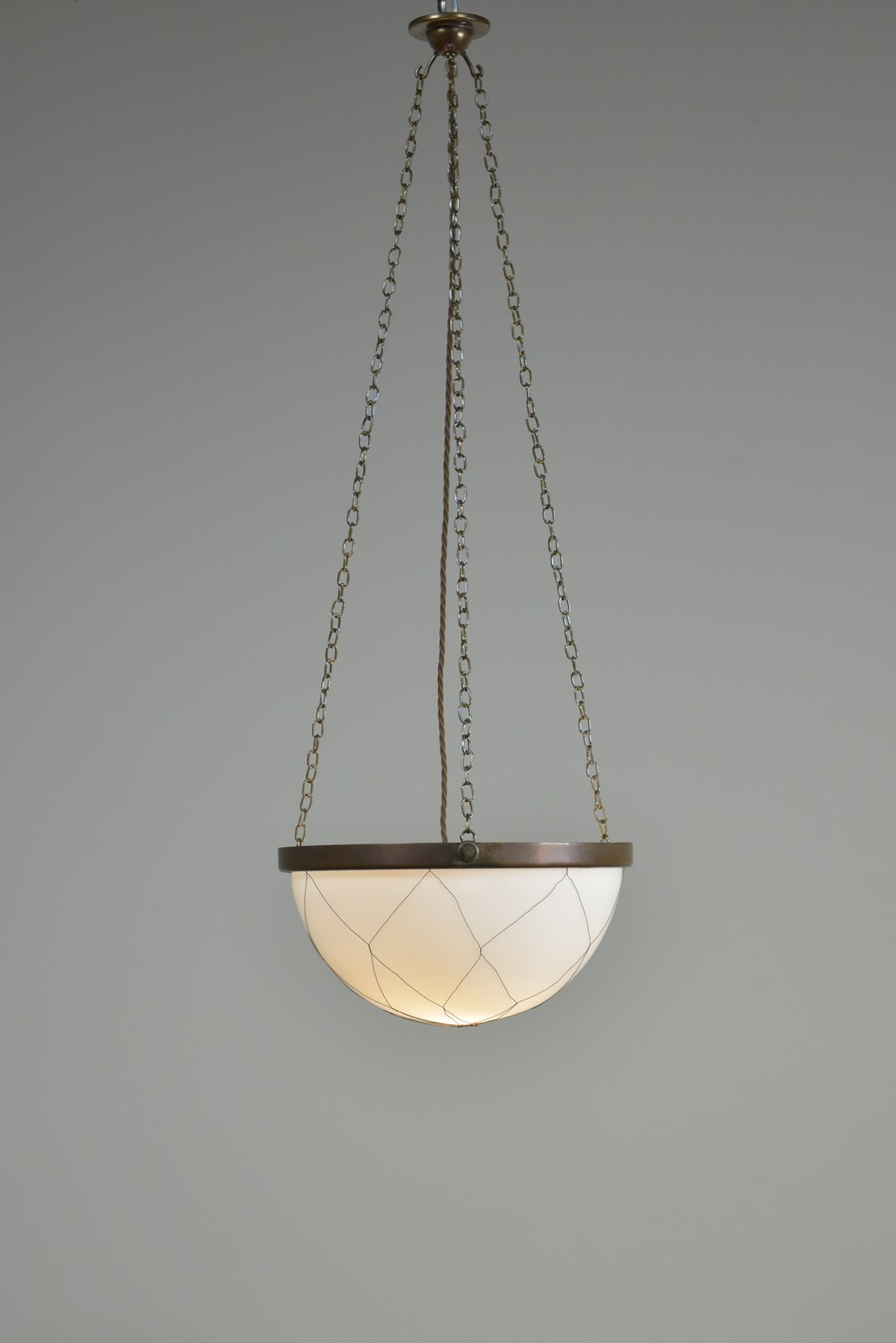An antique hemispherical opal glass bowl shade with brass ring mount and brass "netting". English early 20th century.