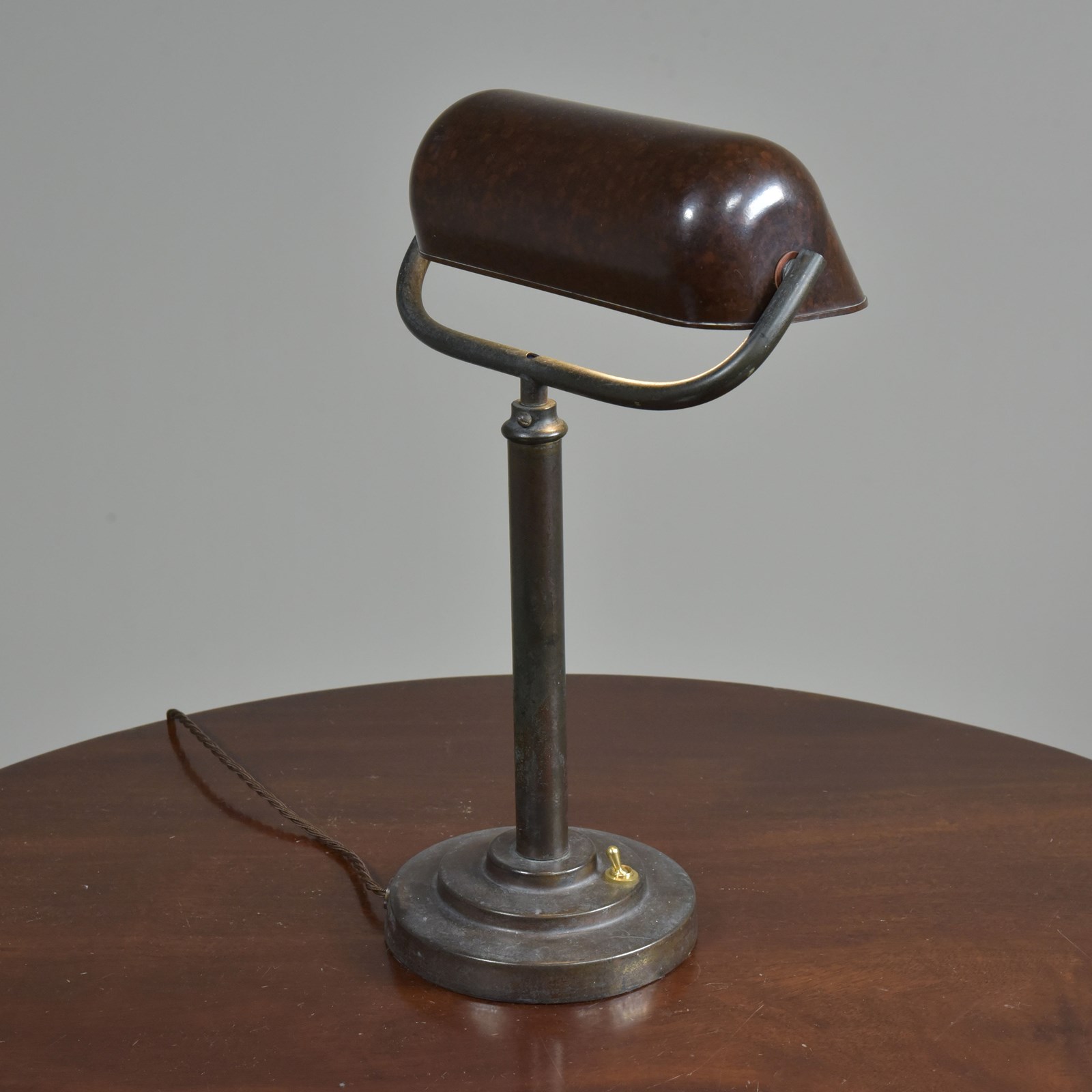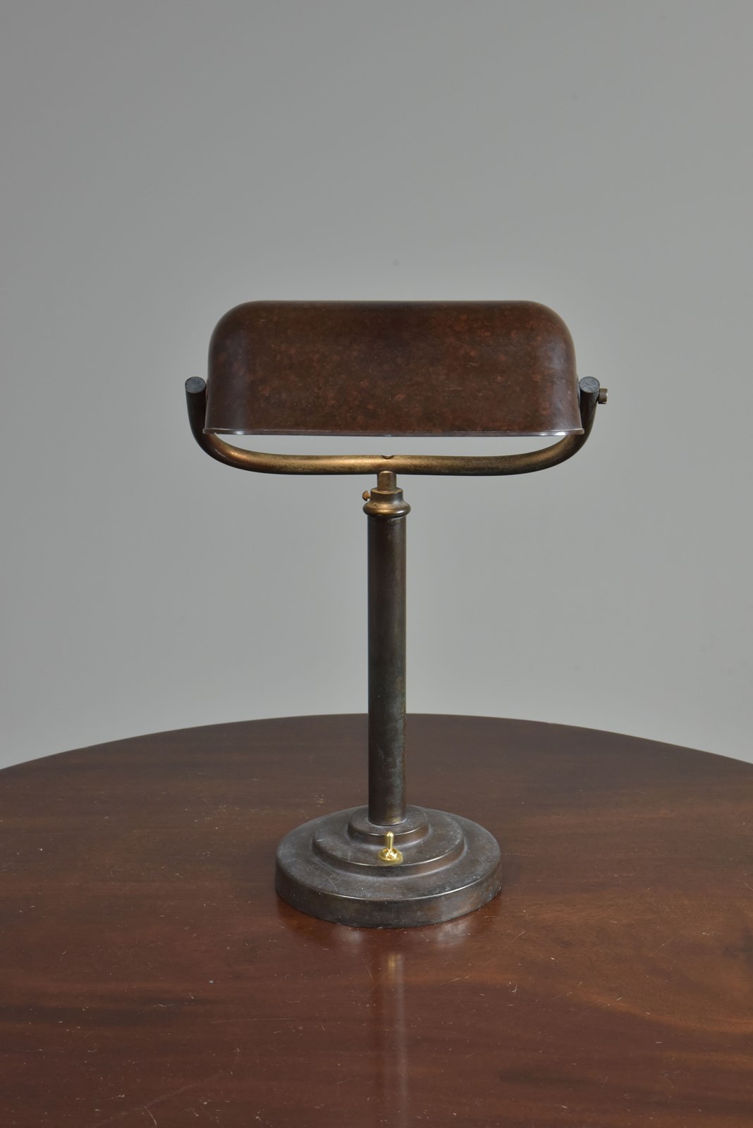 A period antique art deco brass bankers / desk / office / study lamp with a stepped circular base and bakelite trough shade. English 1920s-30s.