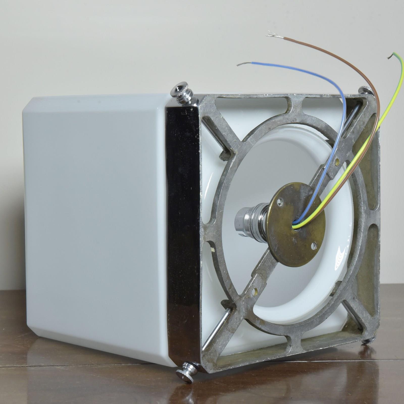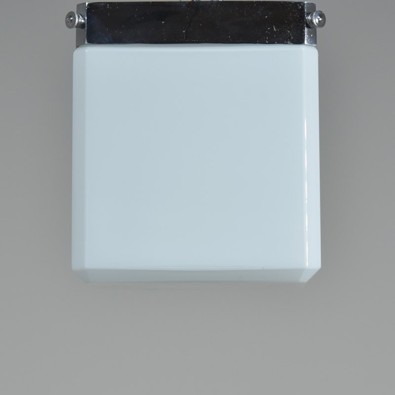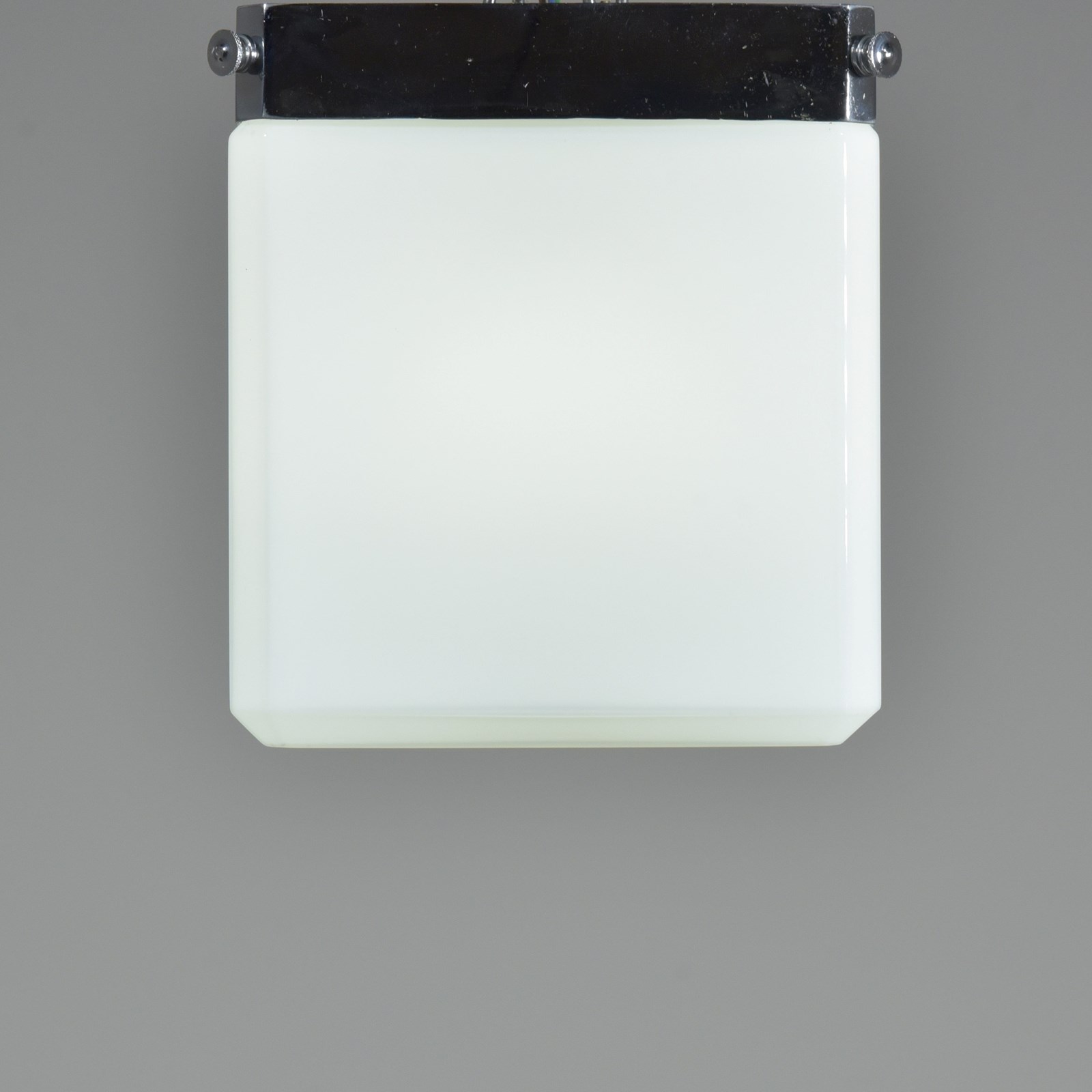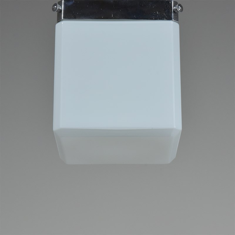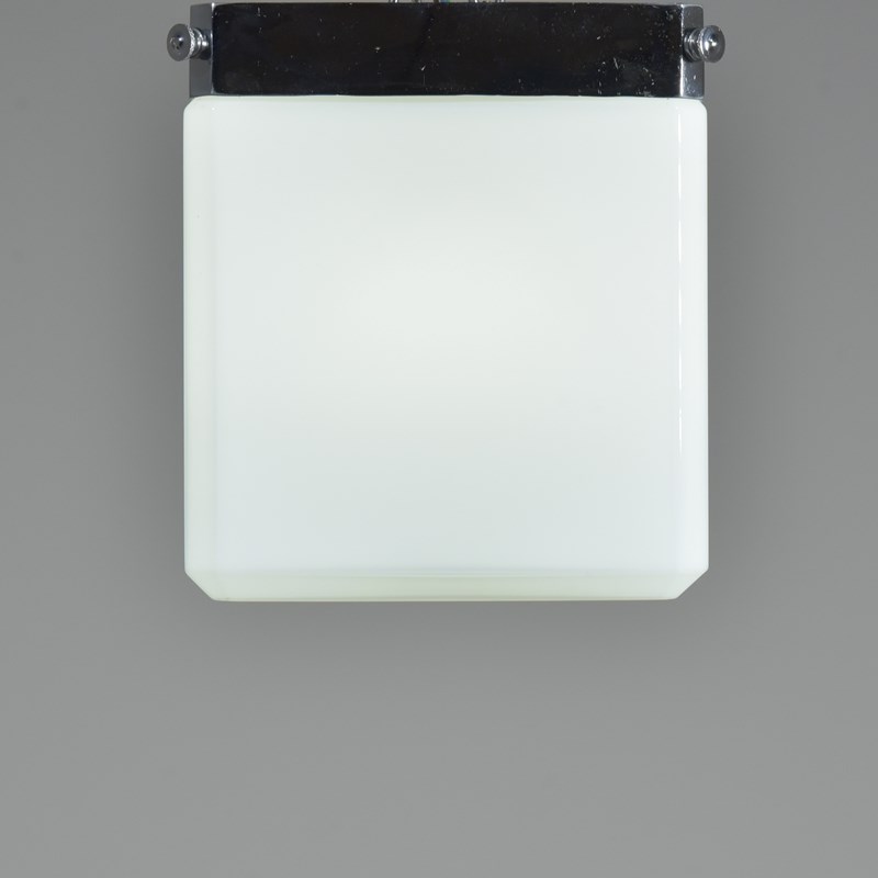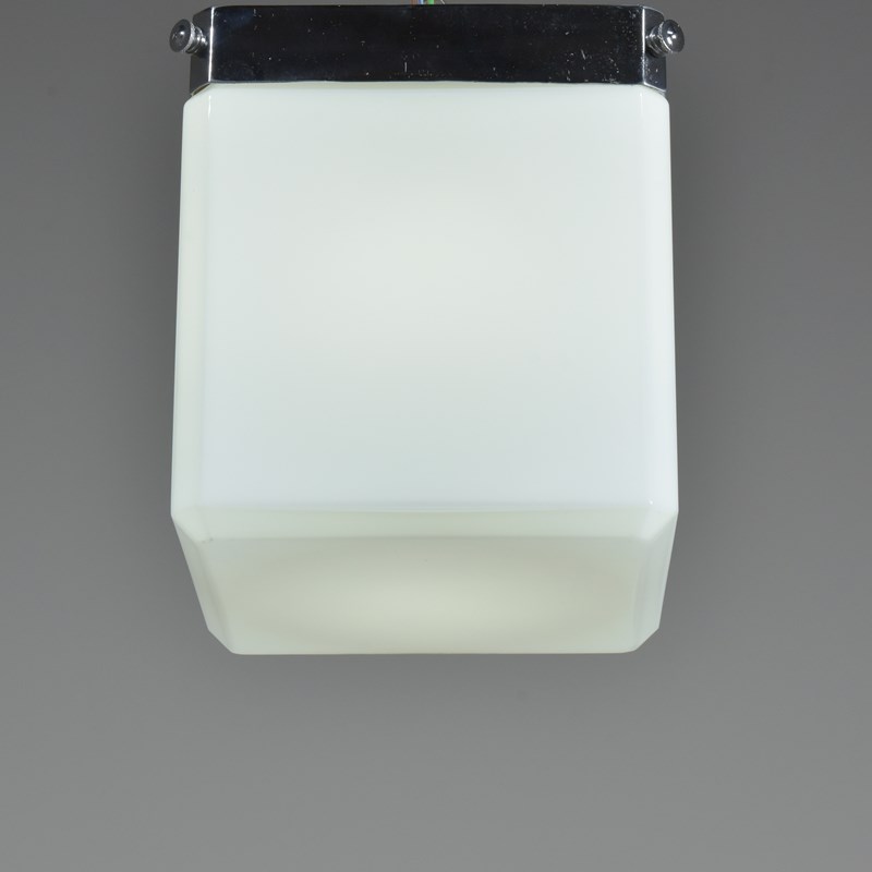 An Art Deco period opal glass cube (with canted corners) surface mounted light with chrome plated cast brass mount. English, 1920-30s.