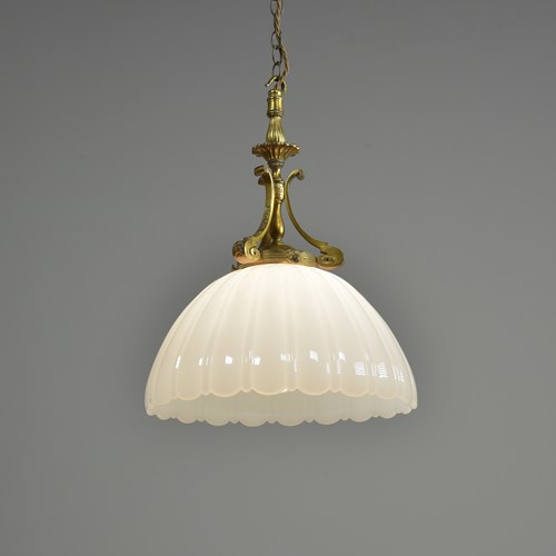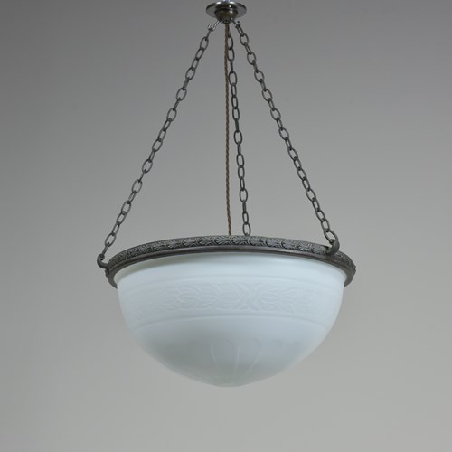 An antique art deco glass hanging light fitting; 8 canted oblong pieces of pyrimidal / prismatic glass pieces suspended from a cast brass frame (secured with nickel plated brass hexagonal nuts) with two discs of similar glass supported above the frame to form a highly refractive light fitting especially when lit. English, c1930. Photos show this light unlit and lit with a regular and slightly cooler bulb. All complete. No damage. Very good condition. This has been fully cleaned and the decorative nuts polished. Rewired with 1.25m fabric flex. Supplied with original nickel plated hooked ceiling plate and chain (8"/20cm - i can supply a longer length of solid nickel plated brass chain if required). Dimensions in inches/cms; 14"/35.5cm diameter. 11"/28cn tall.