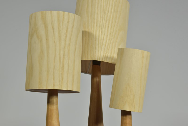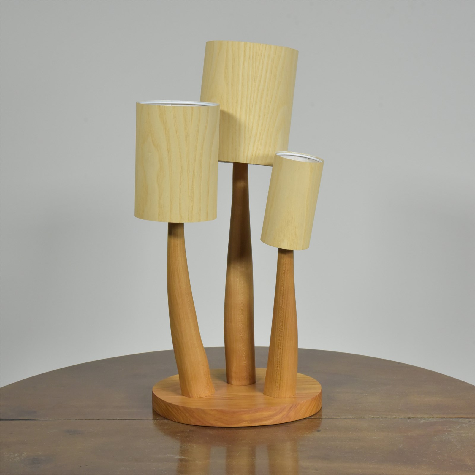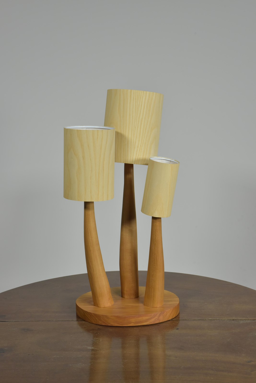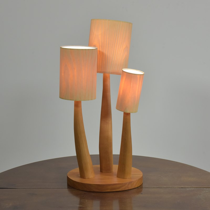 A unique triple table lamp hand crafted from British hardwoods by Peter Lanyon in Devon. 21st century.