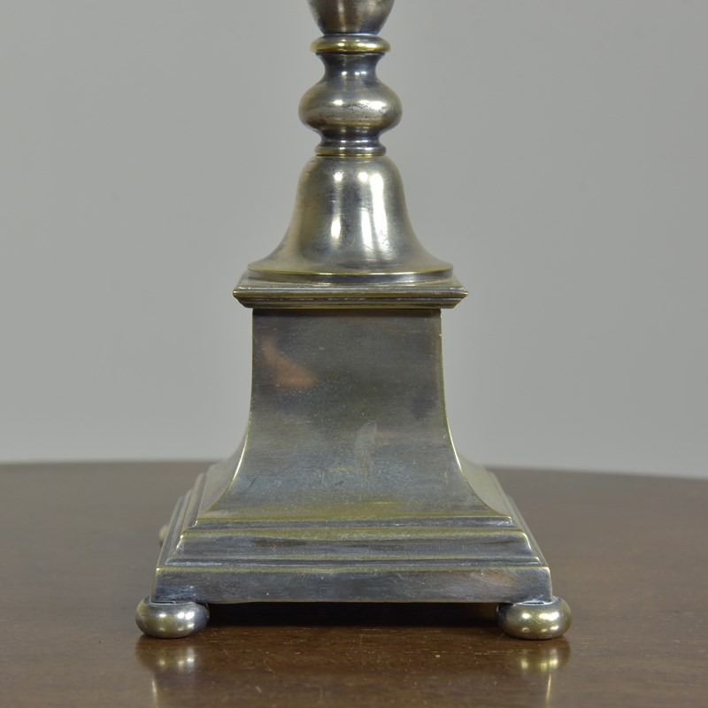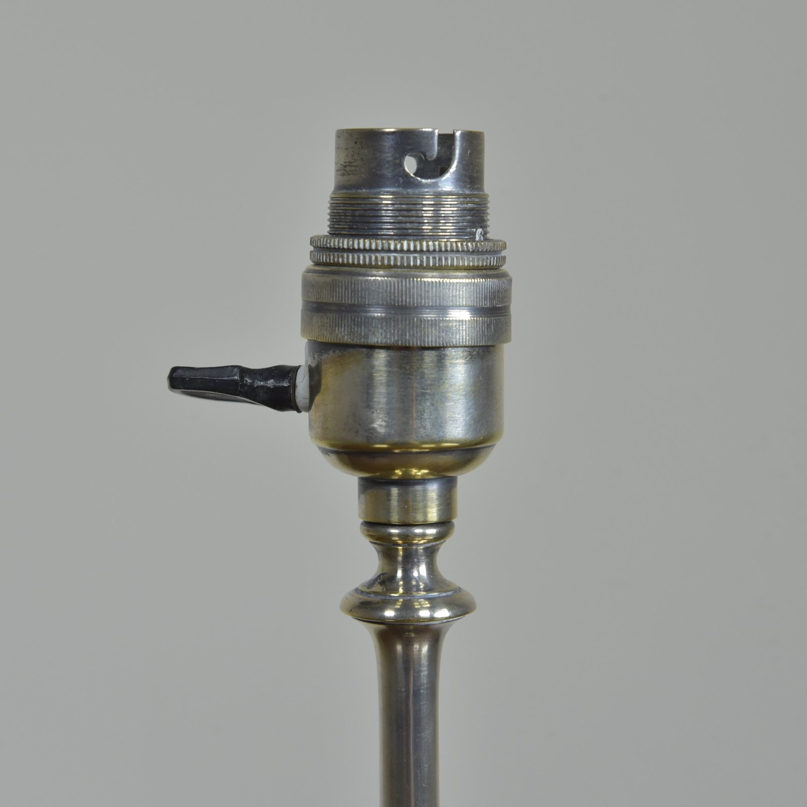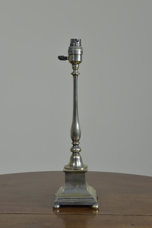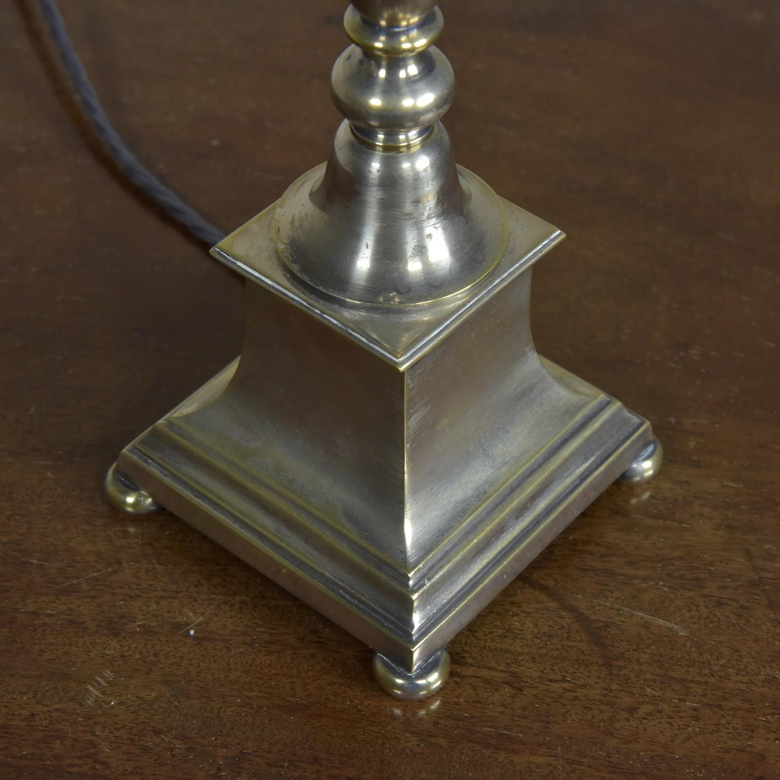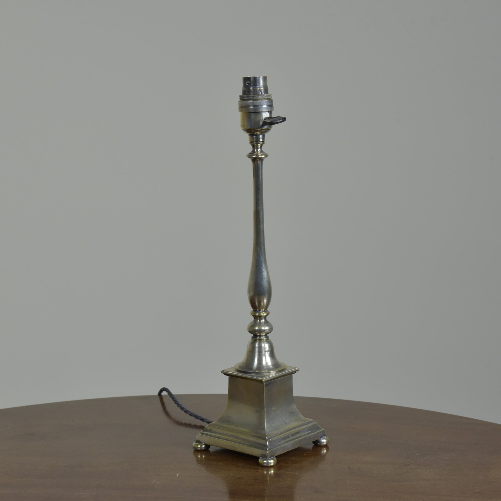An attractive antique silver plated cast brass table lamp by Faraday & Son with a baluster shaft, spreading square moulded plinth on four bun feet. English, Edwardian.