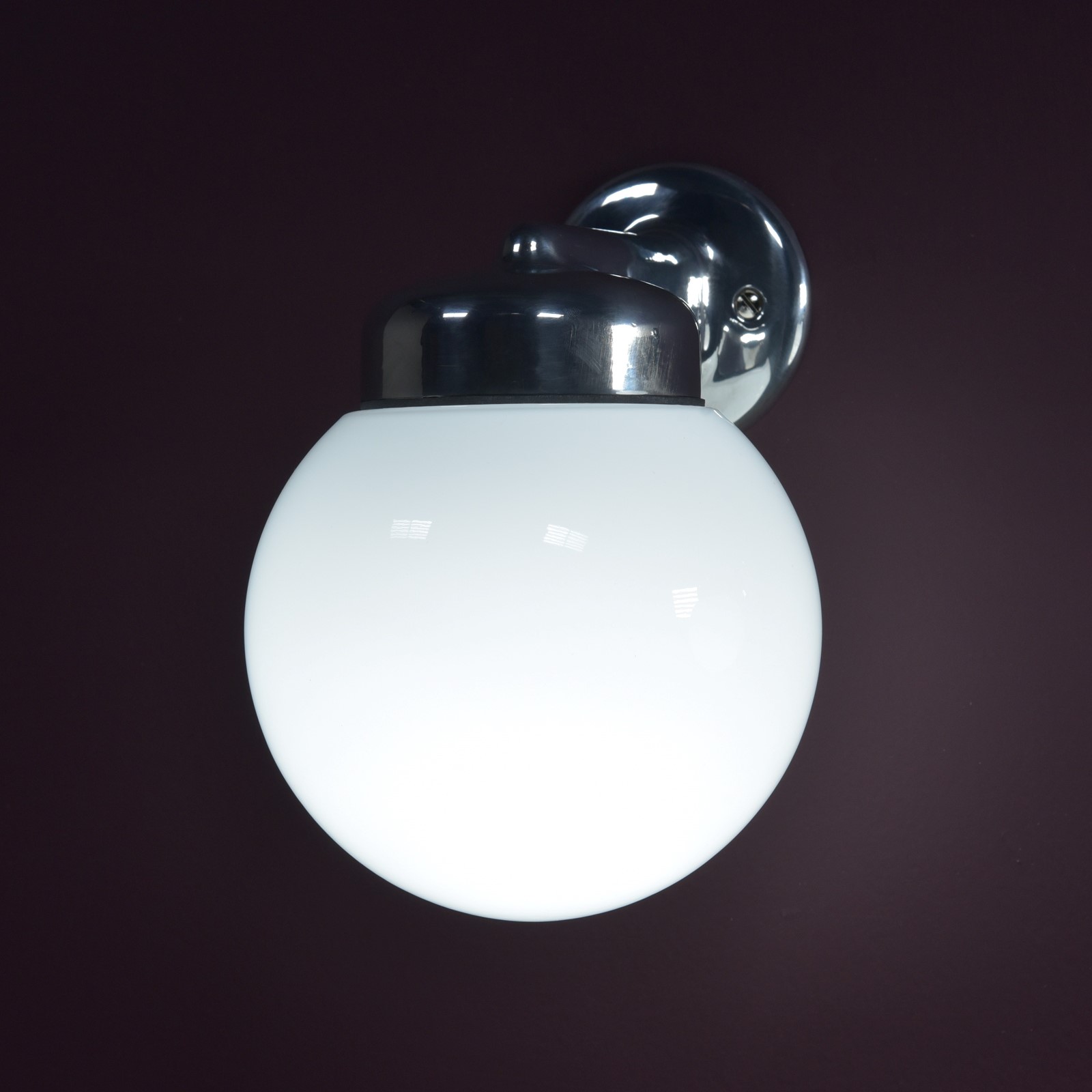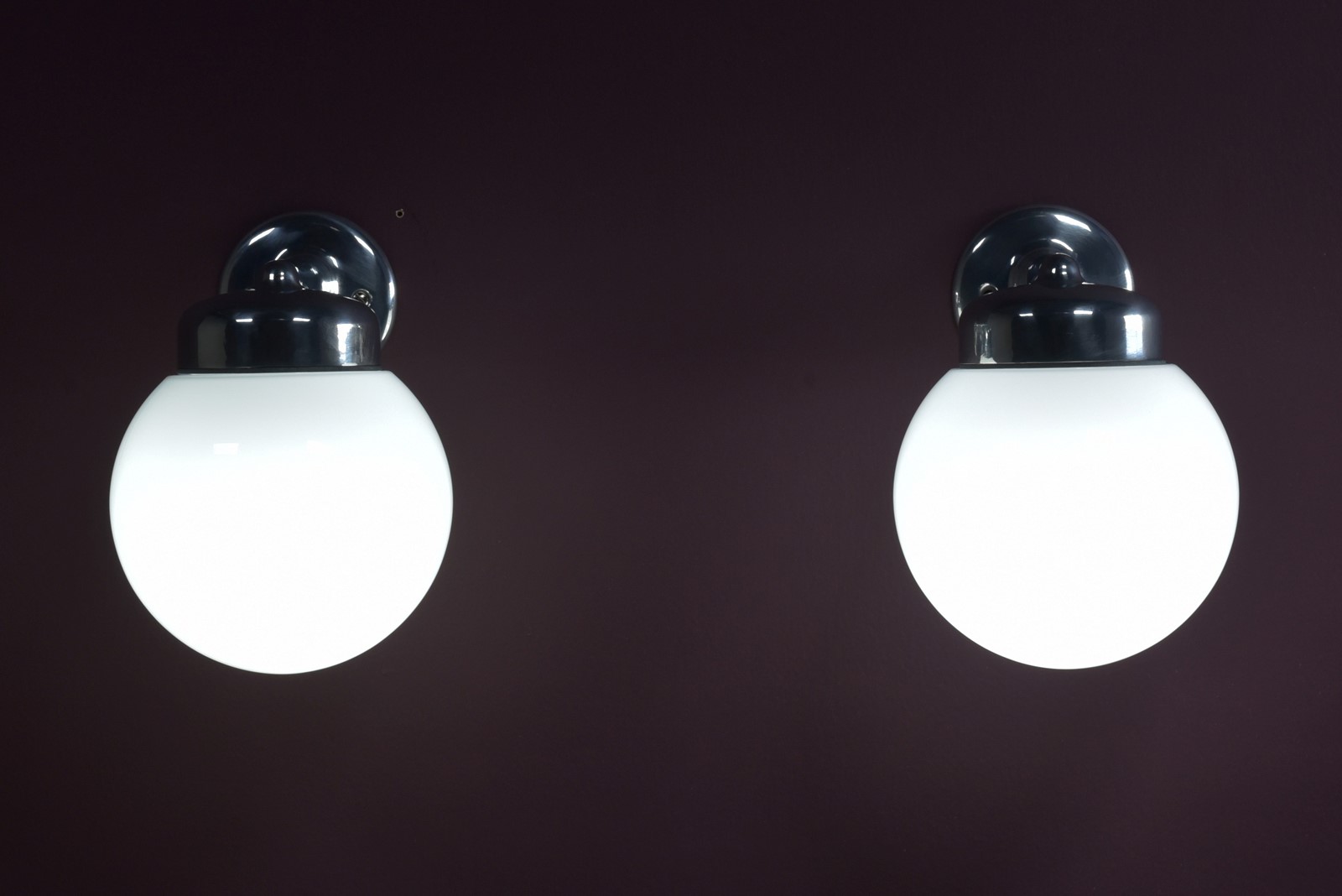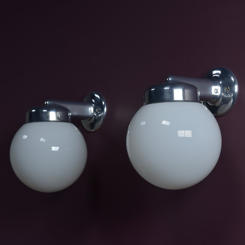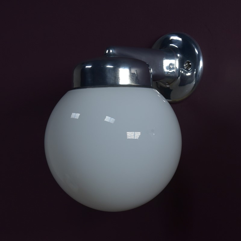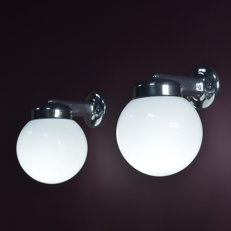 A run of cast aluminium bracket / opal glass globe shade wall lights. Made by GEC. English, mid century. Reclaimed some years ago from a Yorkshire hospital. Potentially 28 available. Priced individually. 8 highly polished, rewired, ready to go. New BC lampholders. Supplied with nickel plated brass raised head slotted screws. Dimensions in inches/cms; 8.5"/21.5cm tall. 6"/15cm width / globe diameter. 7.5"/19cm projection. 0.85kg each.