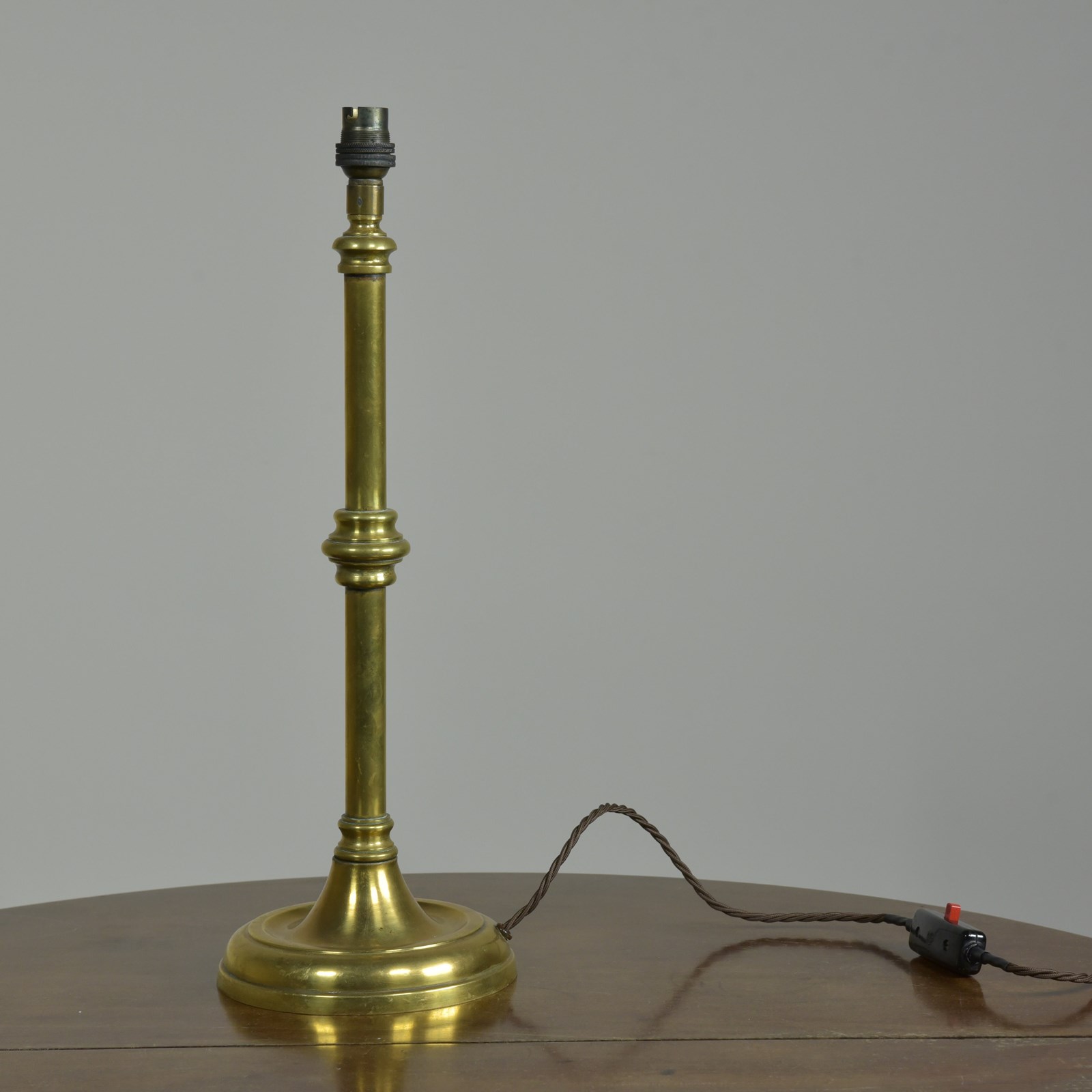 An antique knopped brass shaft and circular base table lamp by GEC. English. Approx 1930s.
