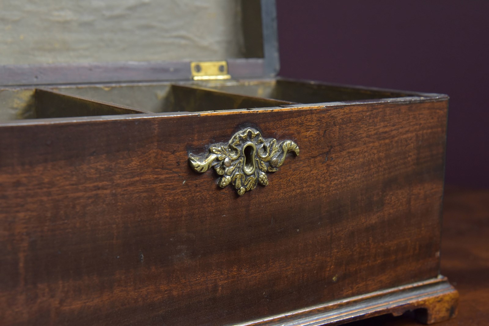 An attractive antique mahogany George III tea caddy chest divided internally into three compartments all having lids with central small brass lifting knobs. English, c1770. Original hardware, no key. No reason this can't still be used as a tea caddy as well as a decorative item. Dimensions in inches/cms; 10.25"/26cm wide. 6"/15.5cm tall. 6"/15.5cm deep.