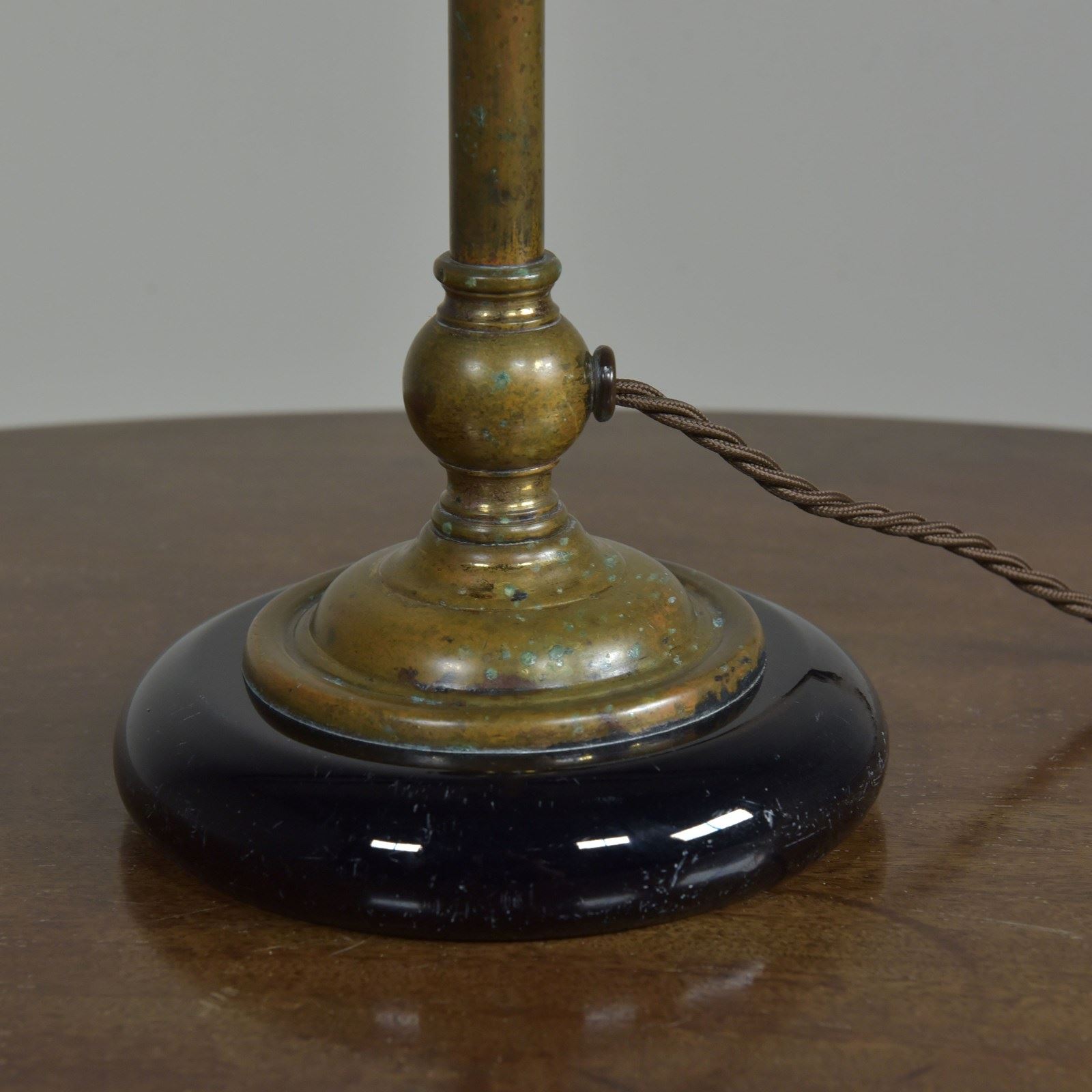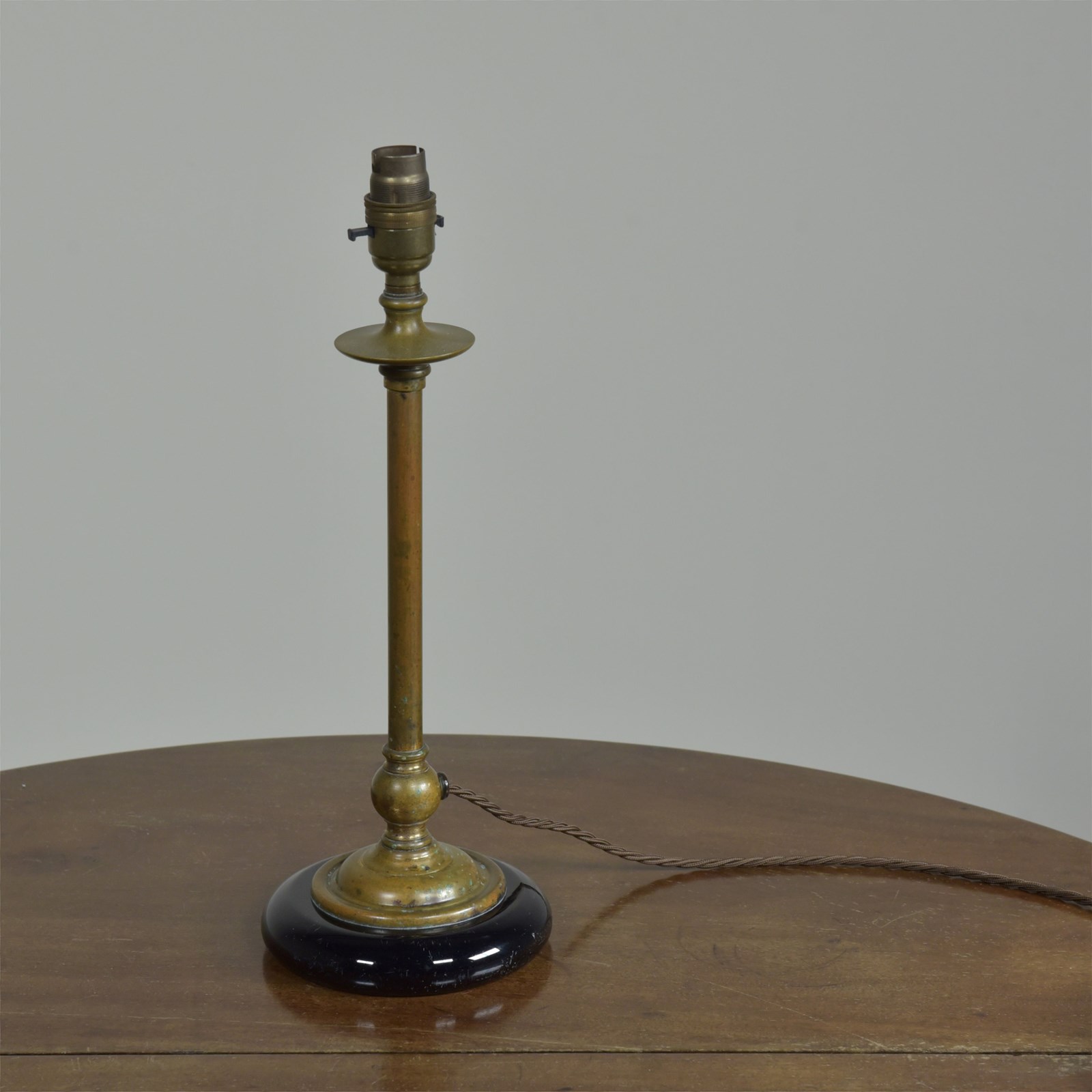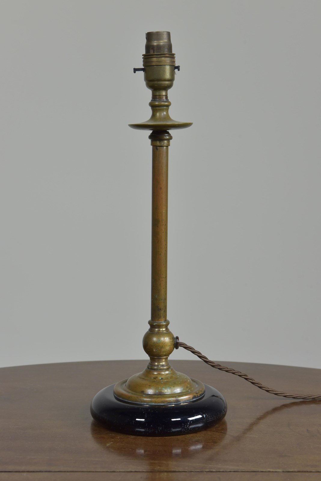 An antique faded gilt brass lamp with black ceramic disc base. English, early 20th century.