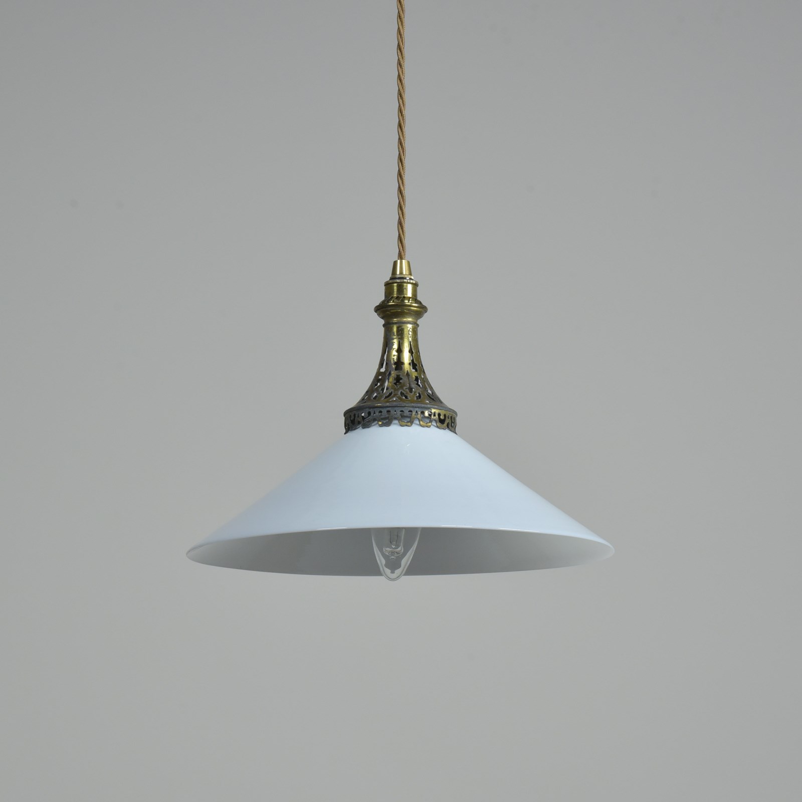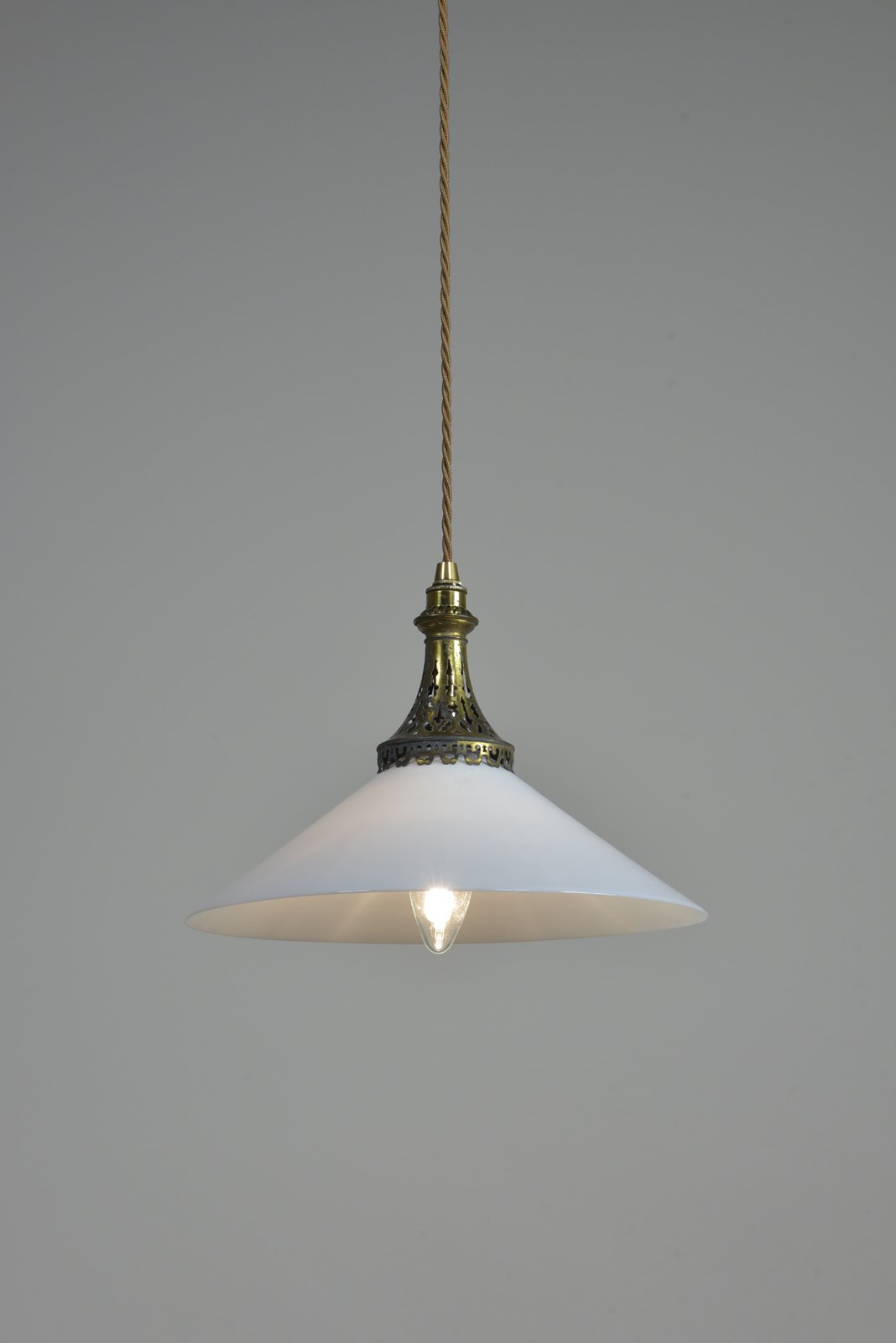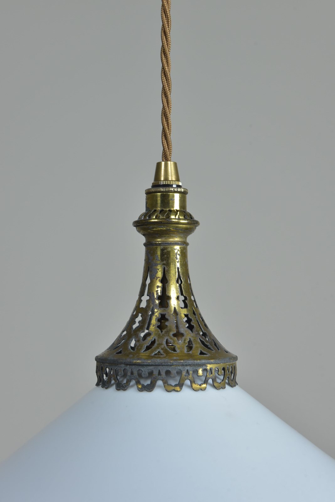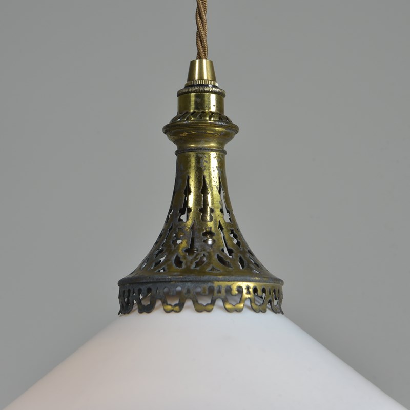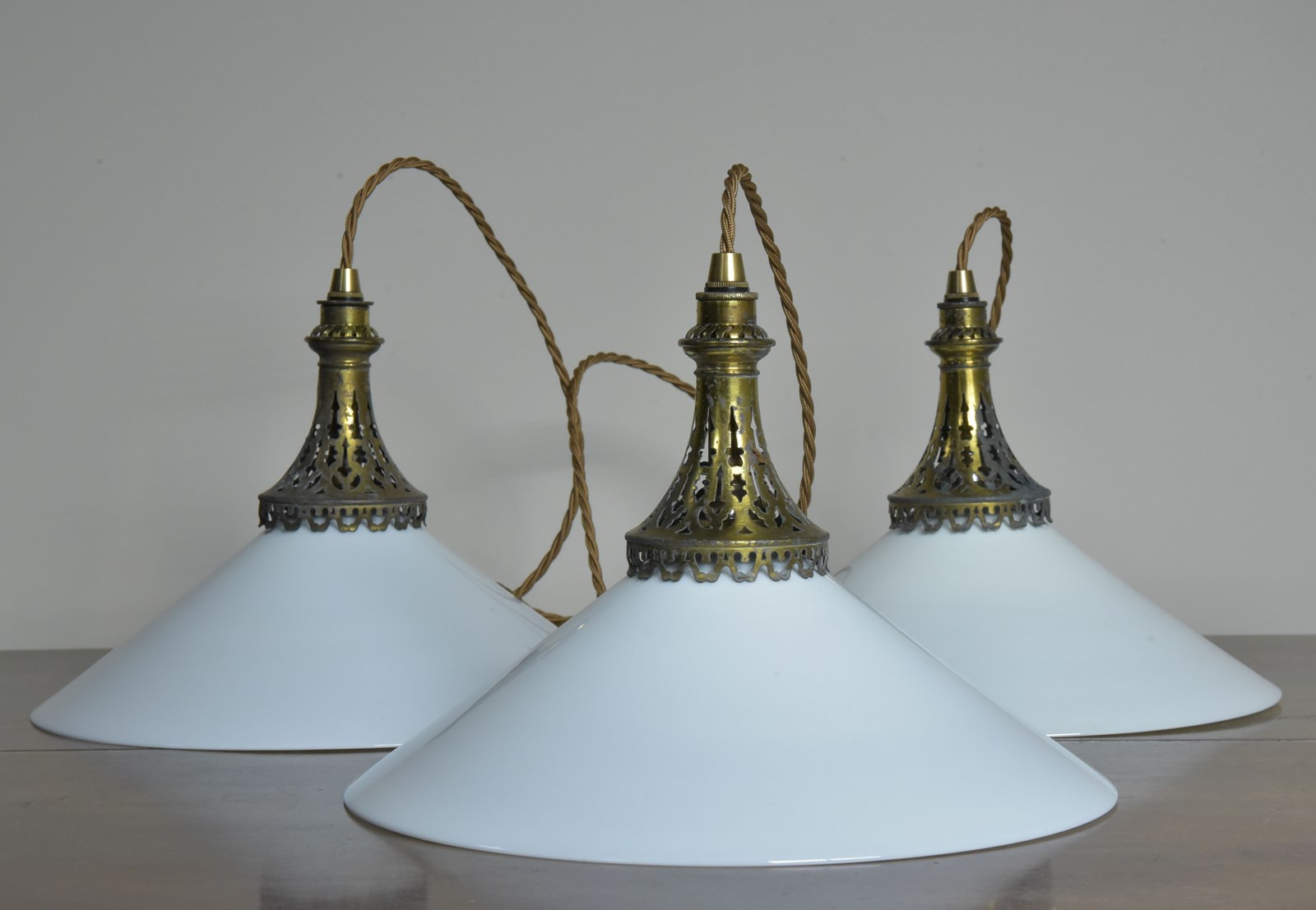 A pleasant lighting ensemble; 19th century delicate gilt pierced brass gas light galleries paired with large antique coolie shades (early 20th century).