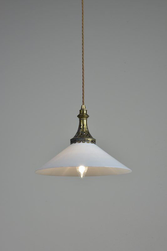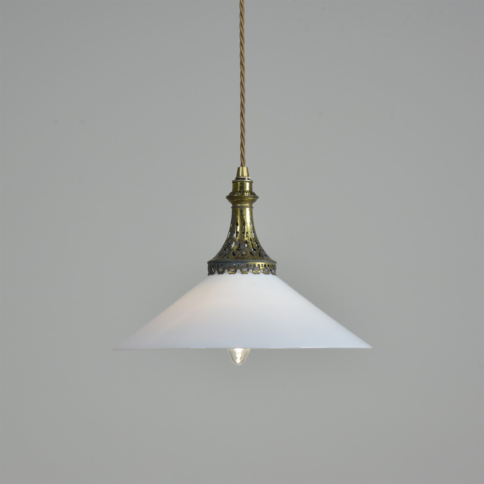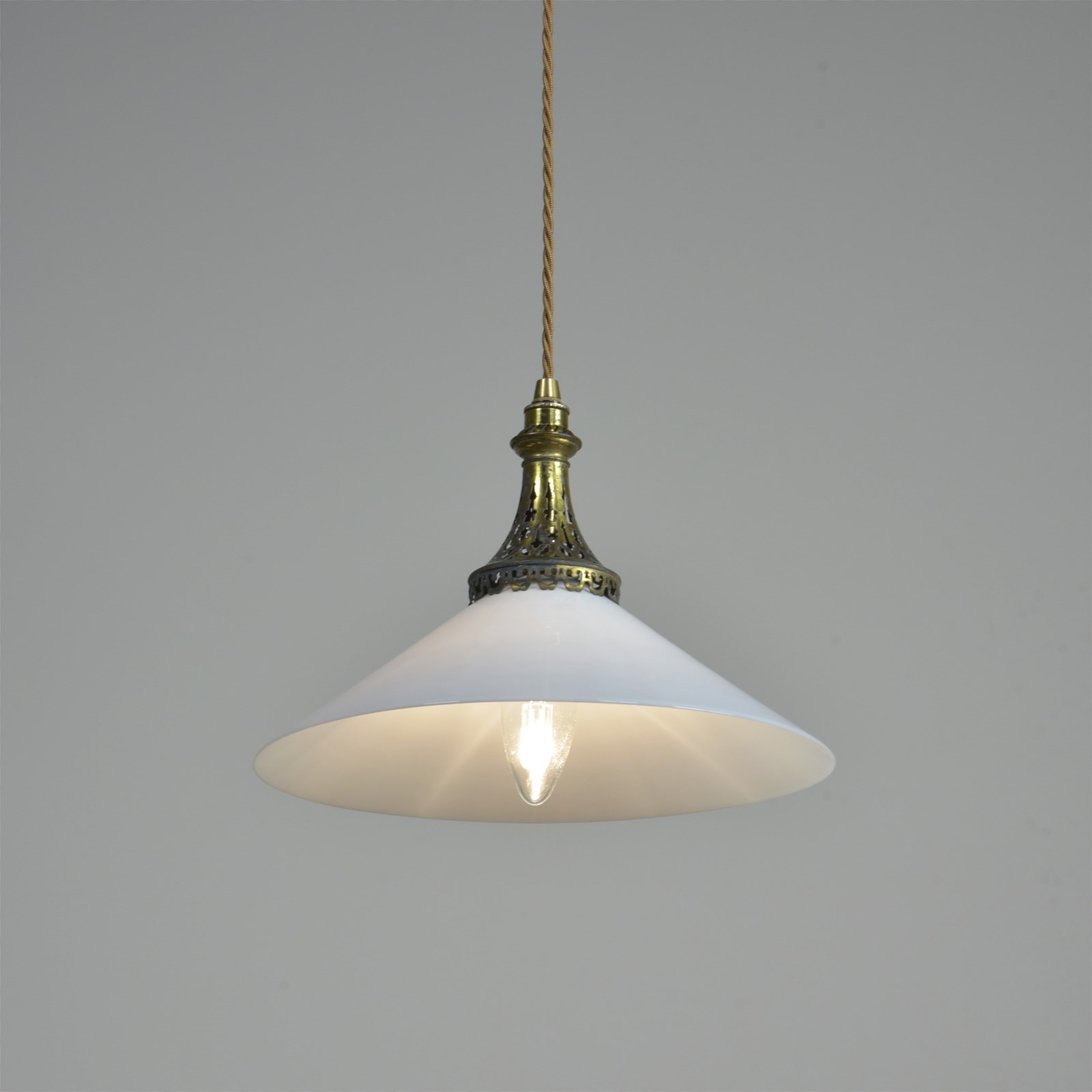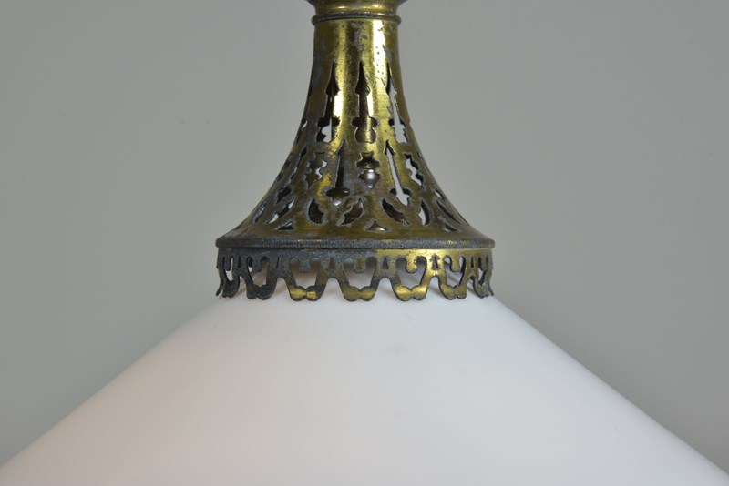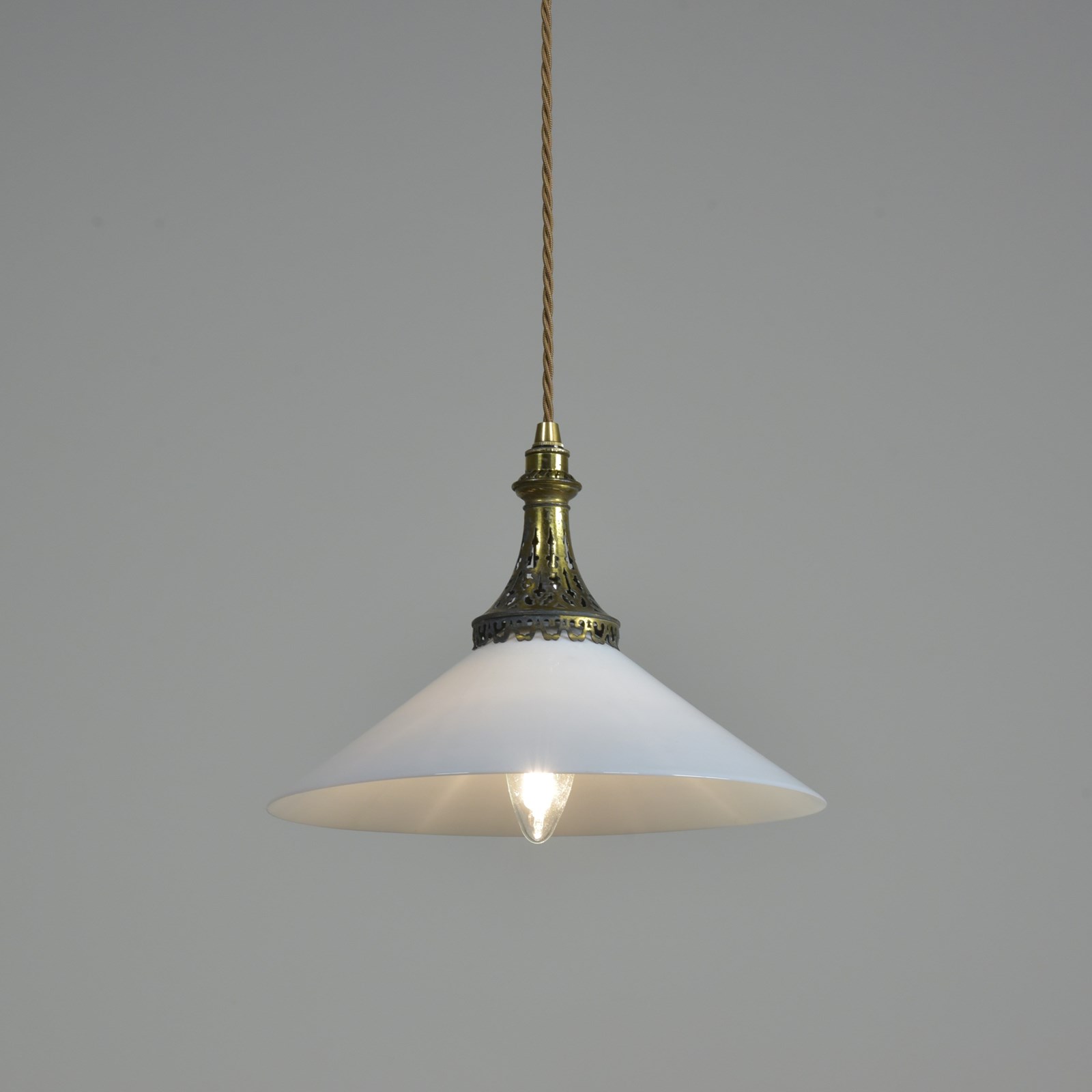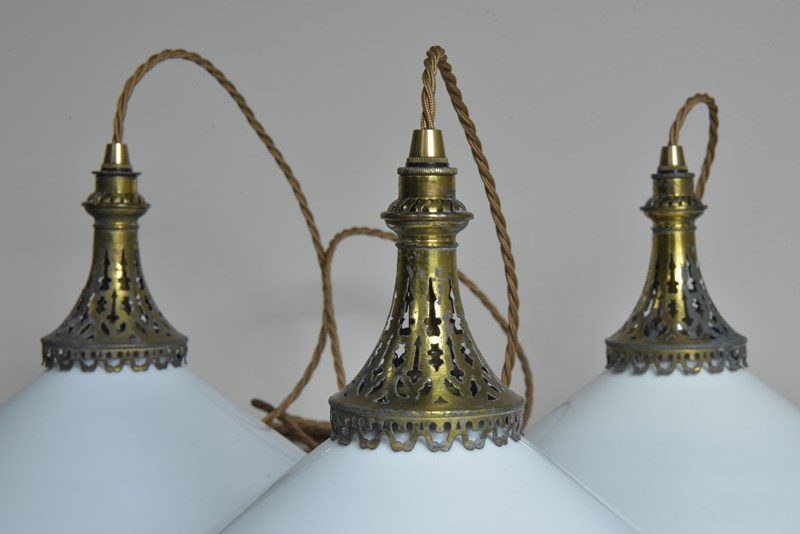 A pleasant lighting ensemble; 19th century delicate gilt pierced brass gas light galleries paired with large antique coolie shades (early 20th century).