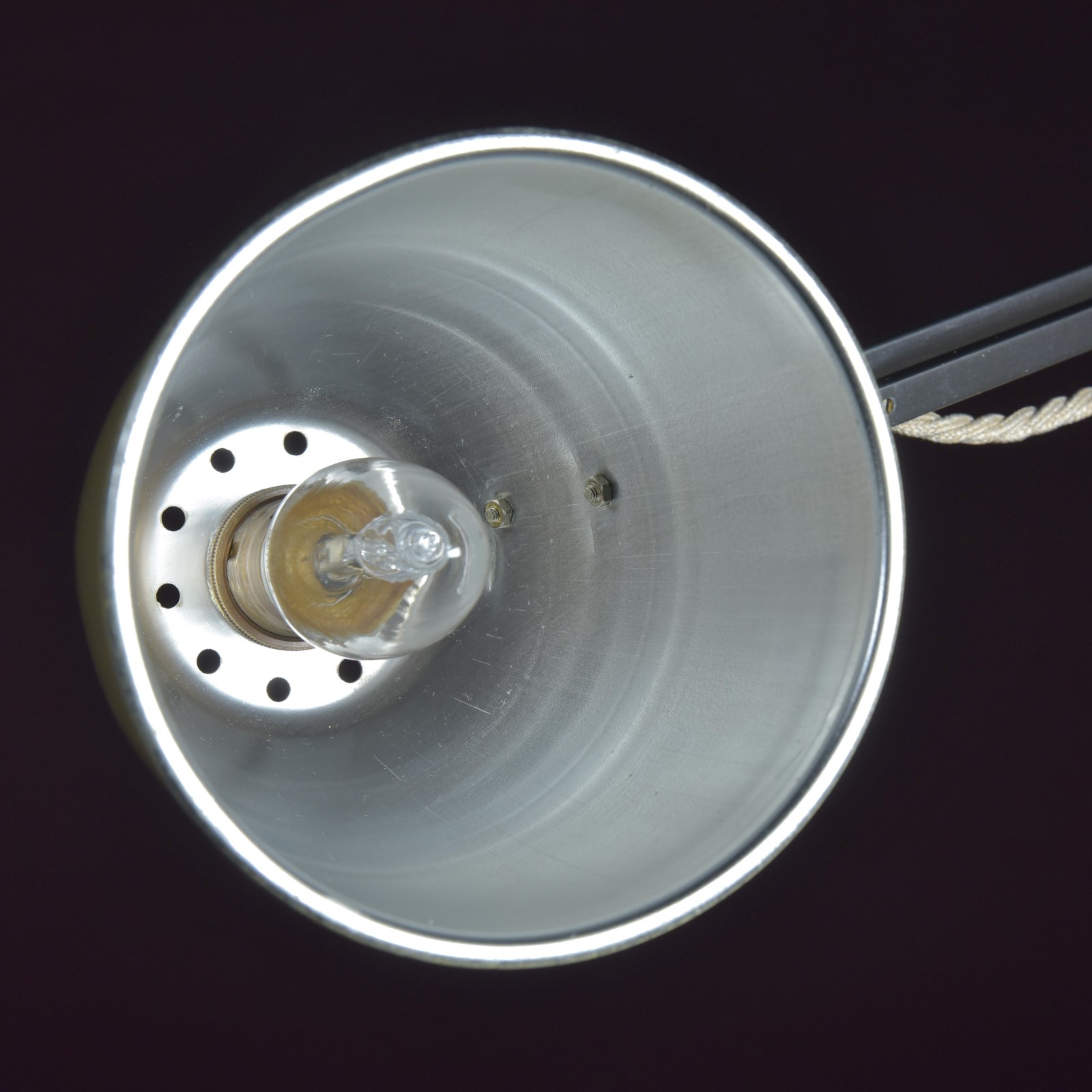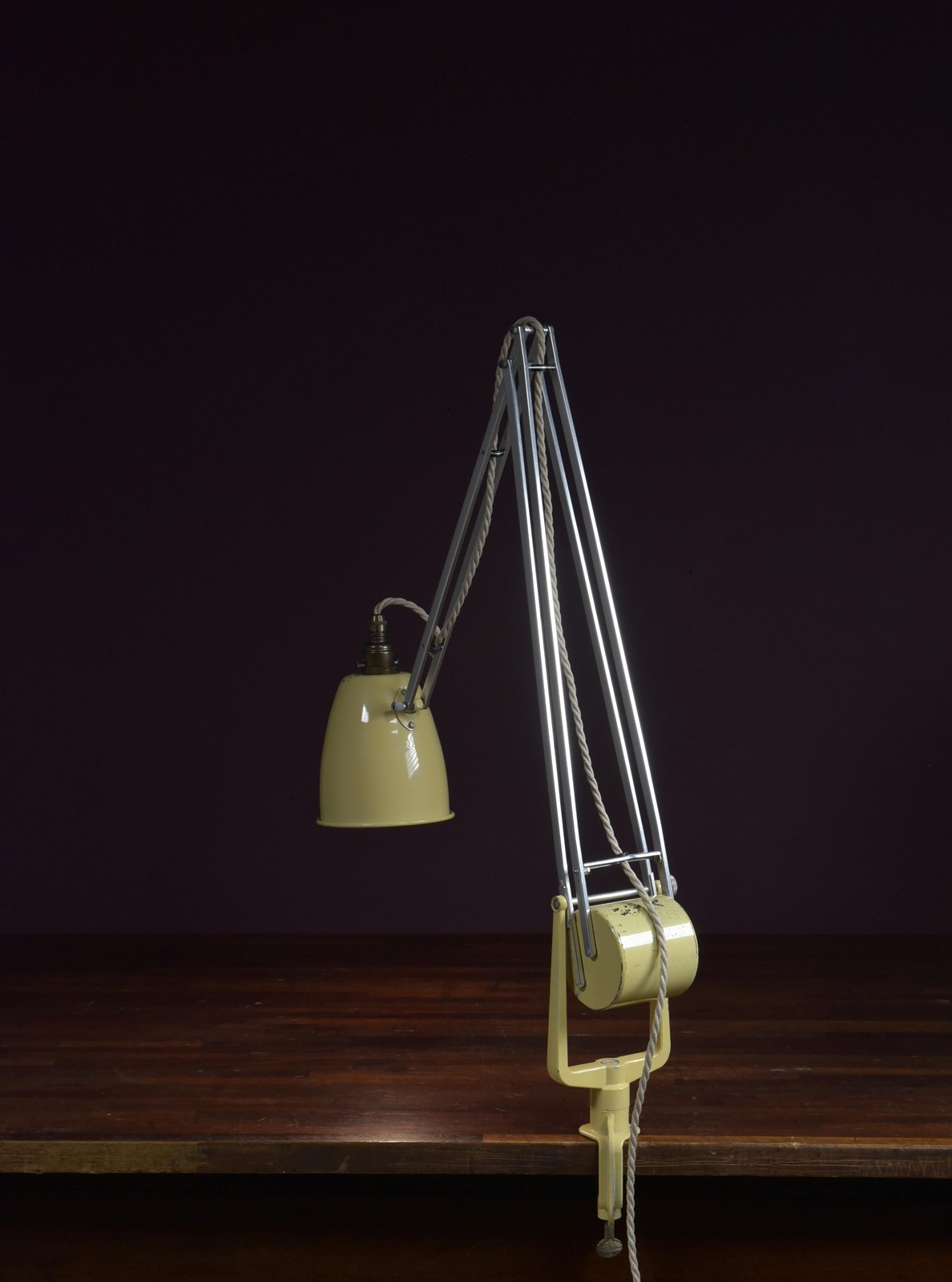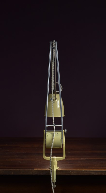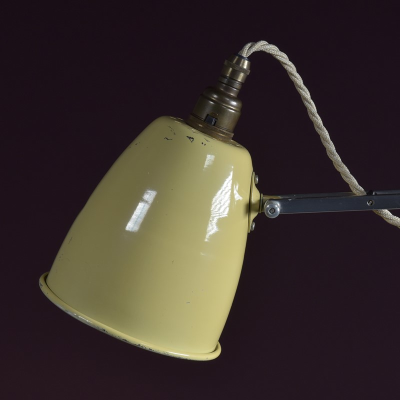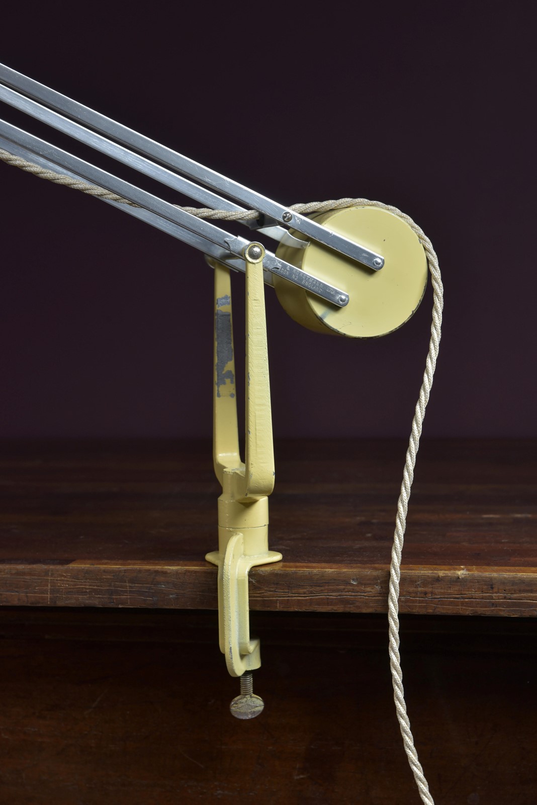 A Hadrill & Horstmann counterbalance clamp-on desk / work / task lamp in original primrose yellow paint. English mid century. Arms stamped Hadrill & Horstman Ltd London N2 England. Fully cleaned (paintwork T-cutted/reconditioned) and waxed for protection. No rust. Lovely condition. Rewired with 3.5m fabric flex, new patinated brass lampholder / cordgrip and traditional plug. Dimensions in inches/cms; 44"/112cm max height inc. shade (from table top). Approx 25.5"/65cm tall to the elbow joint. 5"/12.5cm shade diameter. 4.4kg.