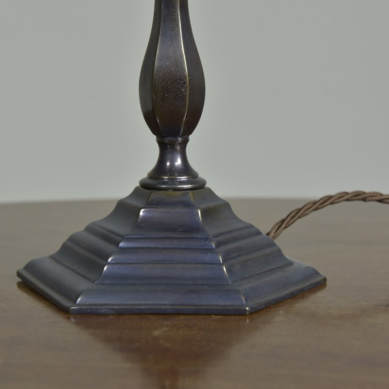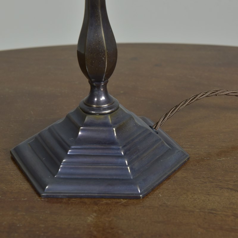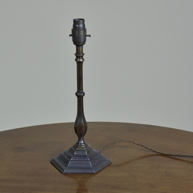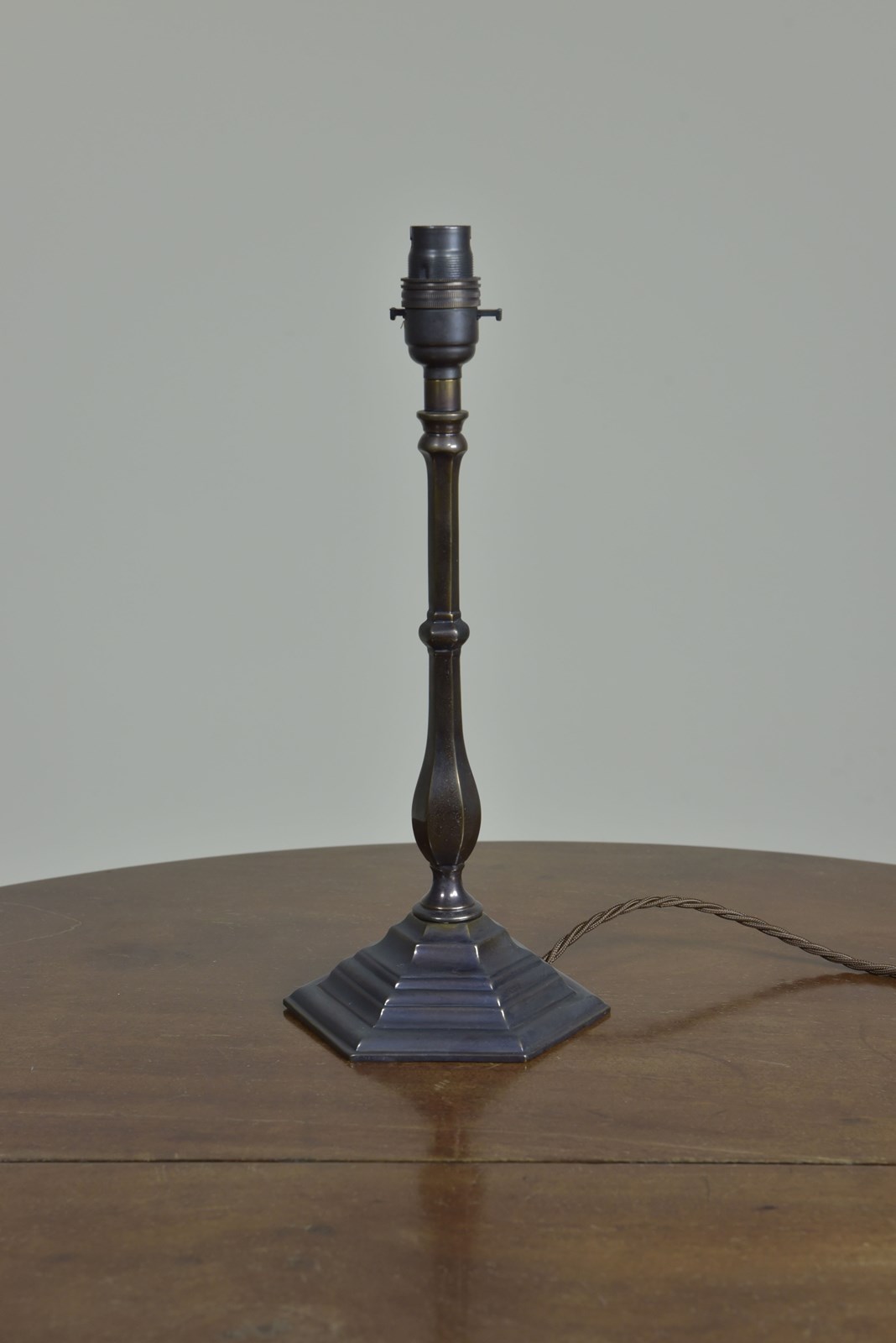 An antique bronzed brass hexagonal / baluster knopped shaft lamp with compound moulded hexagonal base. English, early 20th century.
