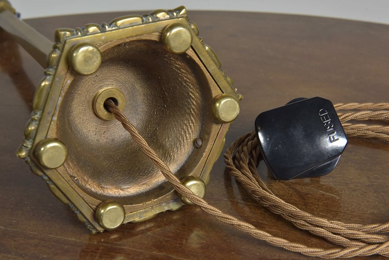 Rewired with 2.5m fabric flex, patinated safety-switched lampholder, 3amp traditional phenolic plug. Pat tested.