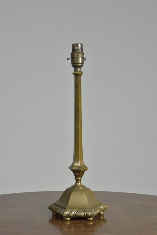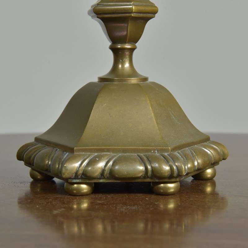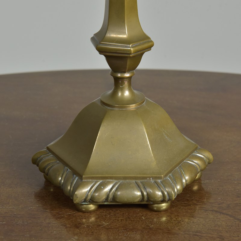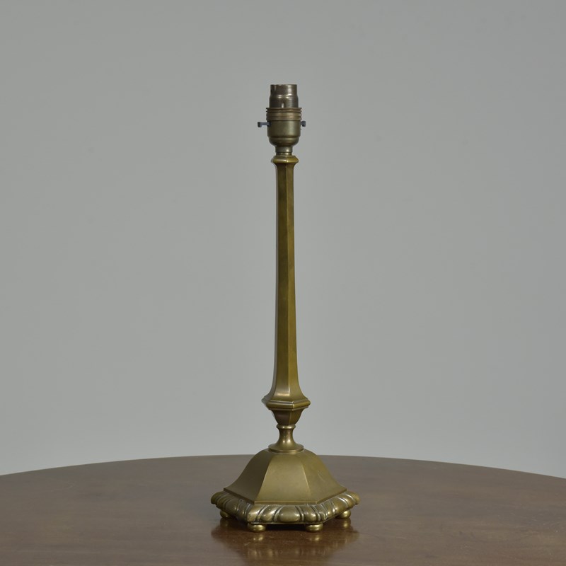 An antique brass lamp with tapering hexagonal shaft, gadrooned edged hexagonal base on six bun feet. English, early 20th century.