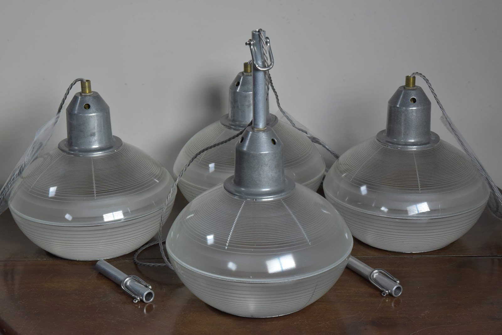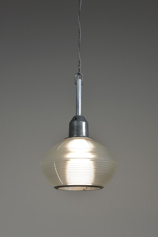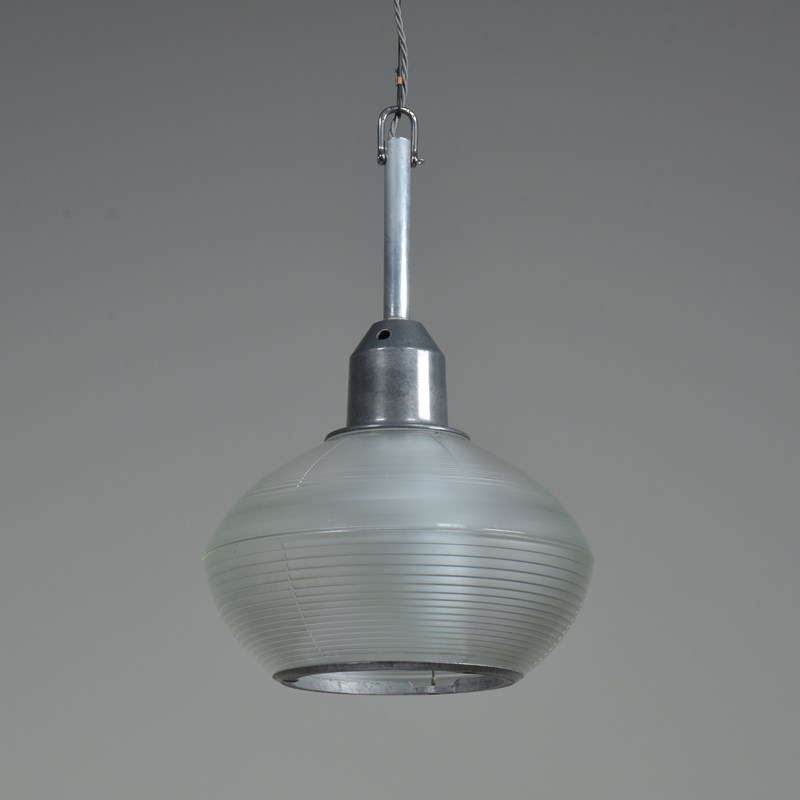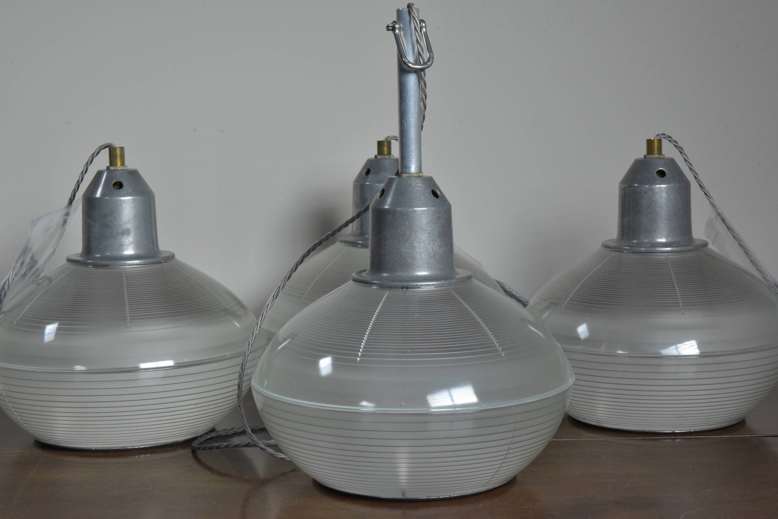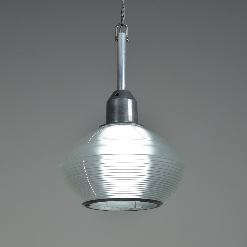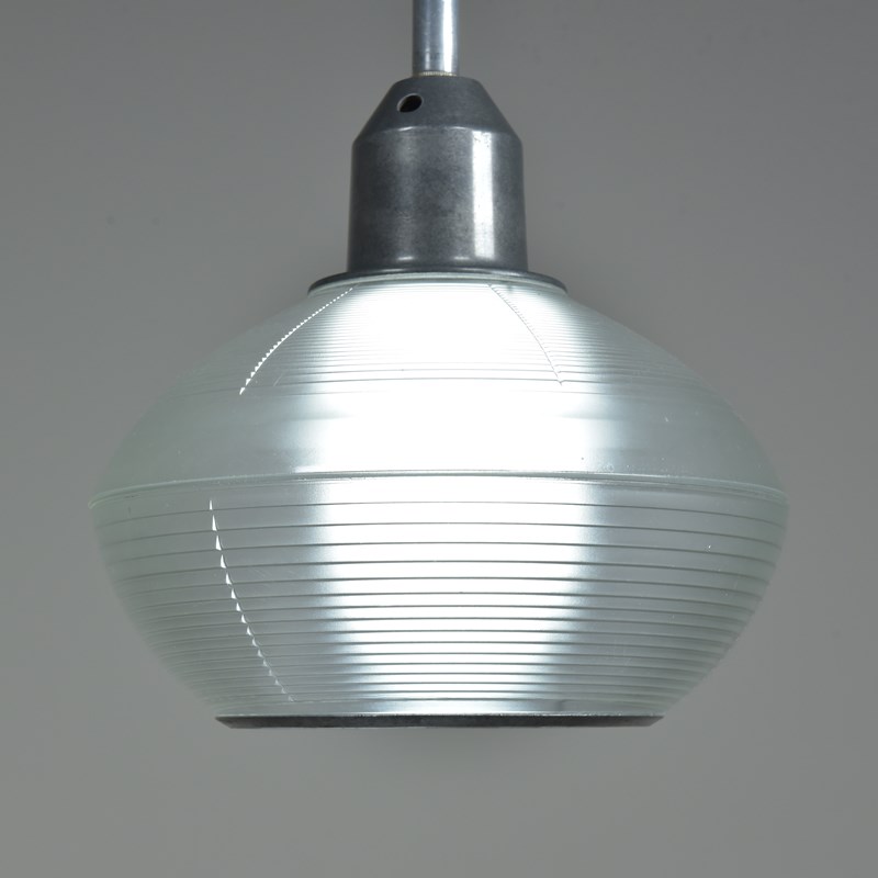 A set of four Holophane prismatic globe hanging lights. Approx 1940s.