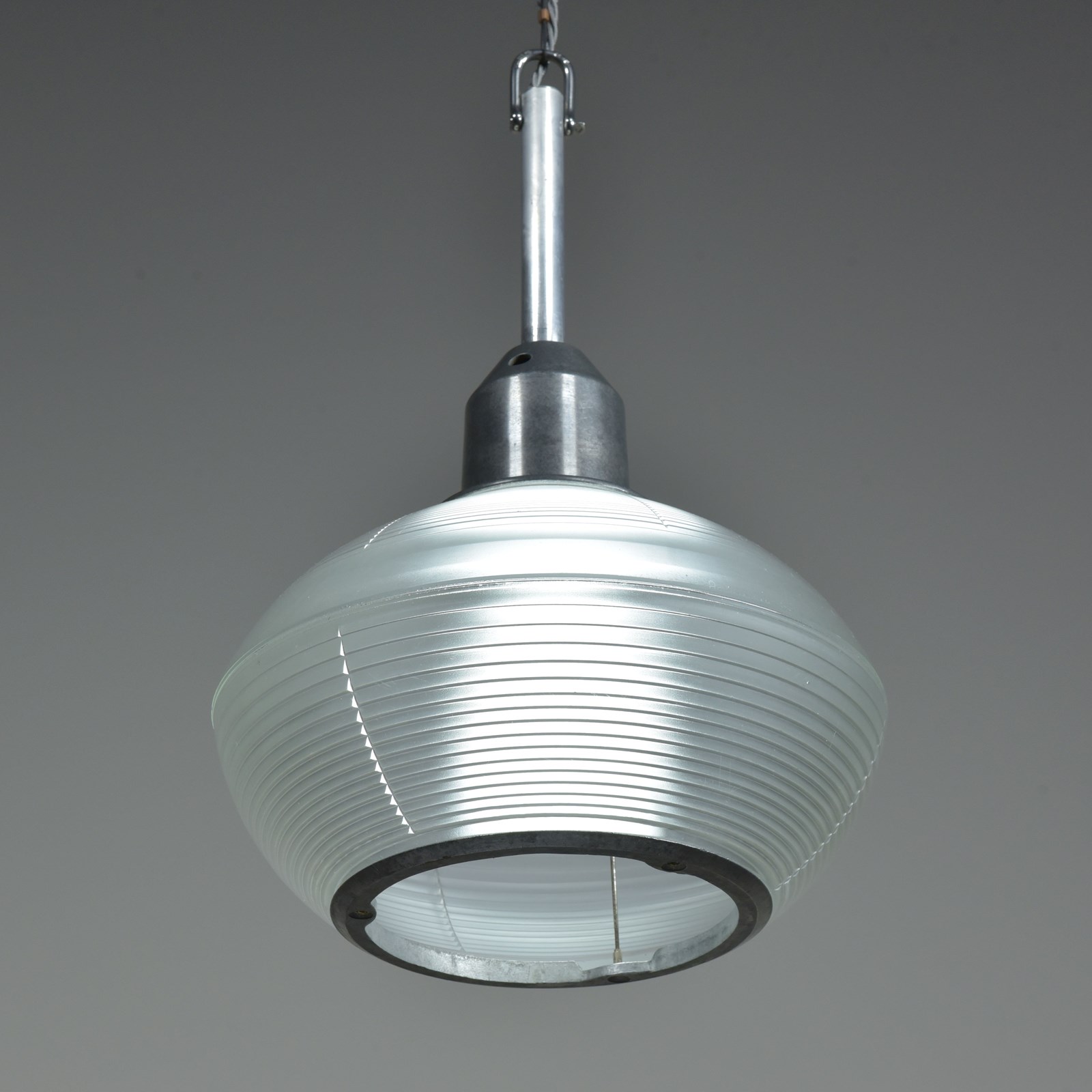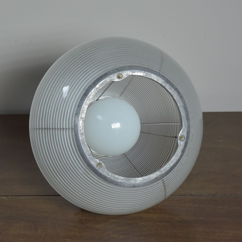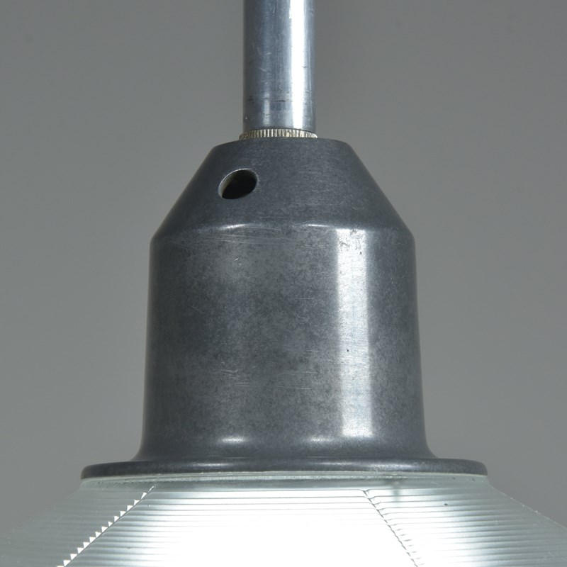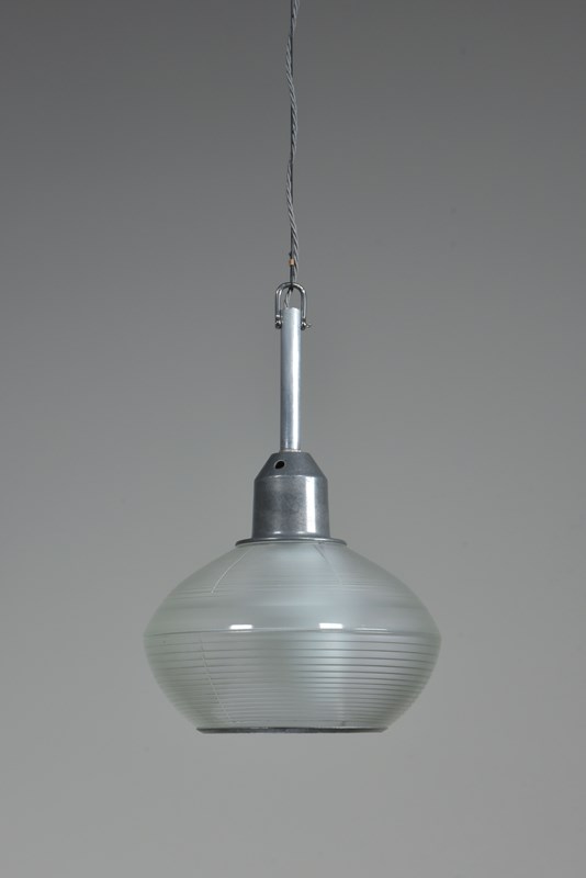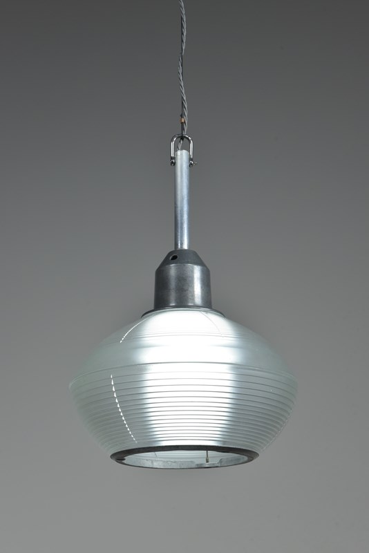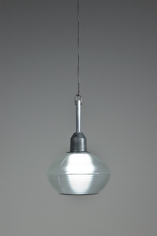 A set of four Holophane prismatic globe hanging lights. Approx 1940s.