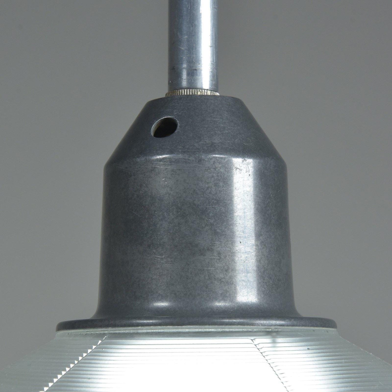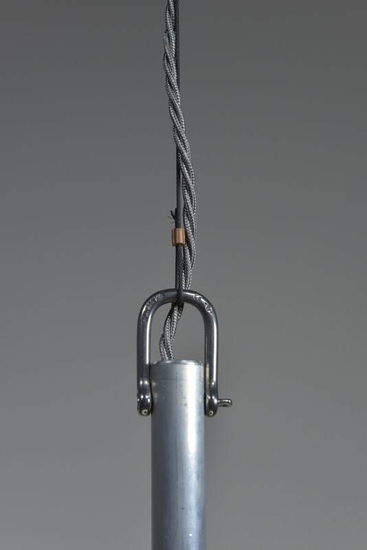 Great quality crisply cast glass satin etched to the inside. Good colour and quality aluminium gallery mounts. The original aluminium stems have been cut down and Wichard self locking stainless steel shackles fitted for hanging; in this case with wire to give a very sleek look. They can be hung this way or with chain.