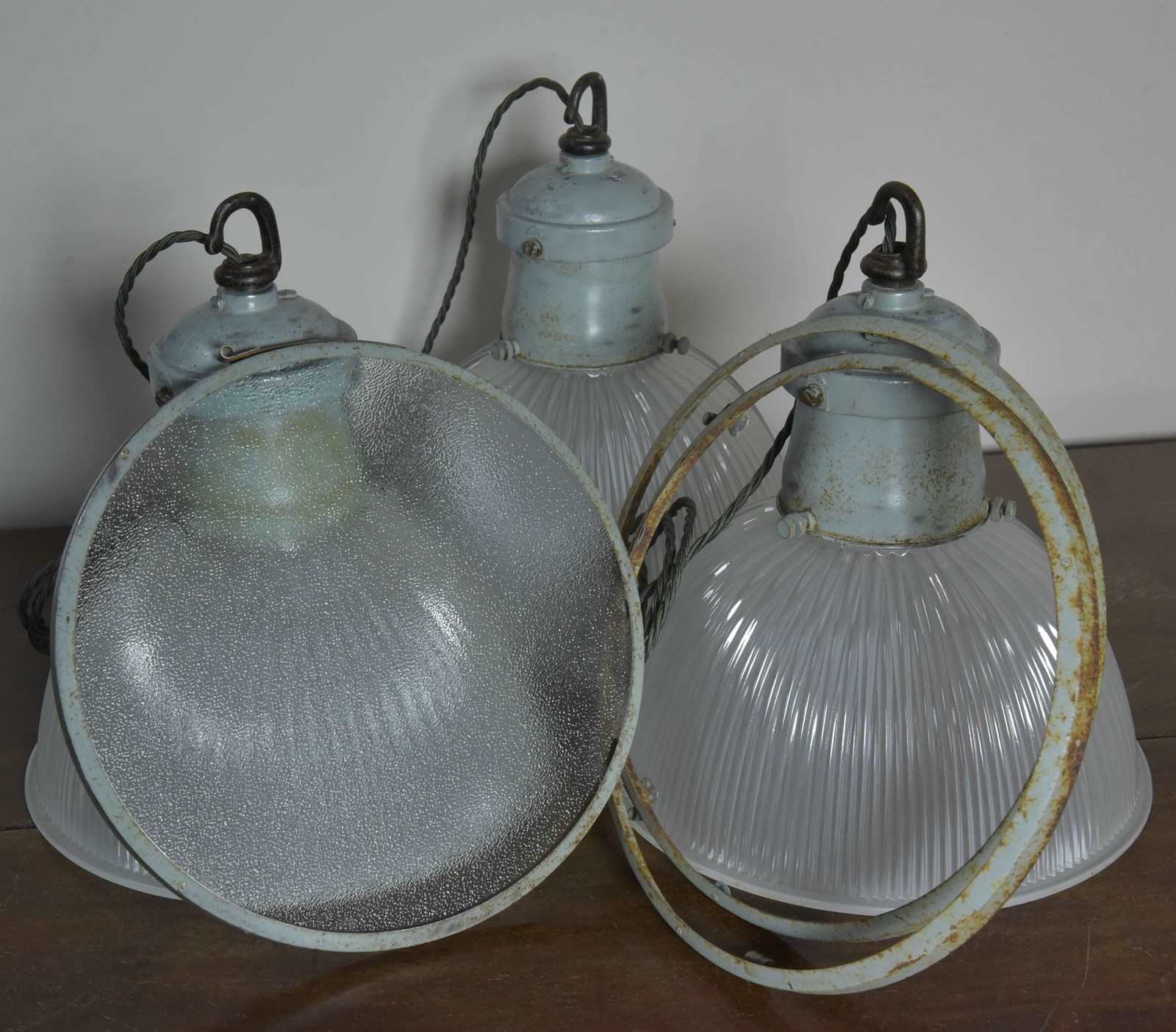 One of the lights has it's original base lens glass and all three the original frames for the glass. They can be used with or without - please see images.