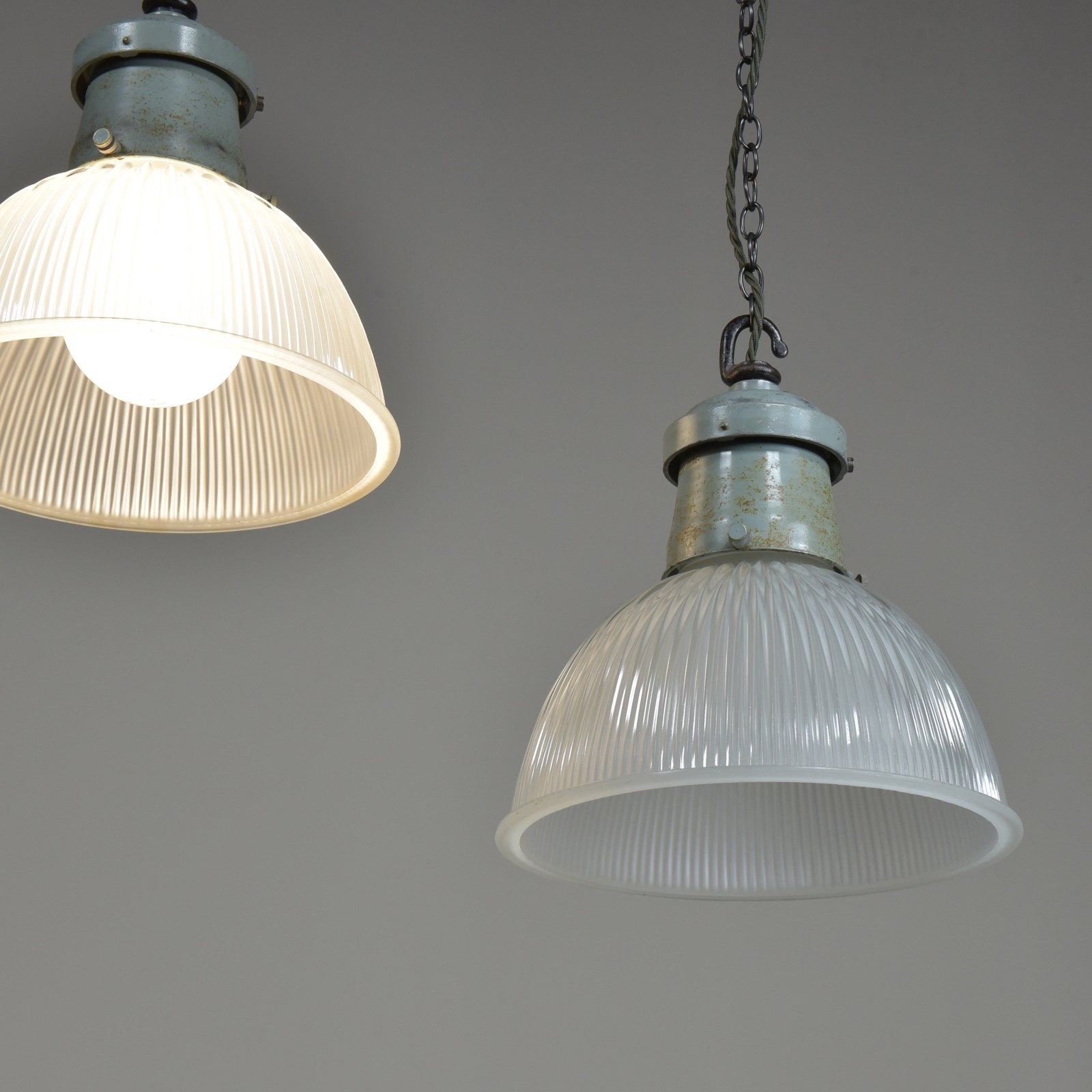 Rewired with 1.5m fabric flex, original porcelain ES lampholders (perfect condition). Each supplied with 1meter black jack chain (galvanised if preferred), original hooked ceiling plate (including vintage slotted roundhead black japanned screws).