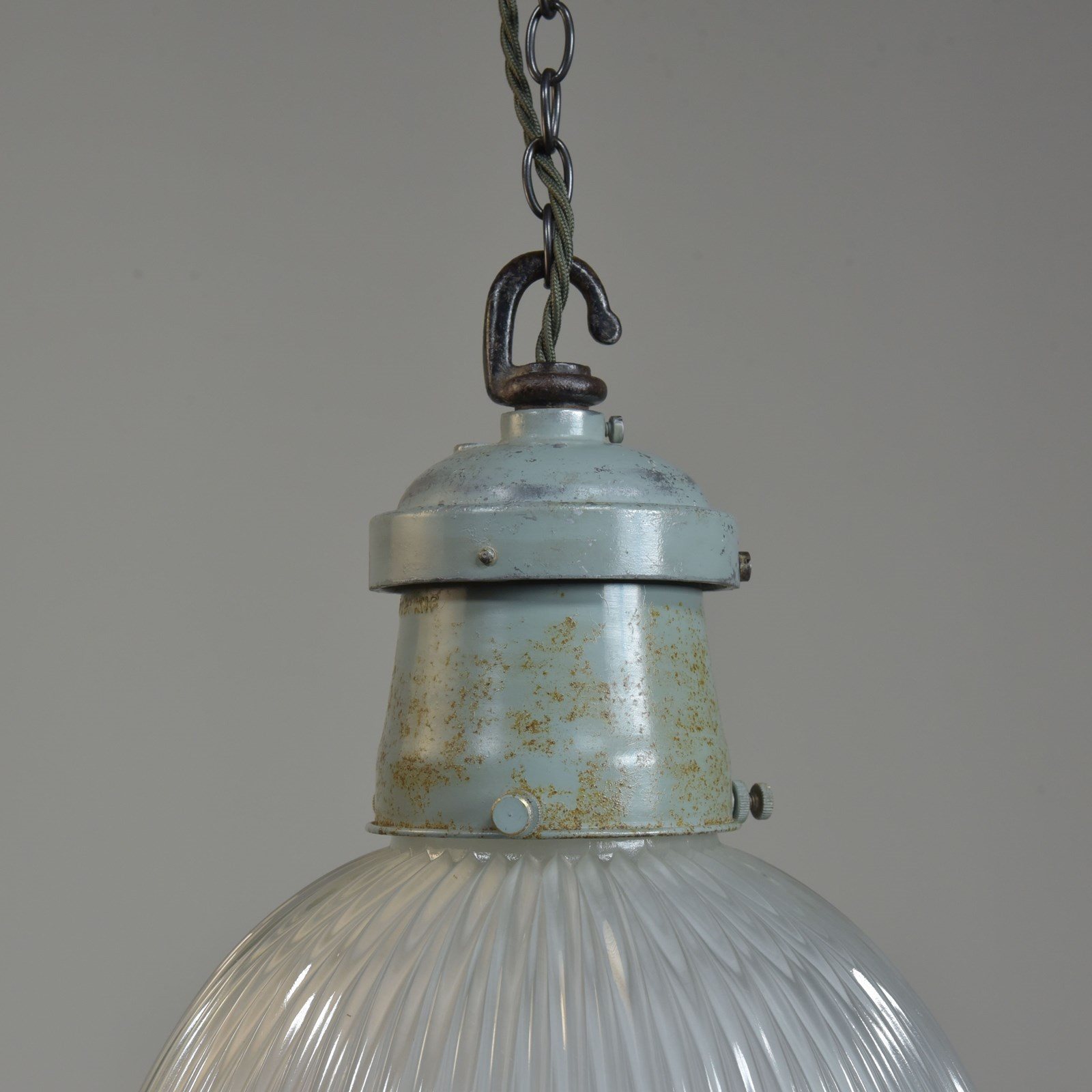 The glass and galleries marked Holophane. The glass cleaned, galleries taken apart and rubbed up retaining the original paint and double waxed.