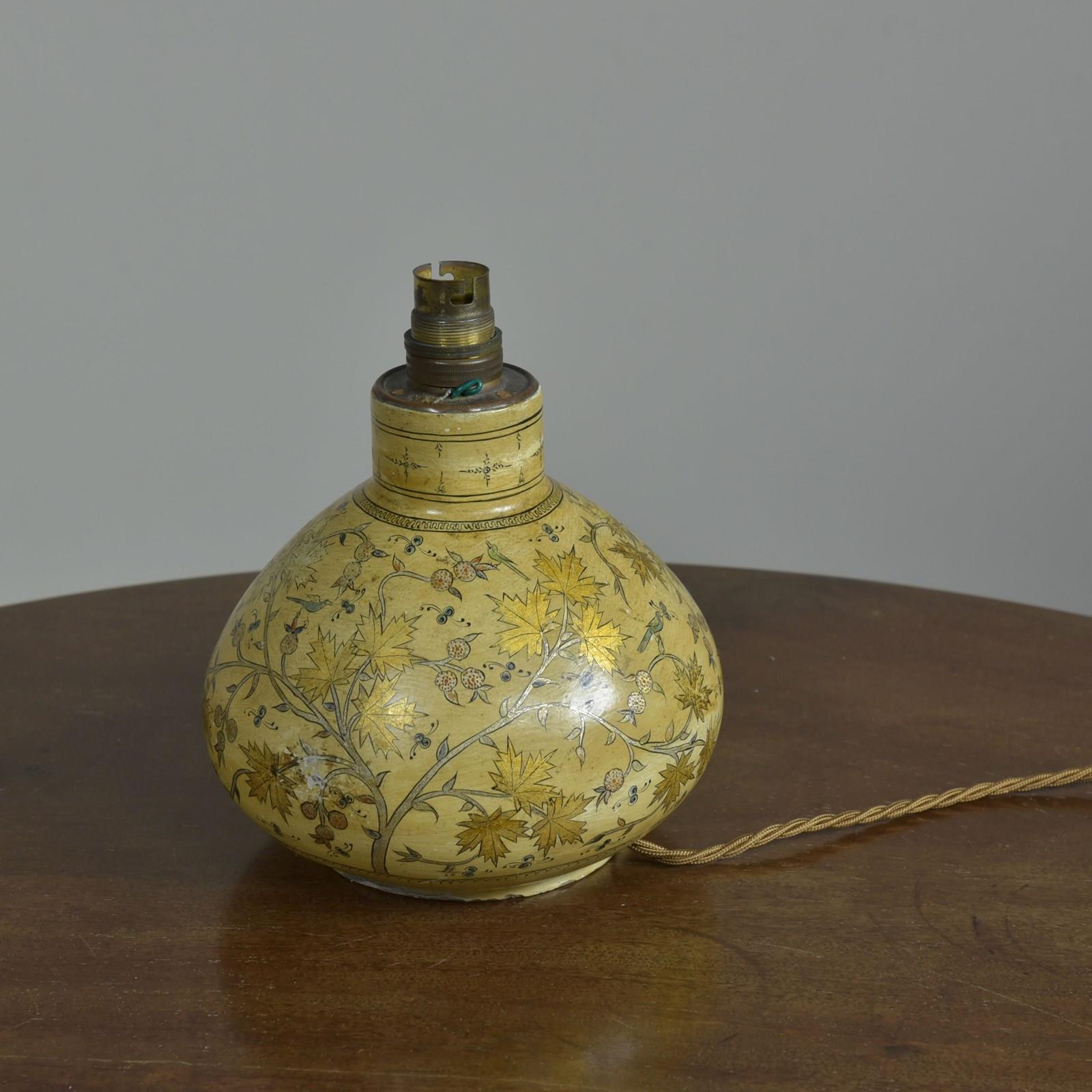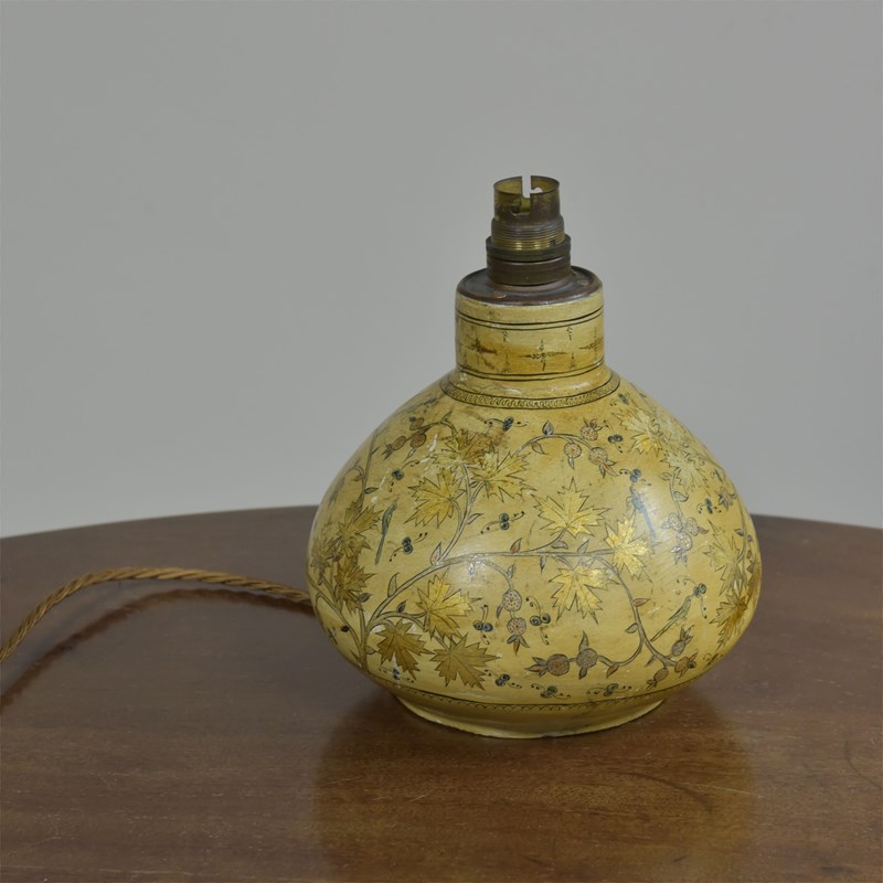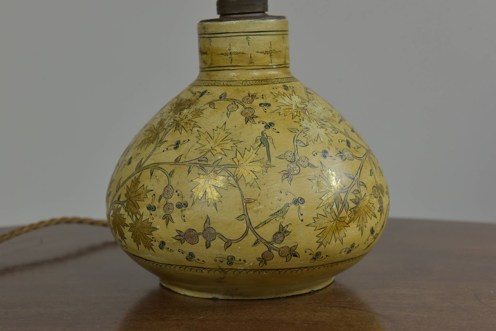 A small and charming papier mache table lamp painted with foliage and birds on a pale ochre ground. Kashmir, first half 20th century.