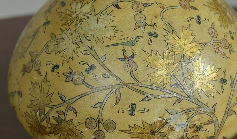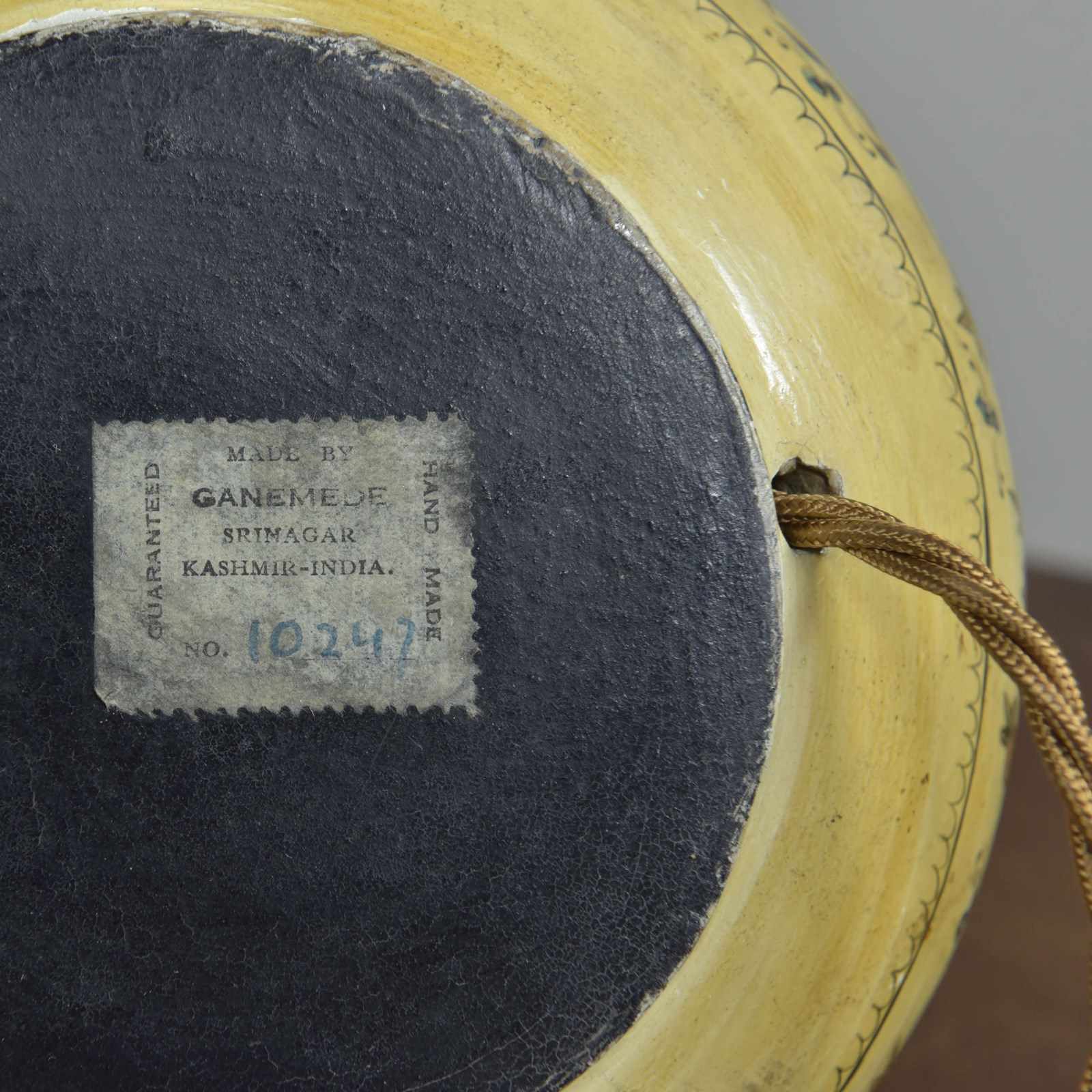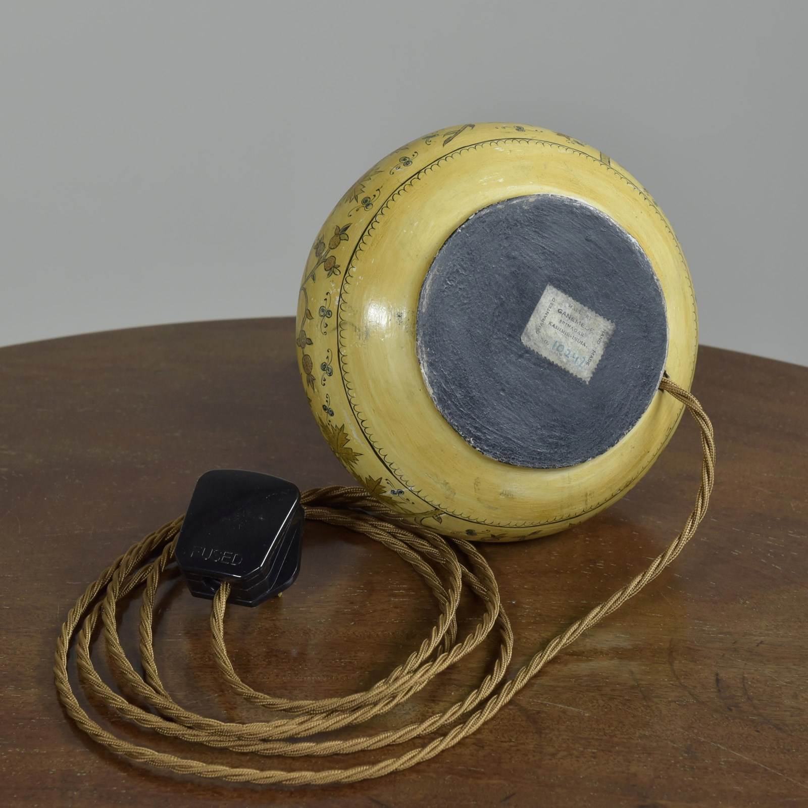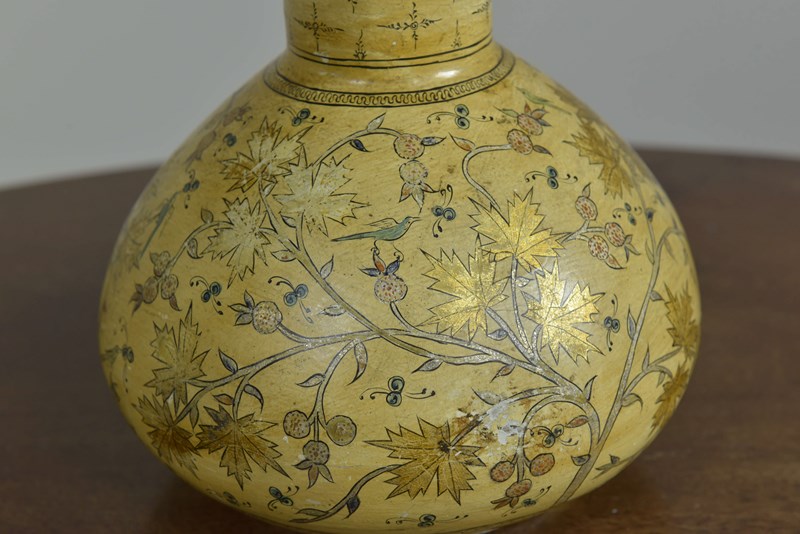 A small and charming papier mache table lamp painted with foliage and birds on a pale ochre ground. Kashmir, first half 20th century.
