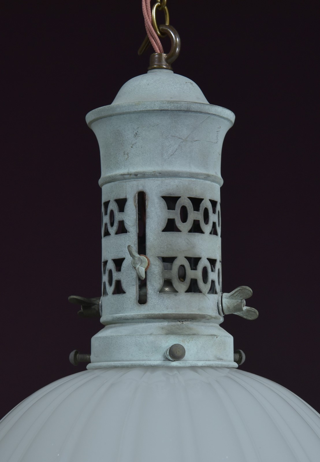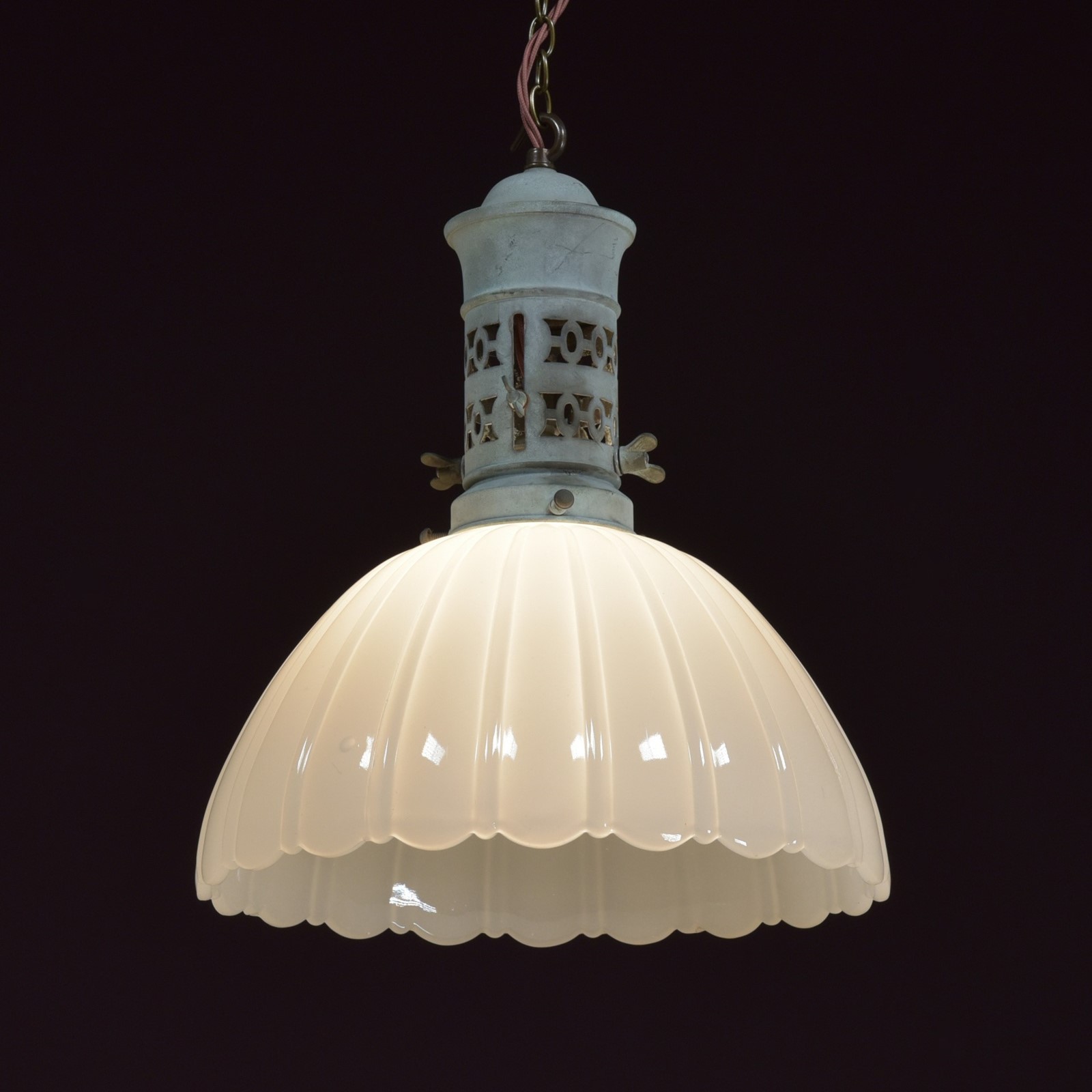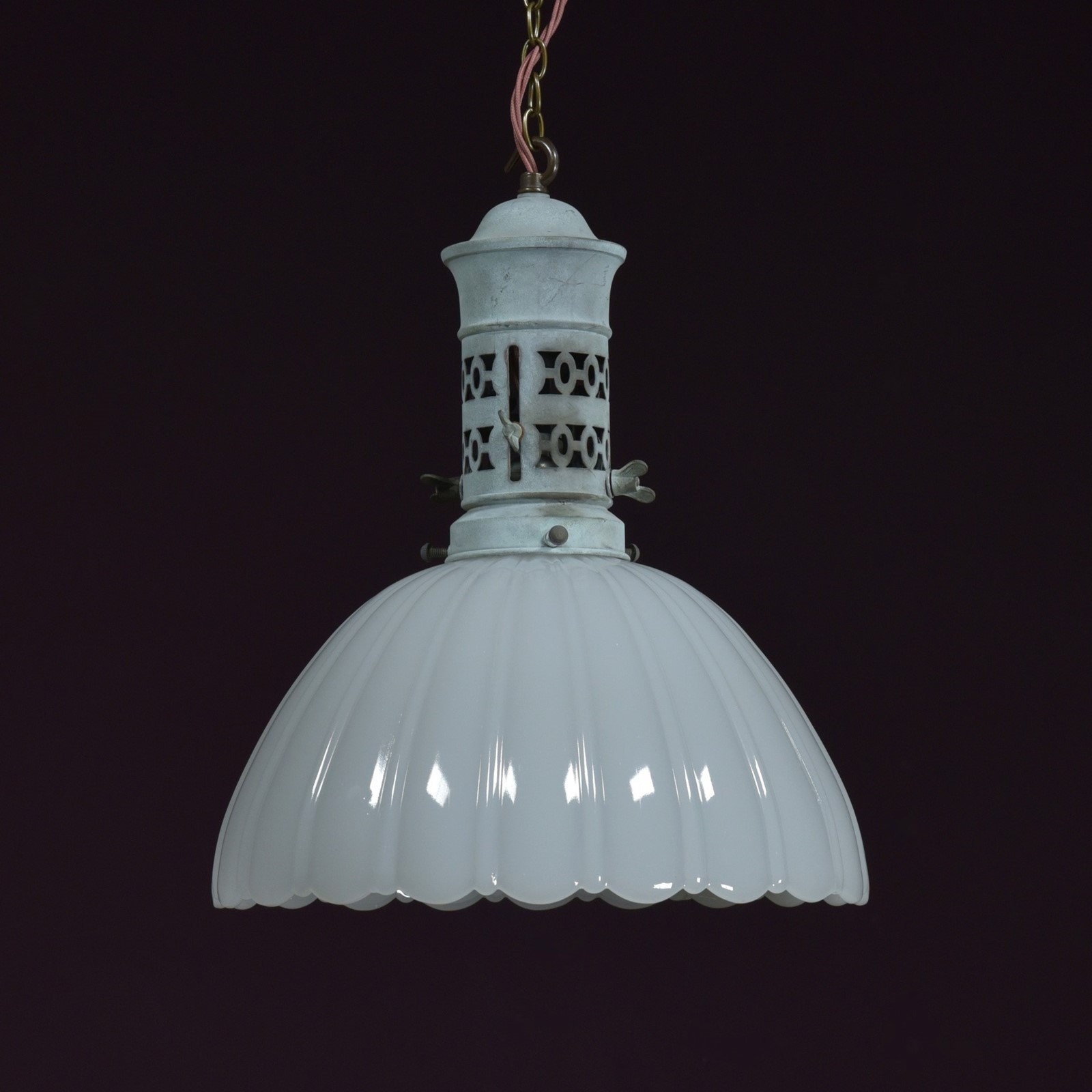 A large and heavy antique moonstone pendant light possibly by Jefferson. High quality, the similar (early 20th century) period nickel plated brass gallery having a great verdigris patina built up over many decades. The gallery has an adjustable (original) lampholder that can move up and down within the gallery to adjust the beam angle and/or place the bulb in a perfect position. Rewired with 1.5 meter rose pink fabric flex, the original lampholder and a new antiqued brass hook. Dimensions in inches/cm; 14.5"/37cm tall including hook. The shade is 12.5"/32cm in diameter.