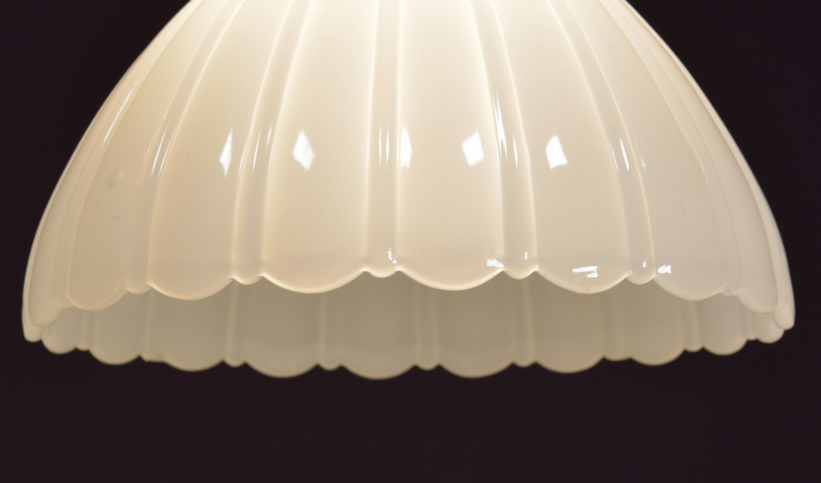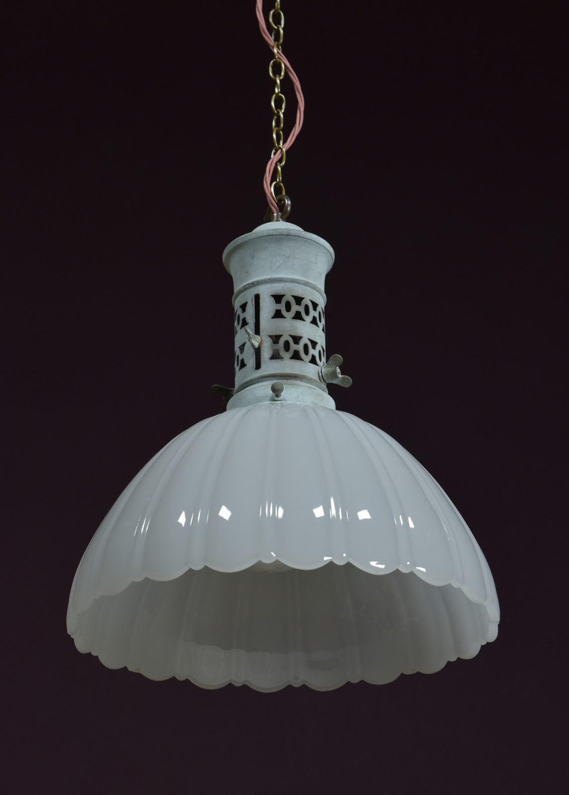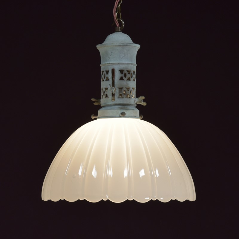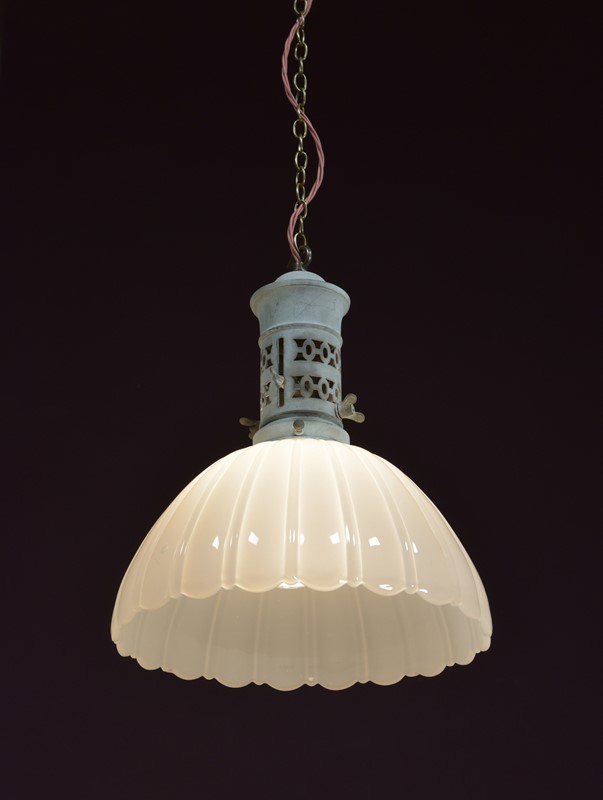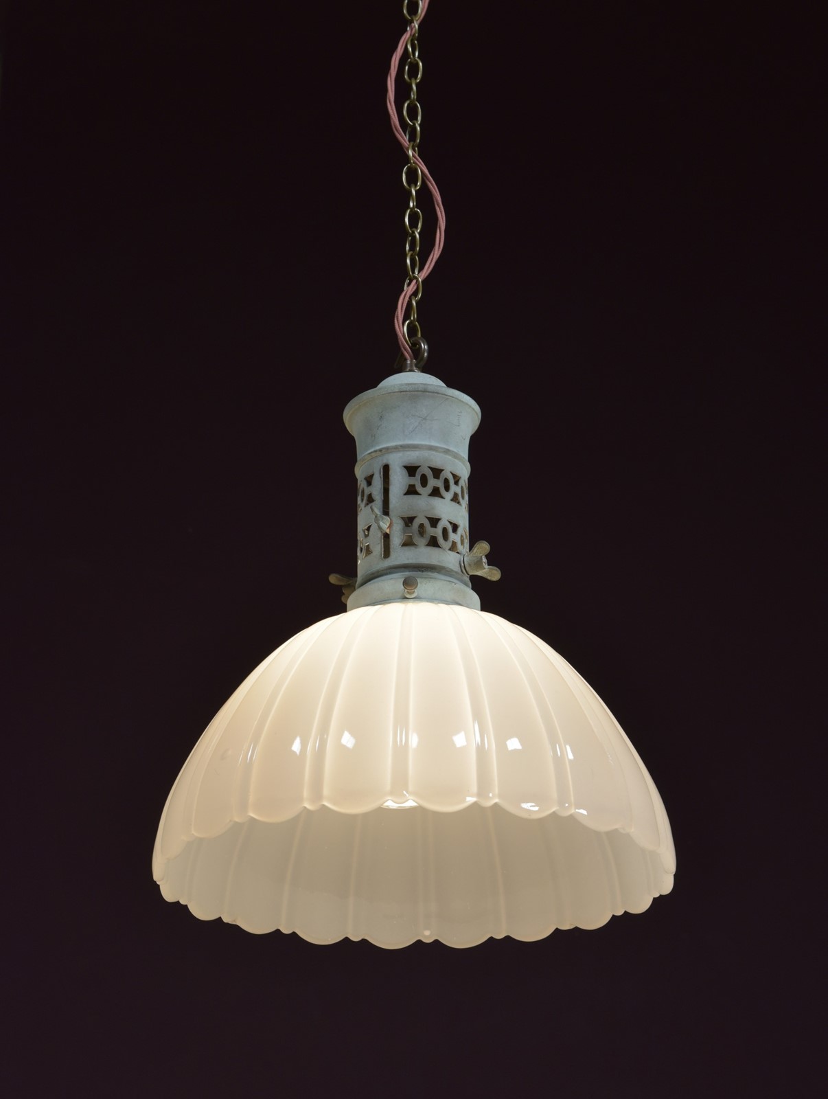 A large and heavy antique moonstone pendant light possibly by Jefferson. High quality, the similar (early 20th century) period nickel plated brass gallery having a great verdigris patina built up over many decades. The gallery has an adjustable (original) lampholder that can move up and down within the gallery to adjust the beam angle and/or place the bulb in a perfect position. Rewired with 1.5 meter rose pink fabric flex, the original lampholder and a new antiqued brass hook. Dimensions in inches/cm; 14.5"/37cm tall including hook. The shade is 12.5"/32cm in diameter.