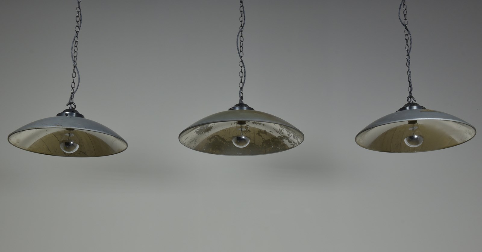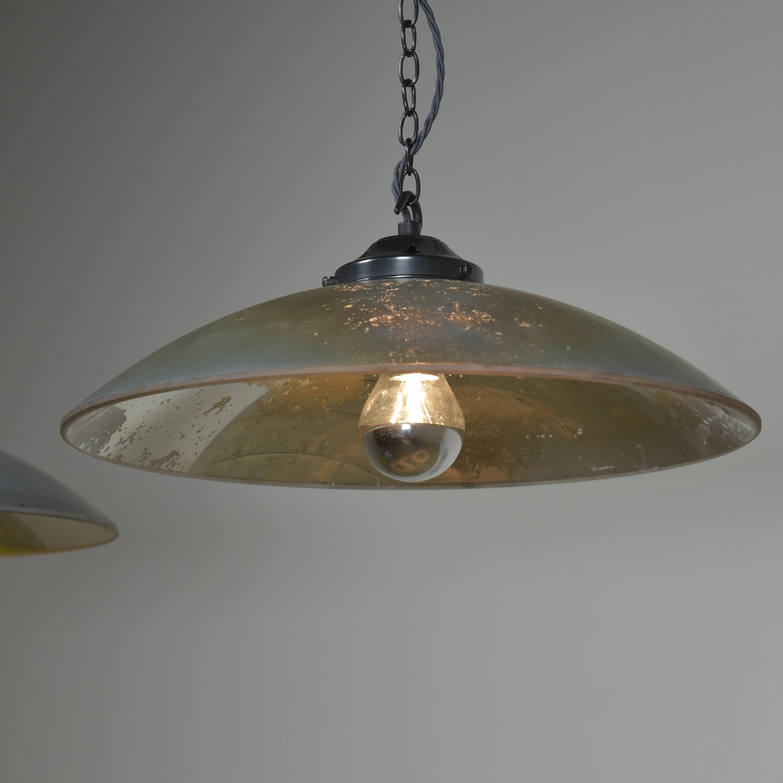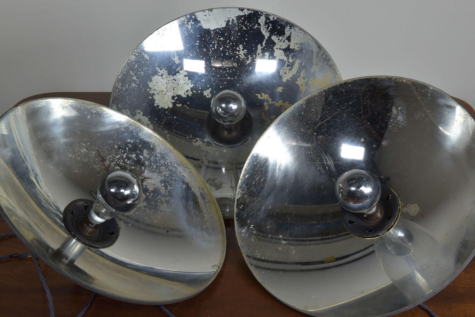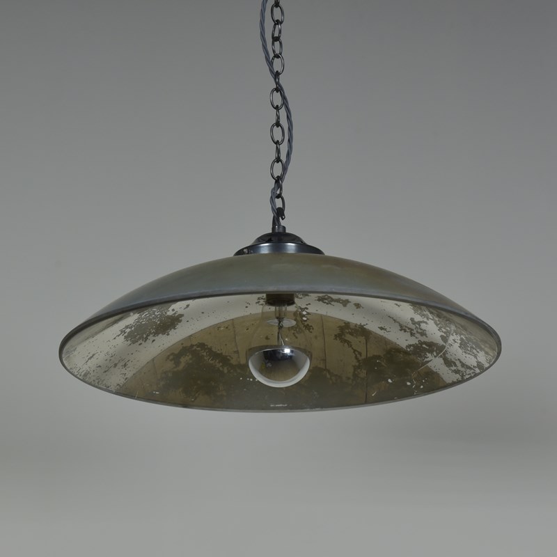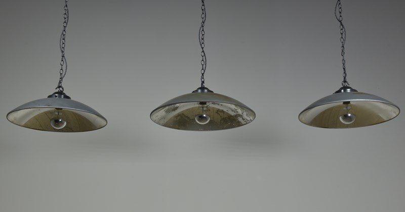 Large concave mirrored glass saucer pendant shades. Three available (matching pair and a similar larger one).