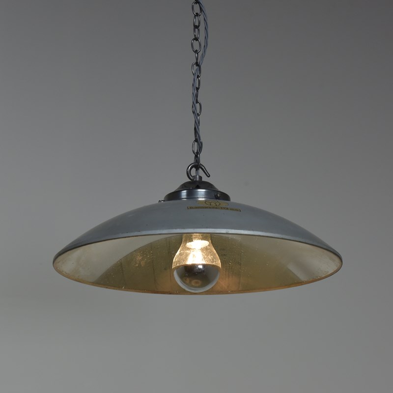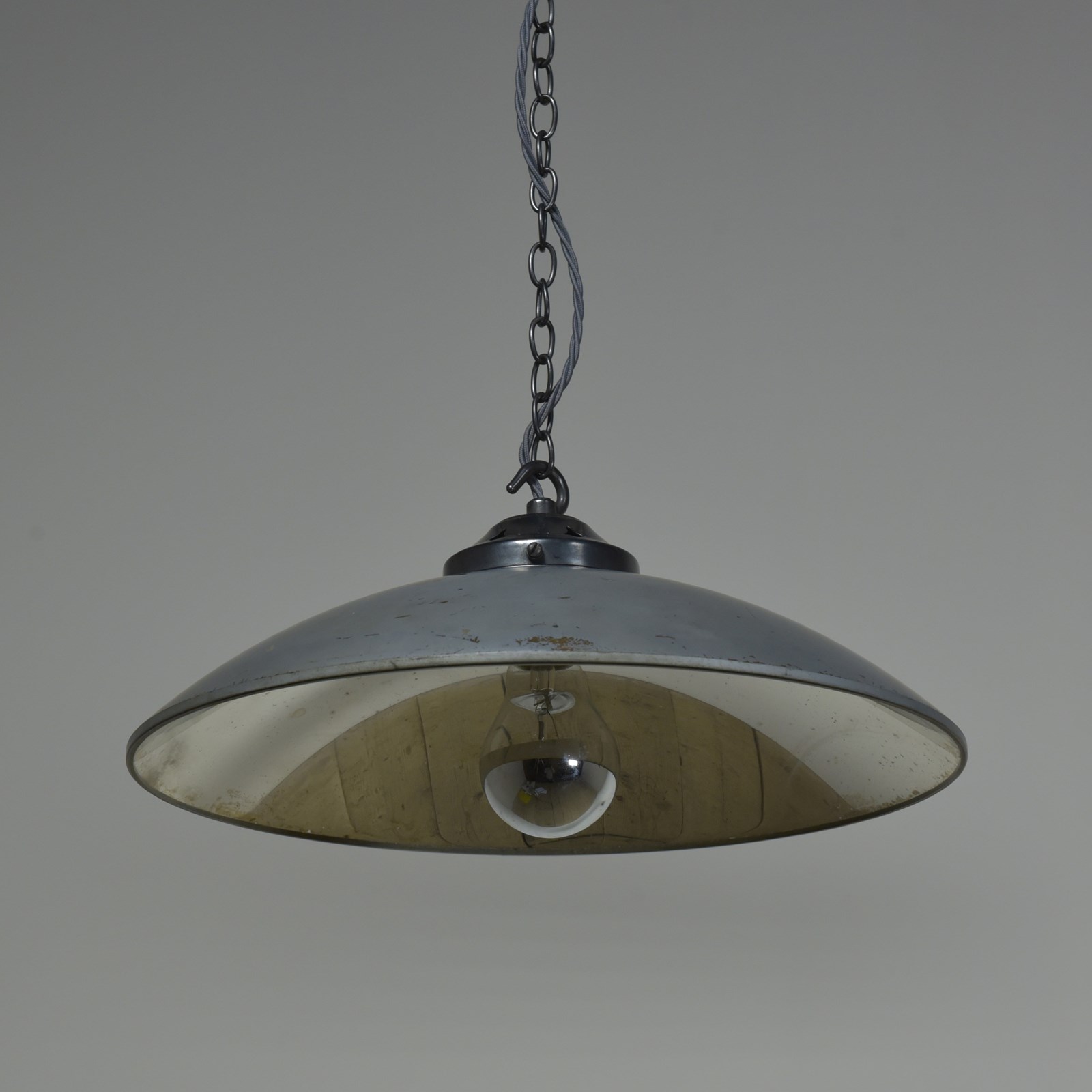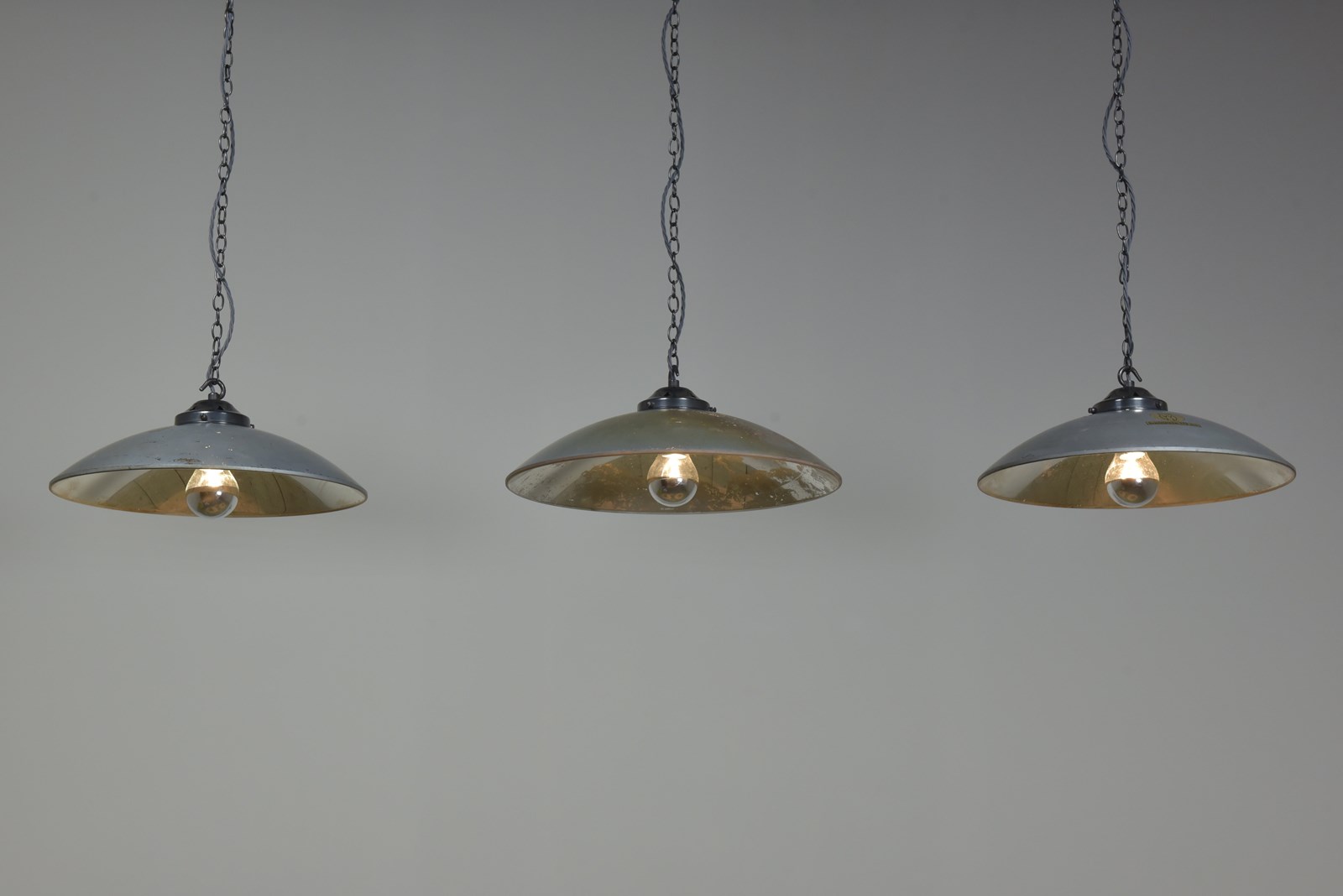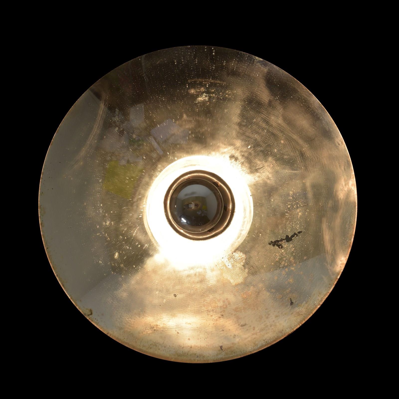 Large concave mirrored glass saucer pendant shades. Three available (matching pair and a similar larger one).
