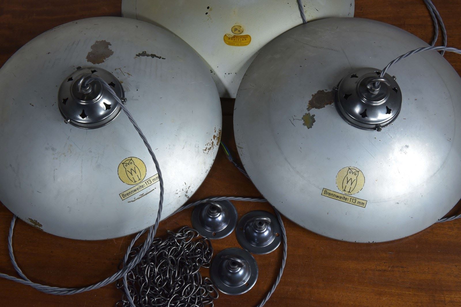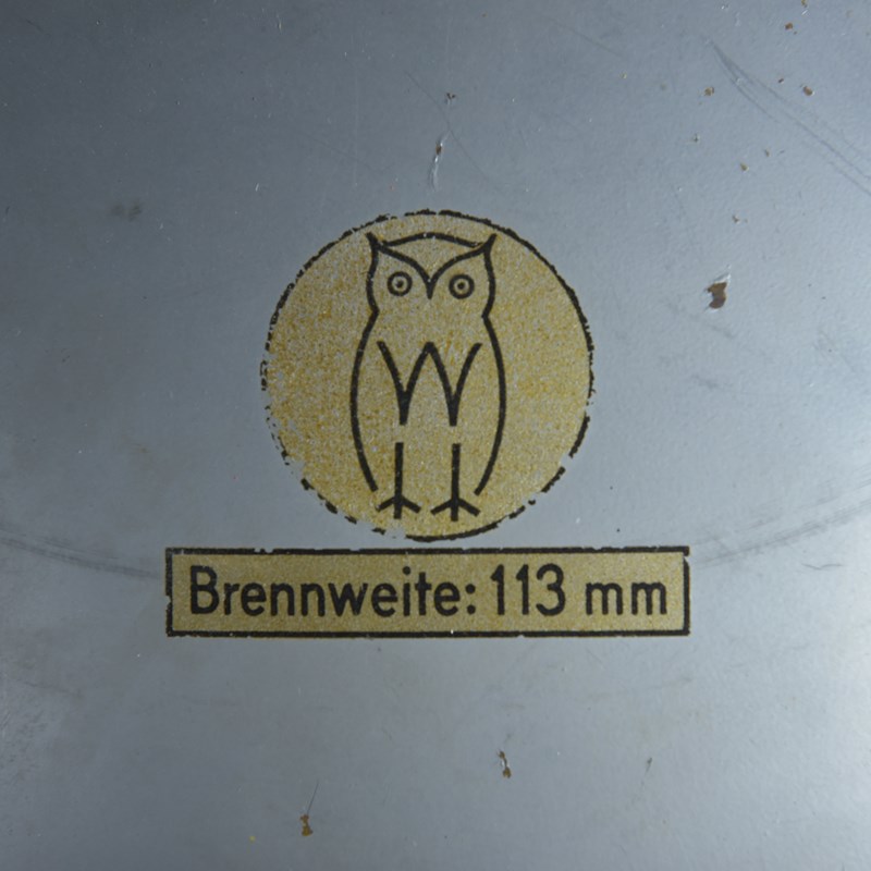 These are antique silvered concave glass shades, the silver protected by a layer of copper and then painted. Two with Owl / Brennweite labels and one with Soviclar France label.