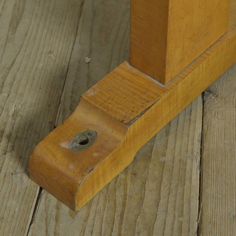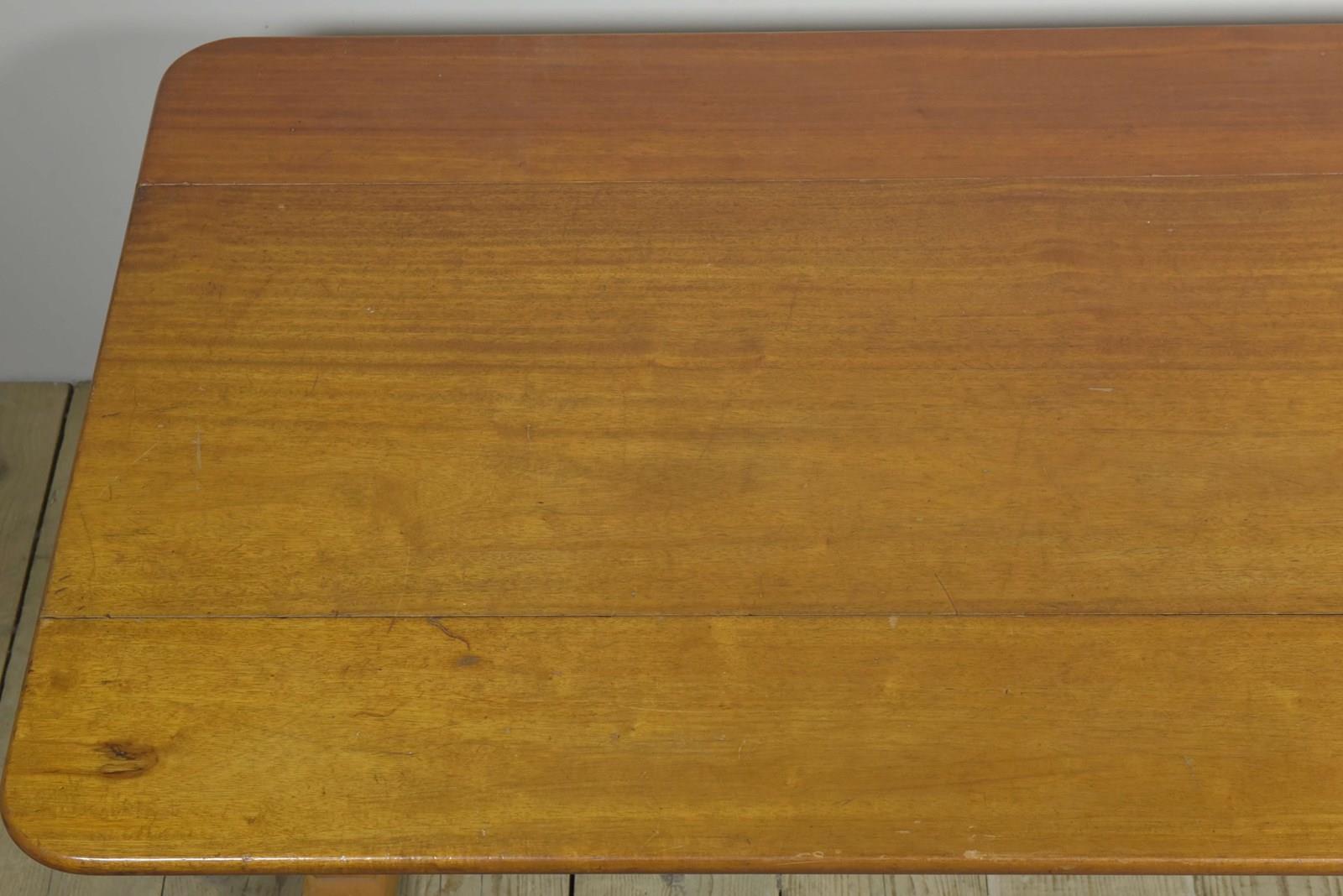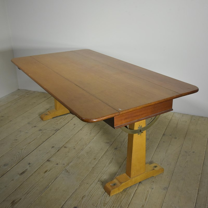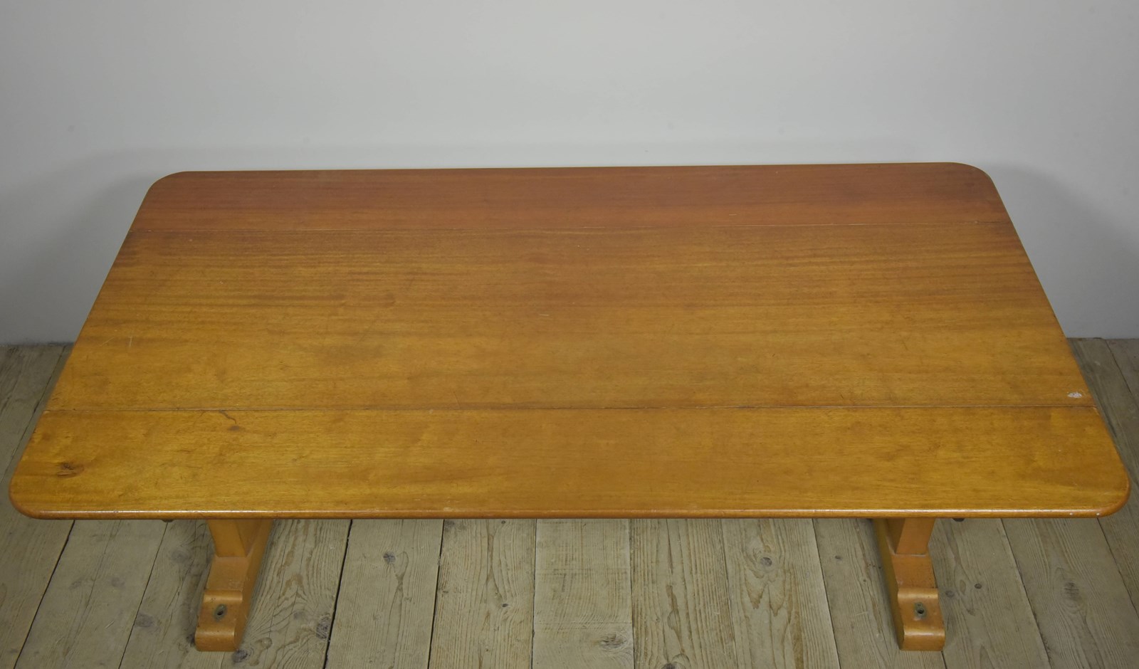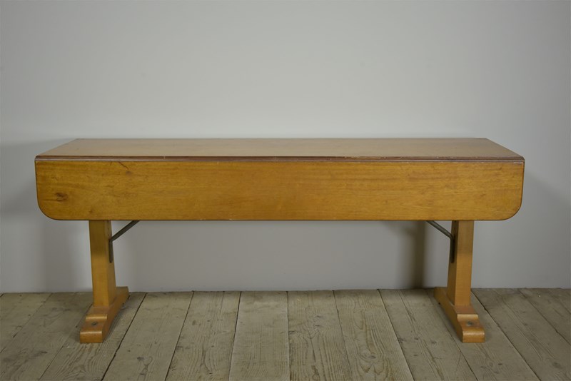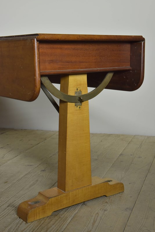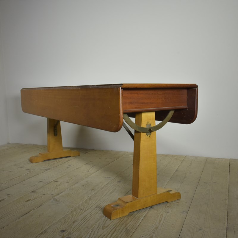 An unusual old ships / boats/ yachts table with a mahogany drop leaf top and maple trestle ended base and an iron stretcher.