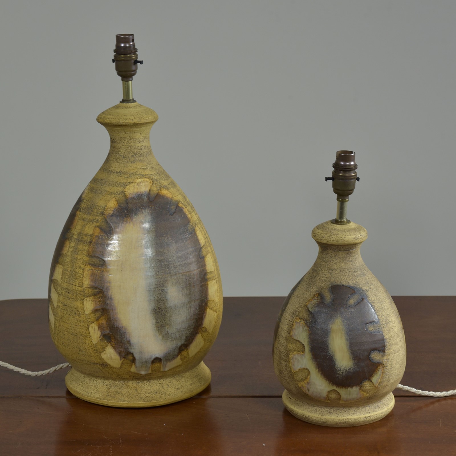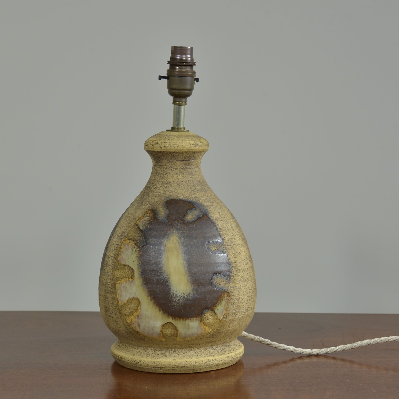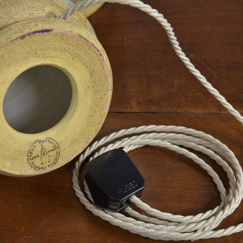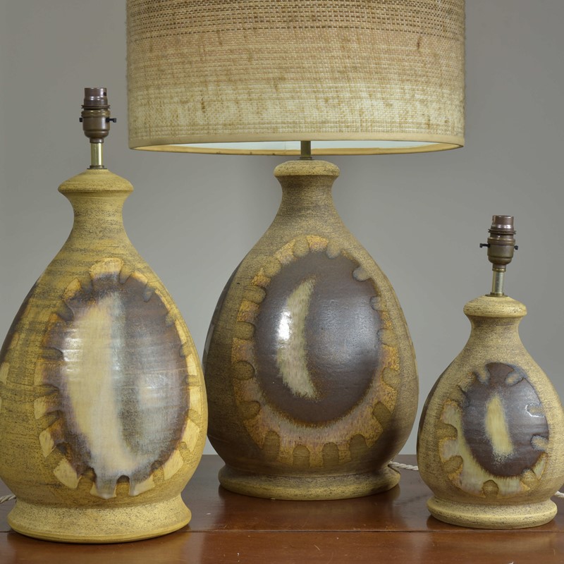 A small to medium vintage studio pottery / ceramic table lamp by Iden Pottery of Rye, Sussex c1975. Ovoid shape and decoration in soft glaze colours, perfect condition. This pottery was stocked by Harrods and Heals in the 1960s and 70s. Please note; on the group shots this lamp is on the right hand side. All three are currently available (see separate ads / pages). Rewired with a new brass safety-switched lampholder, 2.5 meters "linen" fabric flex and a traditional hard plastic plug. Pat tested. Dimensions in inches/cms; The base not including the stem or lampholder is 13.5"/34cm tall including lampholder. Base diameter is 7"/18cm max. 2.0kg. Labelled to base ( Iden Pottery, Hand Made, Rye, Sussex, England). Two similar model lamps also available. Both much larger larger, one with original shade.