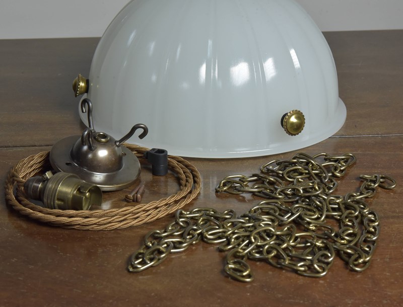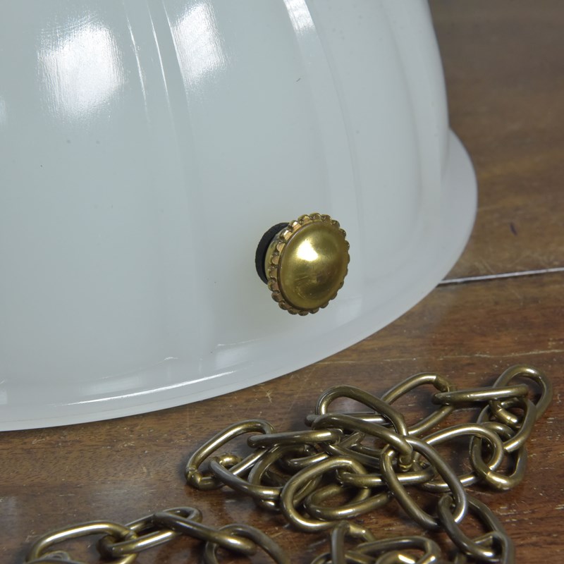 Supplied with patinated brass parts and solid brass chain (3 hooked ceiling plate with brass guide, earth, cordgrip, vintage slotted brass screws, 1.5m fabric flex with cordgrip/ BC lampholder, 3 x 38inch lengths chain). See detail photos.