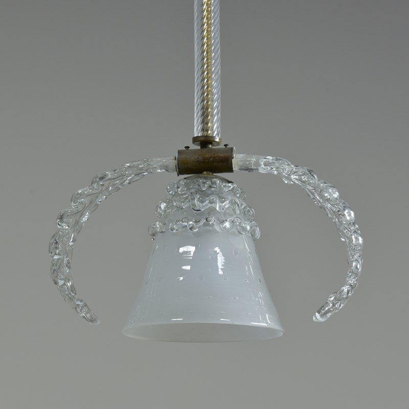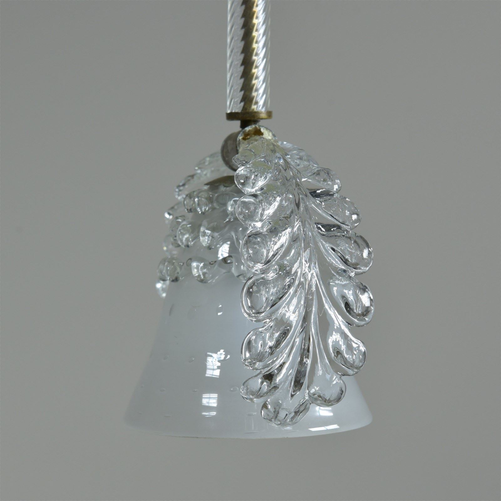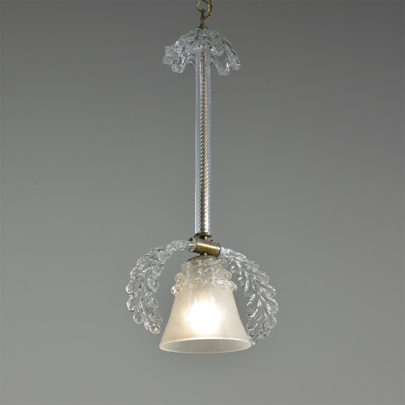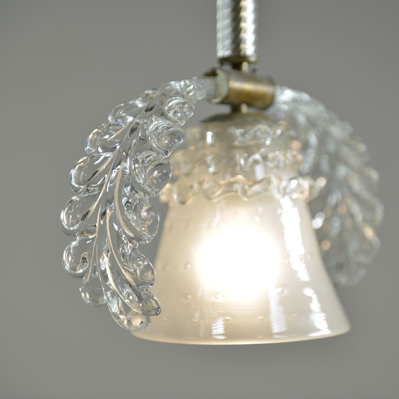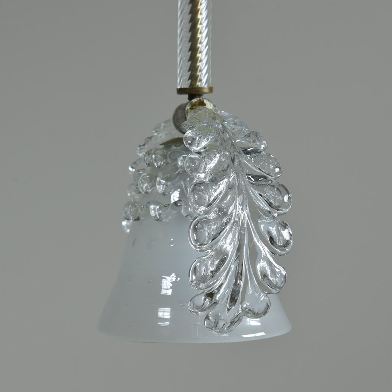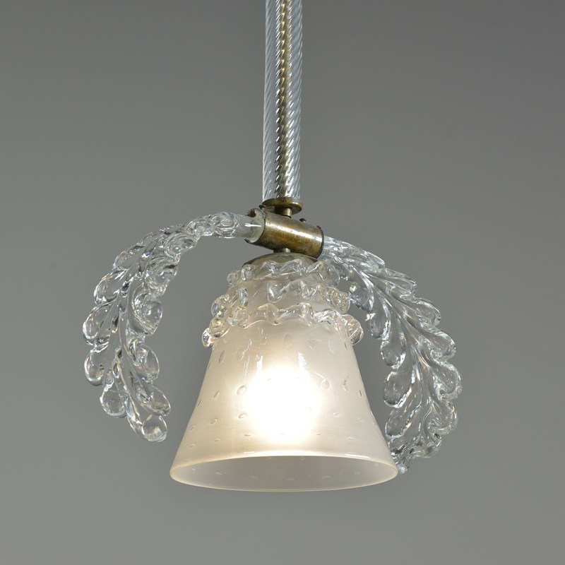 A 1950's -50's vintage Murano glass pendant light with bell shade flanked by two large glass leaves beneath a twisted glass tube stem and glass canopy.