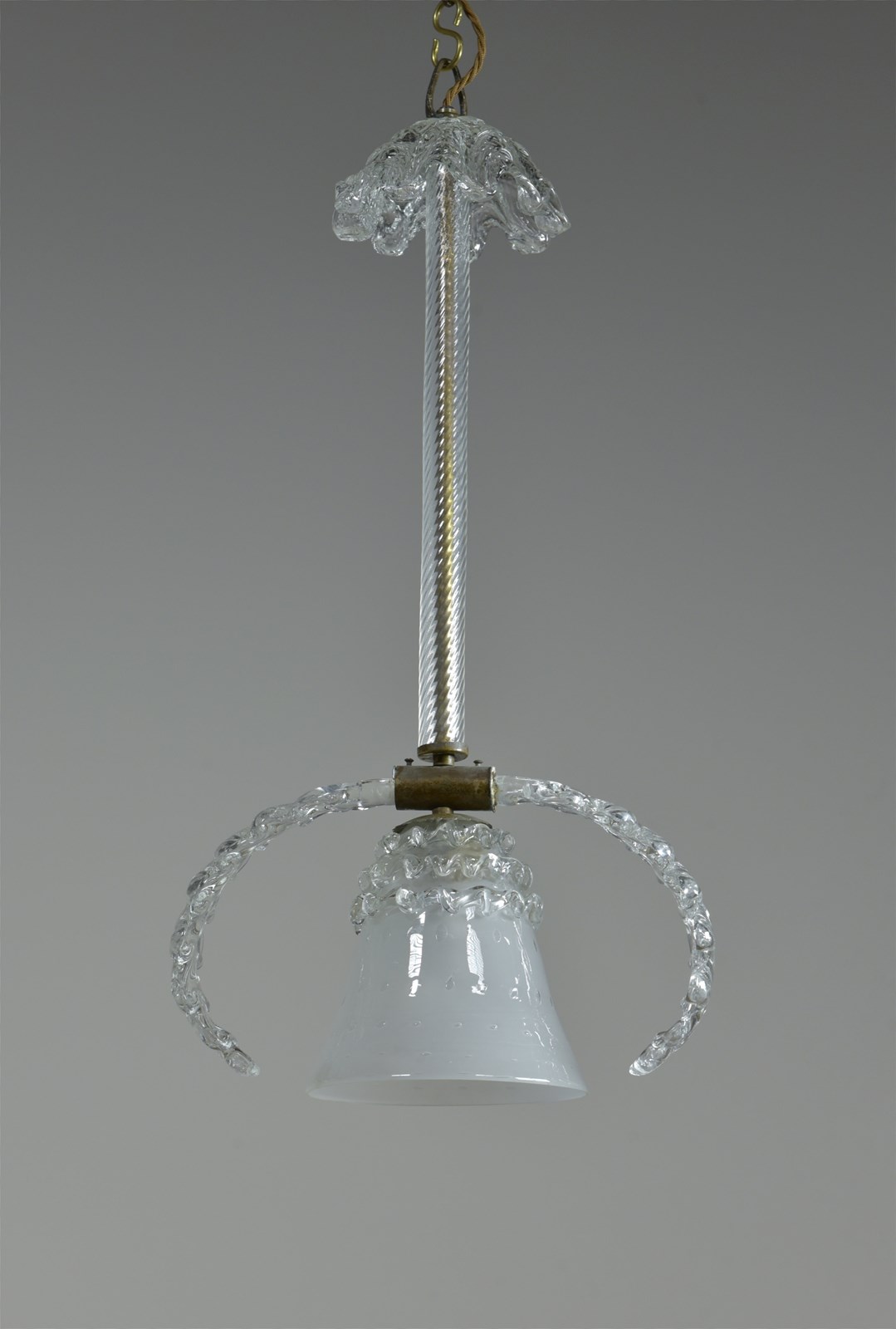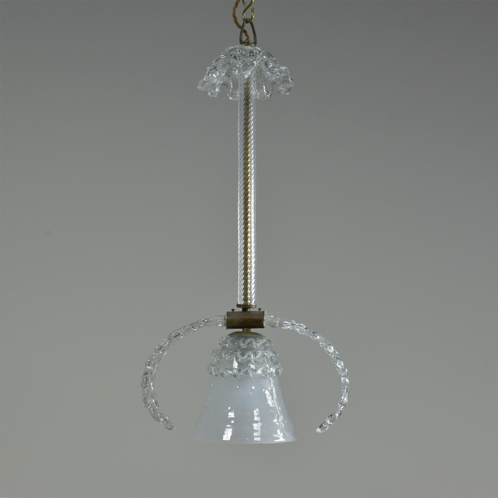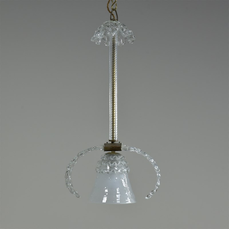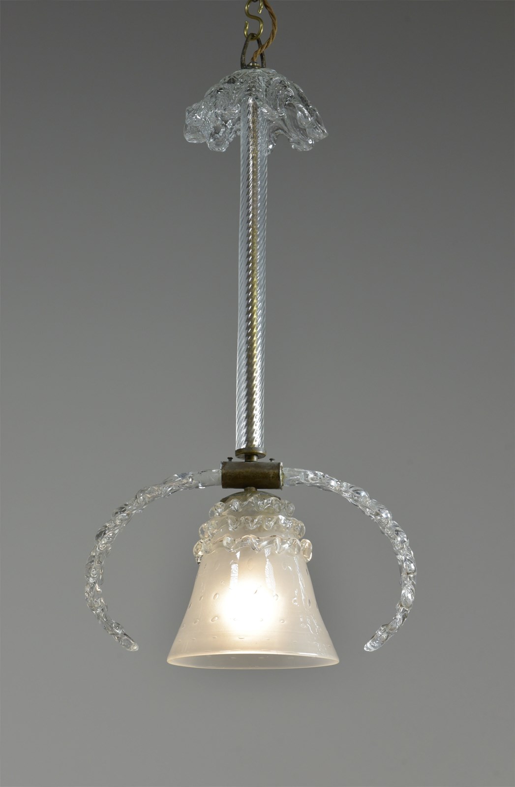A 1950's -50's vintage Murano glass pendant light with bell shade flanked by two large glass leaves beneath a twisted glass tube stem and glass canopy.