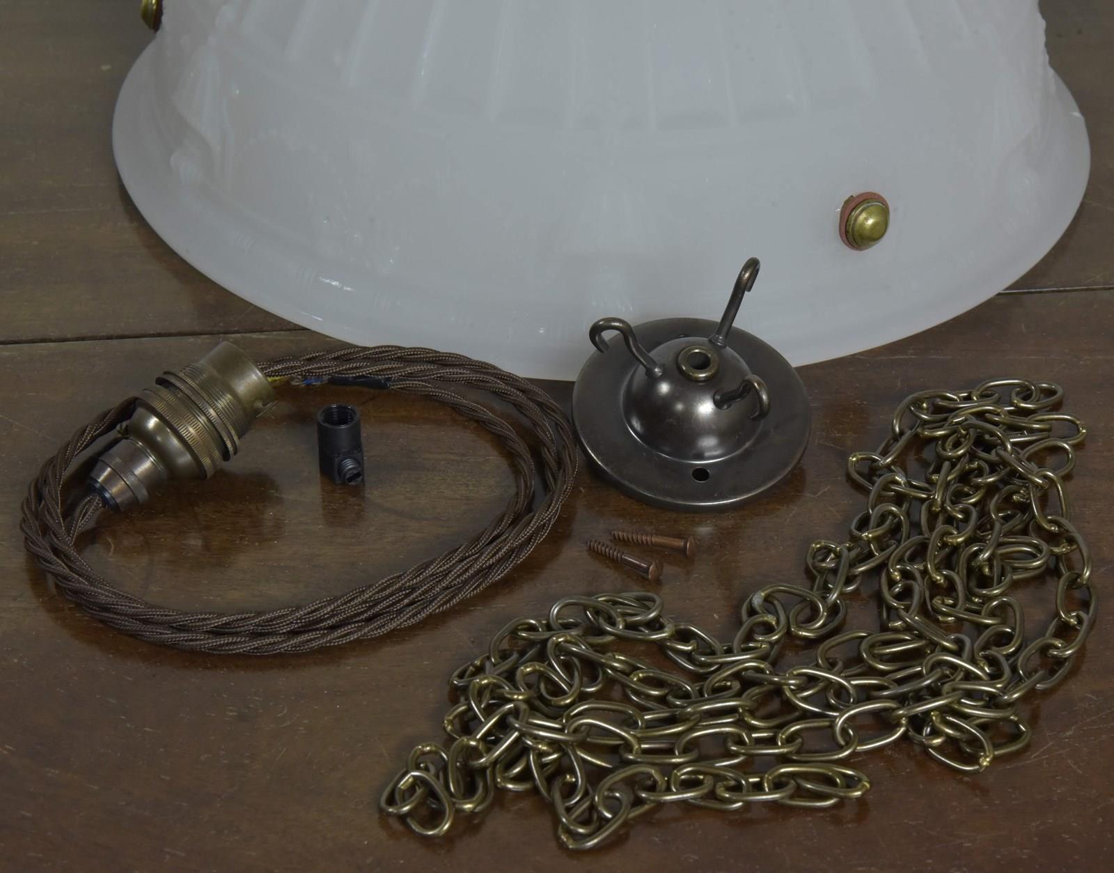 Wired with 1.25m fabric flex, patinated brass cordgrip/BC lampholder. Supplied with patinated 3 hook ceiling plate (inc brass cable guide, earth, screws, cordgrip) and patinated solid brass hanging chains.